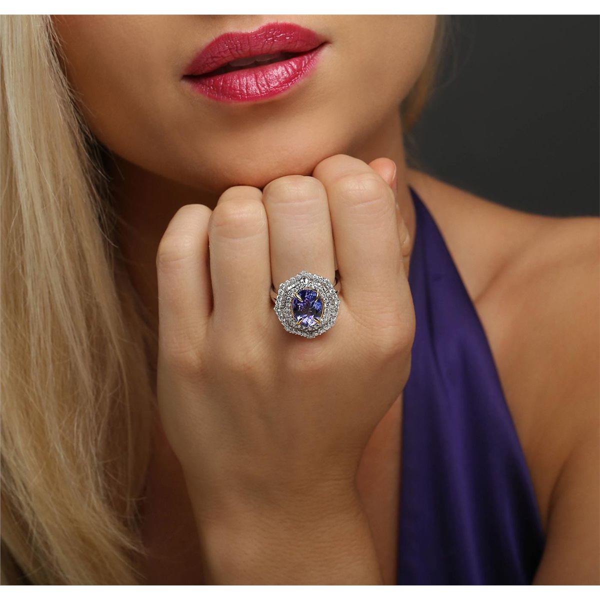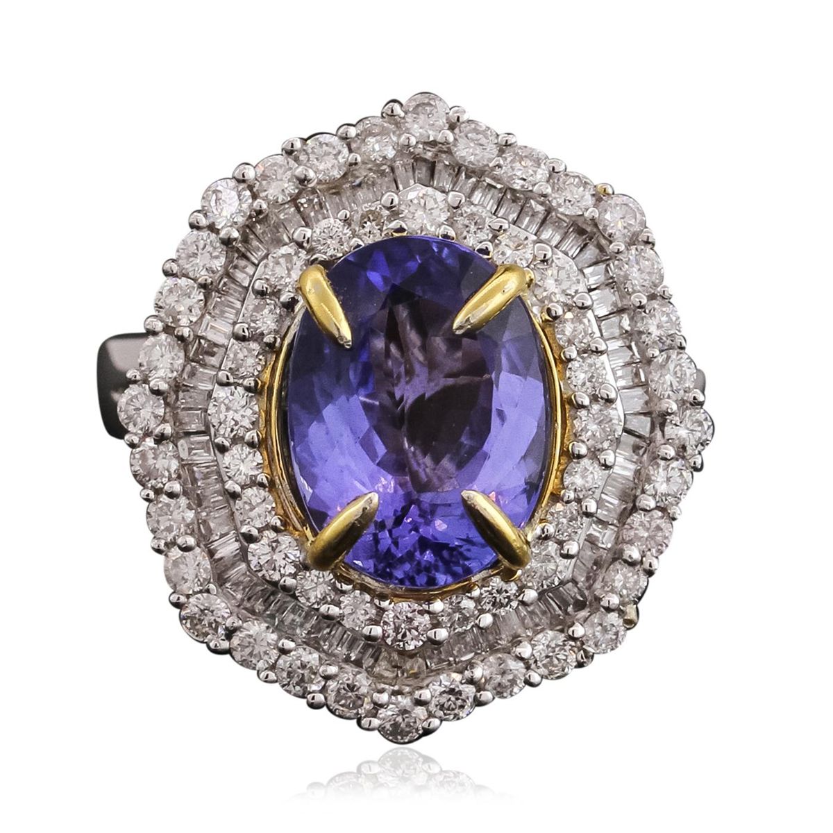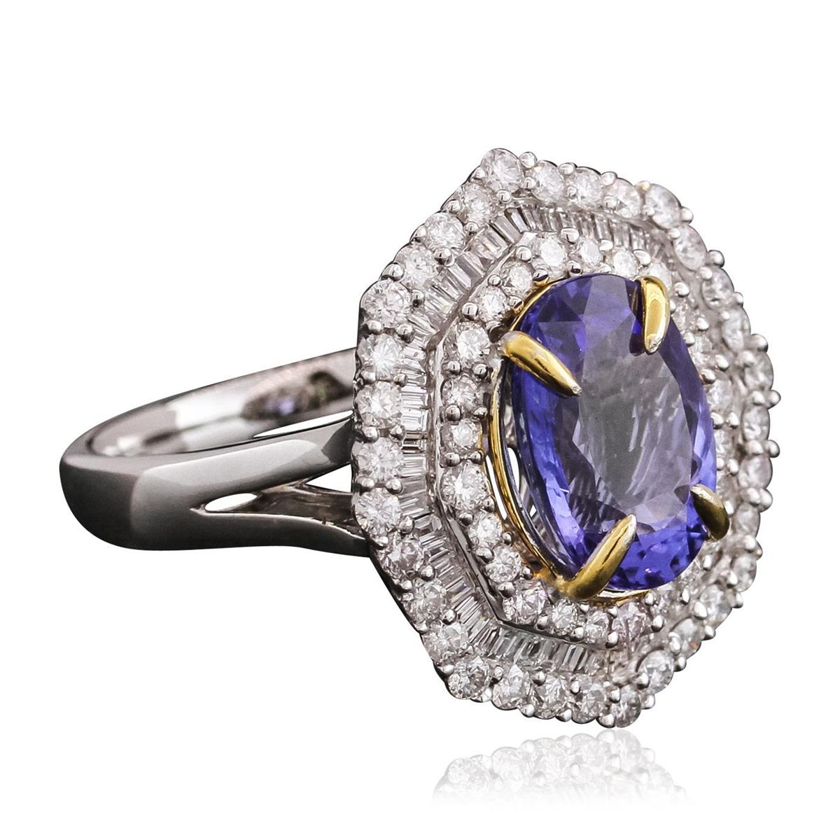 One electronically tested 14KT white and yellow gold ladies combination cast & assembled tanzanite and diamond ring with a split shank with a bright polish finish. Identified with markings of "14K". Condition is new. Containing: One prong set oval modified brilliant cut natural tanzanite, measuring 11.36 x 8.52 x 3.97mm, approximate weight of 2.63ct., clarity is eye clean, type I, medium, very slightly grayish, violet color, (GIA V 5/3), cut is good. Fifty-Six prong set round brilliant cut diamonds, measuring 1.70 - 1.30 x 0.90mm (depth est.) approximate total weight of 56 Stones = 0.69ct. Clarity: SI-2 to I-2. Color: I - J, Cut is Good. Fifty-Six channel set baguette cut diamonds, measuring 1.30 x 1.10 x 0.94mm (depth est.) approximate total weight of 56 Stones = 0.69ct. Clarity: SI-1. Color: H - I, Cut is Good. Colored gemstones are presumed to have been subjected to commonly used enhancement processes. All diamonds and colored gemstones are graded in the mounting, unless otherwise stated total weight of Colored Stones 2.63ct. Total Weight of Diamonds 1.38ct. Total Weight of Ring 6.40 grams. GGL Appraised at $9,200.00.