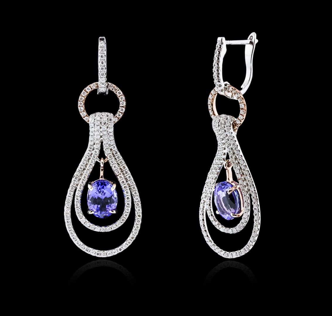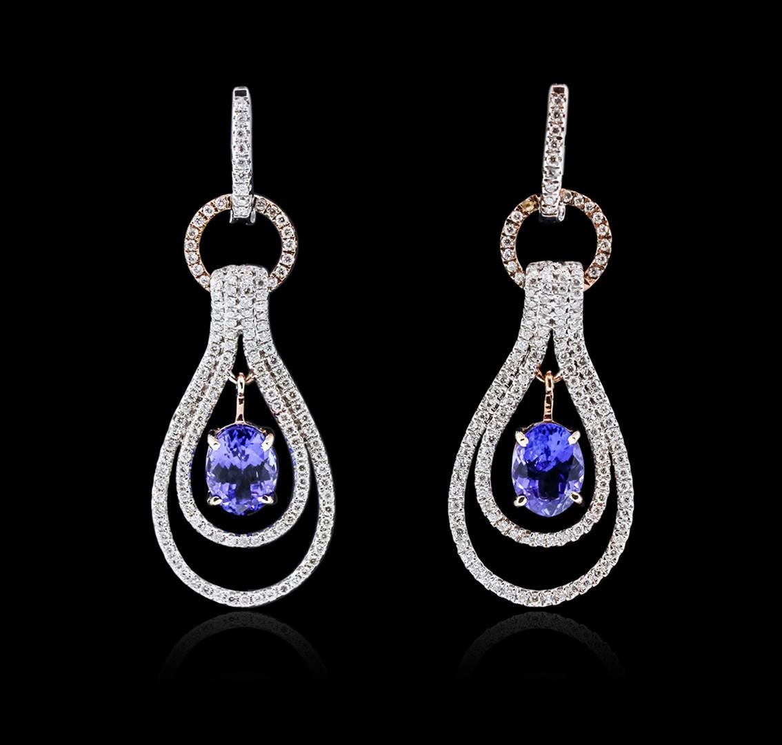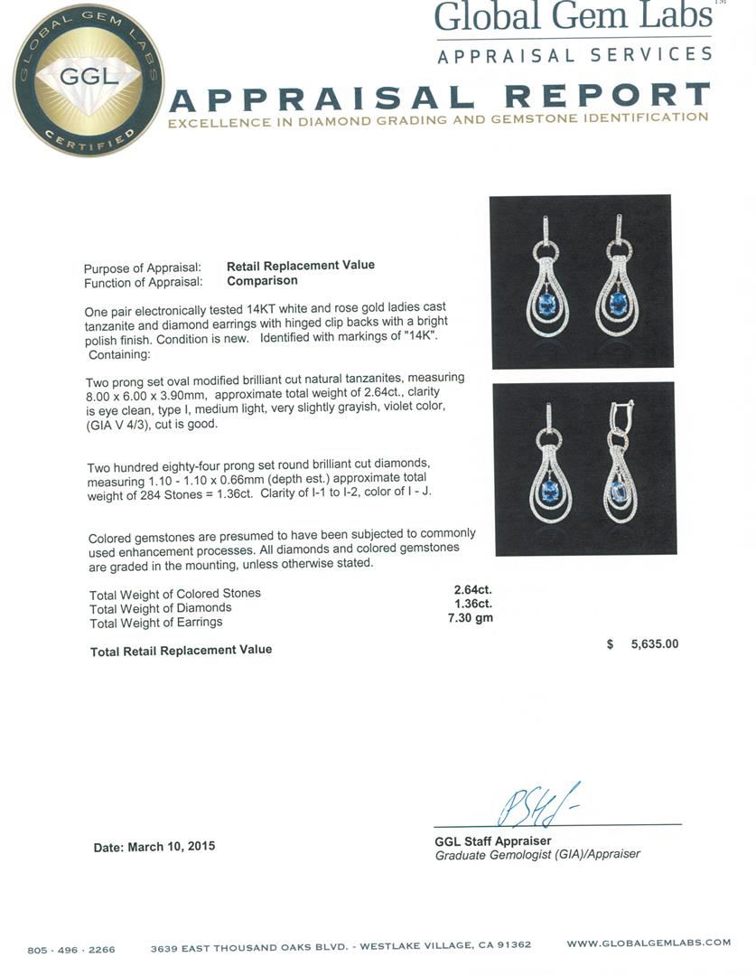 One pair electronically tested 14KT white and rose gold ladies cast tanzanite and diamond earrings with hinged clip backs with a bright polish finish. Identified with markings of "14K". Condition is new. Containing: Two prong set oval modified brilliant cut natural tanzanites, measuring 8.00 x 6.00 x 3.90mm, approximate total weight of 2.64ct., clarity is eye clean, type I, medium light, very slightly grayish, violet color, (GIA V 4/3), cut is good. Two Hundred Eighty-Four prong set round brilliant cut diamonds, measuring 1.10 - 1.10 x 0.66mm (depth est.) approximate total weight of 284 Stones = 1.36ct. Clarity: I-1 to I-2. Color: I - J. Colored gemstones are presumed to have been subjected to commonly used enhancement processes. All diamonds and colored gemstones are graded in the mounting, unless otherwise stated. Total Weight of Colored Stones 2.64ct. Total Weight of Diamonds 1.36ct. Total Weight of Earrings 7.30 grams. GGL Appraised at $5,635.00.