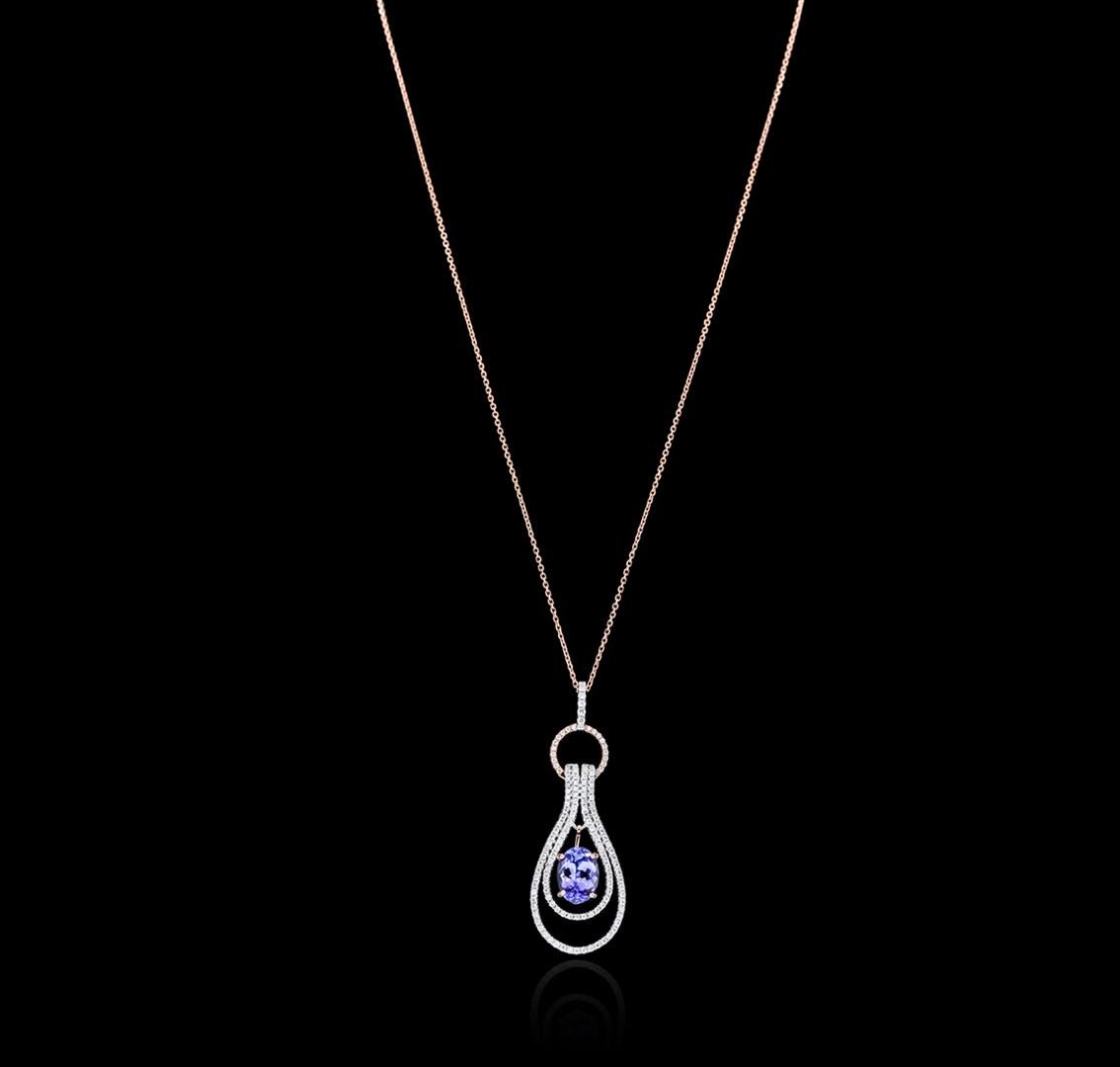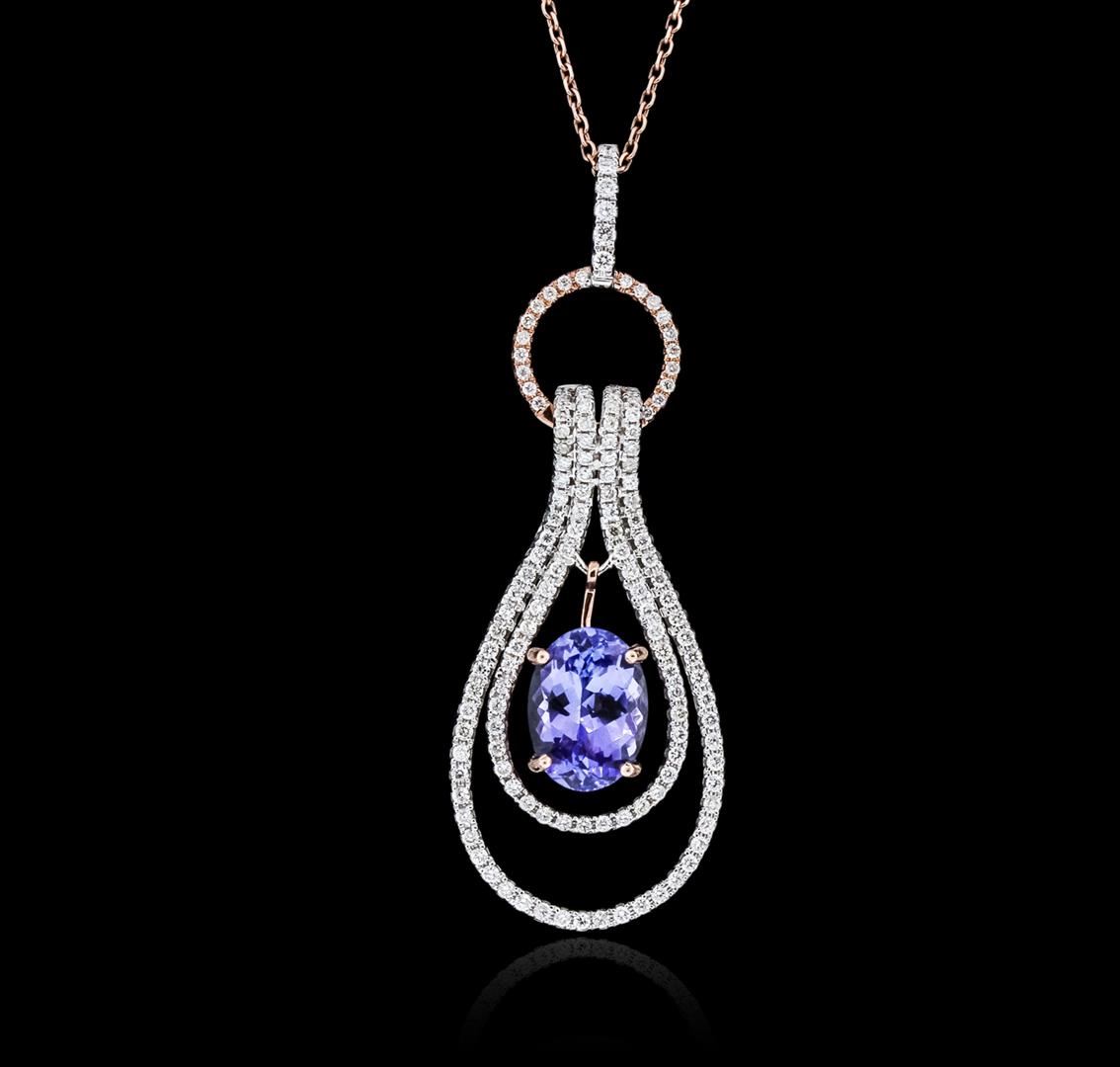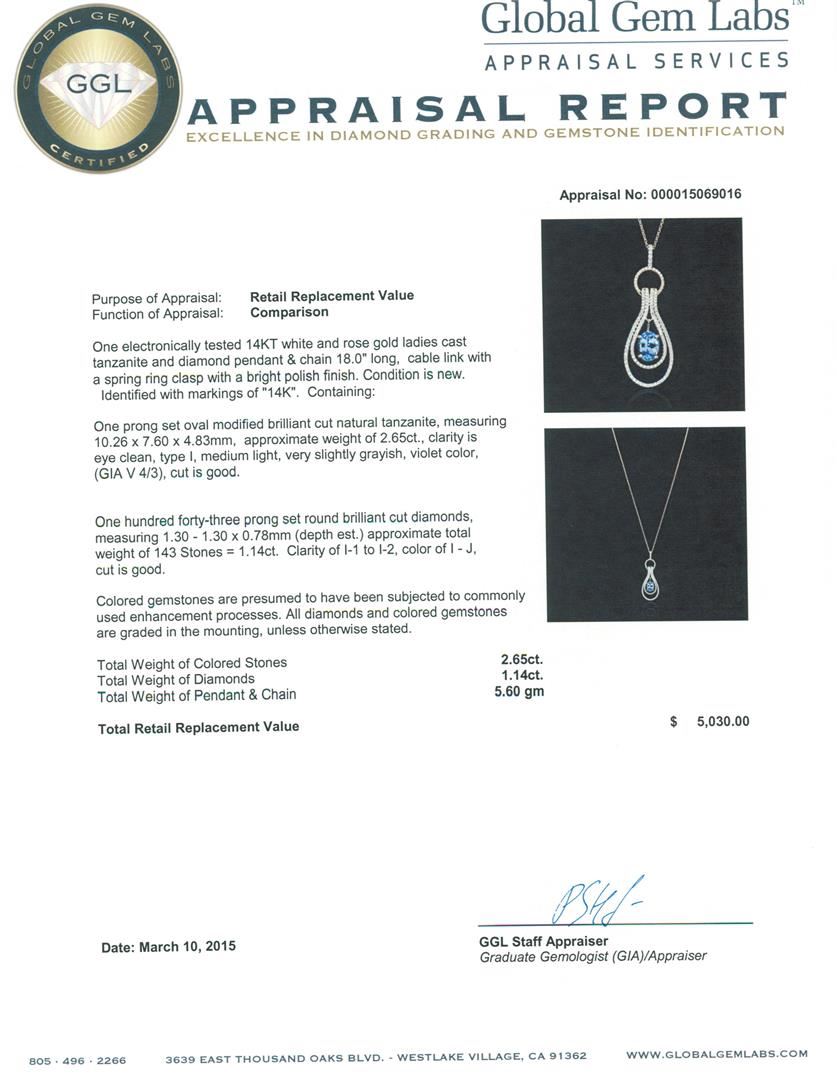 One electronically tested 14KT white and rose gold ladies cast tanzanite and diamond pendant & chain 18.0" long, cable link with a spring ring clasp with a bright polish finish. Identified with markings of "14K". Condition is new. Containing: One prong set oval modified brilliant cut natural tanzanite, measuring 10.26 x 7.60 x 4.83mm, approximate weight of 2.65ct., clarity is eye clean, type I, medium light, very slightly grayish, violet color, (GIA V 4/3), cut is good. One Hundred Forty-Three prong set round brilliant cut diamonds, measuring 1.30 - 1.30 x 0.78mm (depth est.) approximate total weight of 143 Stones = 1.14ct. Clarity: I-1 to I-2. Color: I - J, Cut is Good. Colored gemstones are presumed to have been subjected to commonly used enhancement processes. All diamonds and colored gemstones are graded in the mounting, unless otherwise stated. Total Weight of Colored Stones 2.65ct. Total Weight of Diamonds 1.14ct. Total Weight of Pendant & Chain 5.60 grams. GGL Appraised at $5,030.00.