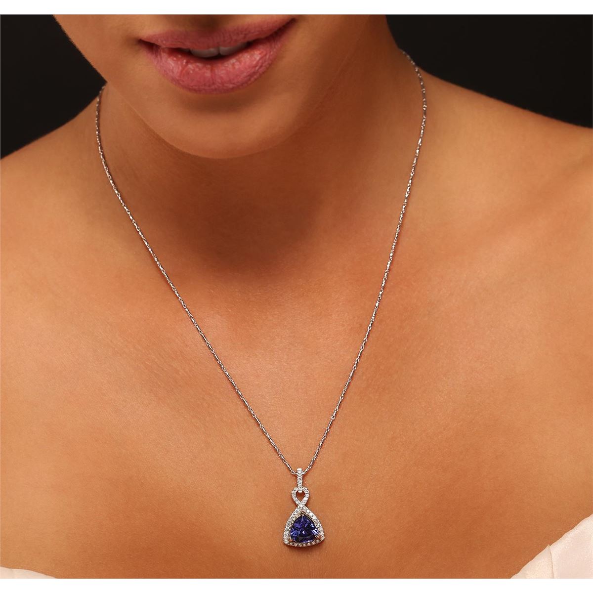 One electronically tested 14KT white and yellow gold Ladies pendant & chain 17.5" long, medium fancy cable link with a lobster claw clasp with a bright polish finish. Condition is new. Identified with markings of "14K". Containing: One prong set triangle modified brilliant cut natural tanzanite, measuring 9.00 x 9.00 x 5.40mm, approximate weight of 2.72ct., clarity is eye clean, type I, medium, moderately strong, bluish violet color, (GIA bV 5/4), cut is very good. Colored gemstones are presumed to have been subjected to commonly used color/clarity enhancement processes. Forty-Four prong set round brilliant cut diamonds, measuring 1.30 - 1.30 x 0.78mm (depth est.) approximate. Total Weight of 44 Stones = 0.42ct. Clarity: I-1 to I-2. Color: H - I, Cut is Good. Total Weight of Colored Stones 2.72ct. Total Weight of Diamonds 0.42ct. Total Weight of Pendant & Chain 7.10 grams. GGL Appraised at $7,050.00.