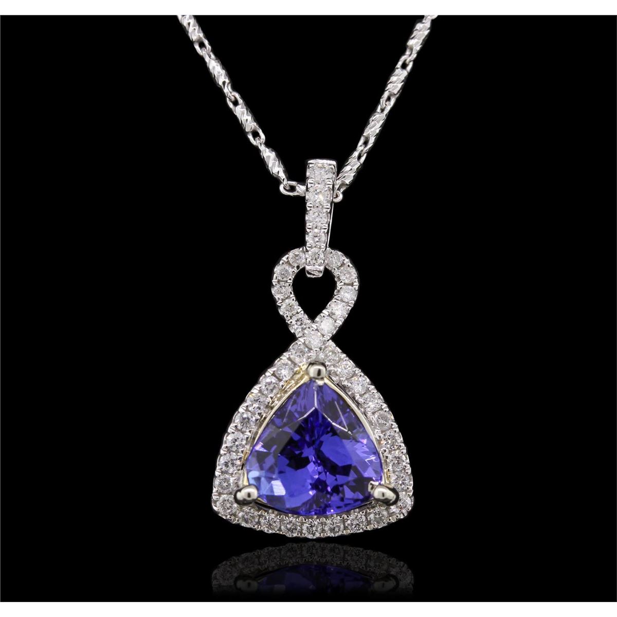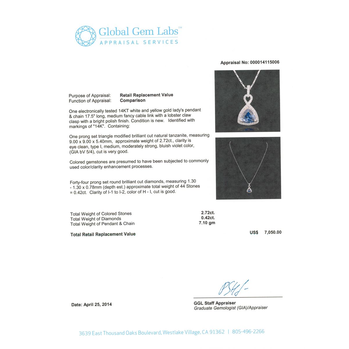 One electronically tested 14KT white and yellow gold Ladies pendant & chain 17.5" long, medium fancy cable link with a lobster claw clasp with a bright polish finish. Condition is new. Identified with markings of "14K". Containing: One prong set triangle modified brilliant cut natural tanzanite, measuring 9.00 x 9.00 x 5.40mm, approximate weight of 2.72ct., clarity is eye clean, type I, medium, moderately strong, bluish violet color, (GIA bV 5/4), cut is very good. Colored gemstones are presumed to have been subjected to commonly used color/clarity enhancement processes. Forty-Four prong set round brilliant cut diamonds, measuring 1.30 - 1.30 x 0.78mm (depth est.) approximate. Total Weight of 44 Stones = 0.42ct. Clarity: I-1 to I-2. Color: H - I, Cut is Good. Total Weight of Colored Stones 2.72ct. Total Weight of Diamonds 0.42ct. Total Weight of Pendant & Chain 7.10 grams. GGL Appraised at $7,050.00.
