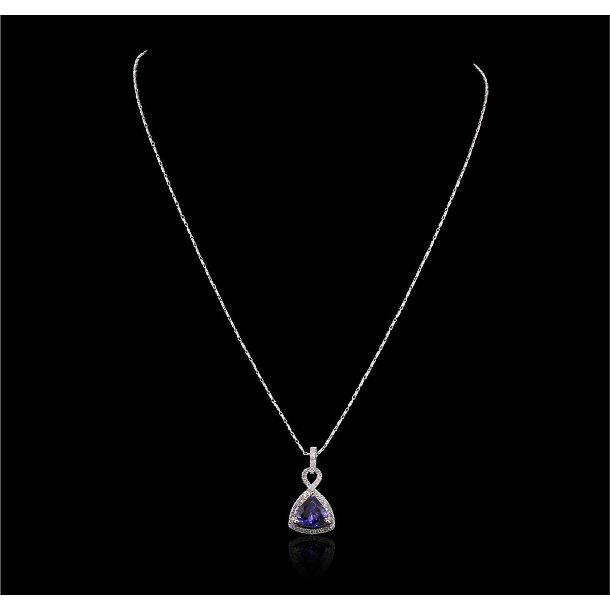 One electronically tested 14KT white and yellow gold Ladies pendant & chain 17.5" long, medium fancy cable link with a lobster claw clasp with a bright polish finish. Condition is new. Identified with markings of "14K". Containing: One prong set triangle modified brilliant cut natural tanzanite, measuring 9.00 x 9.00 x 5.40mm, approximate weight of 2.72ct., clarity is eye clean, type I, medium, moderately strong, bluish violet color, (GIA bV 5/4), cut is very good. Colored gemstones are presumed to have been subjected to commonly used color/clarity enhancement processes. Forty-Four prong set round brilliant cut diamonds, measuring 1.30 - 1.30 x 0.78mm (depth est.) approximate. Total Weight of 44 Stones = 0.42ct. Clarity: I-1 to I-2. Color: H - I, Cut is Good. Total Weight of Colored Stones 2.72ct. Total Weight of Diamonds 0.42ct. Total Weight of Pendant & Chain 7.10 grams. GGL Appraised at $7,050.00.