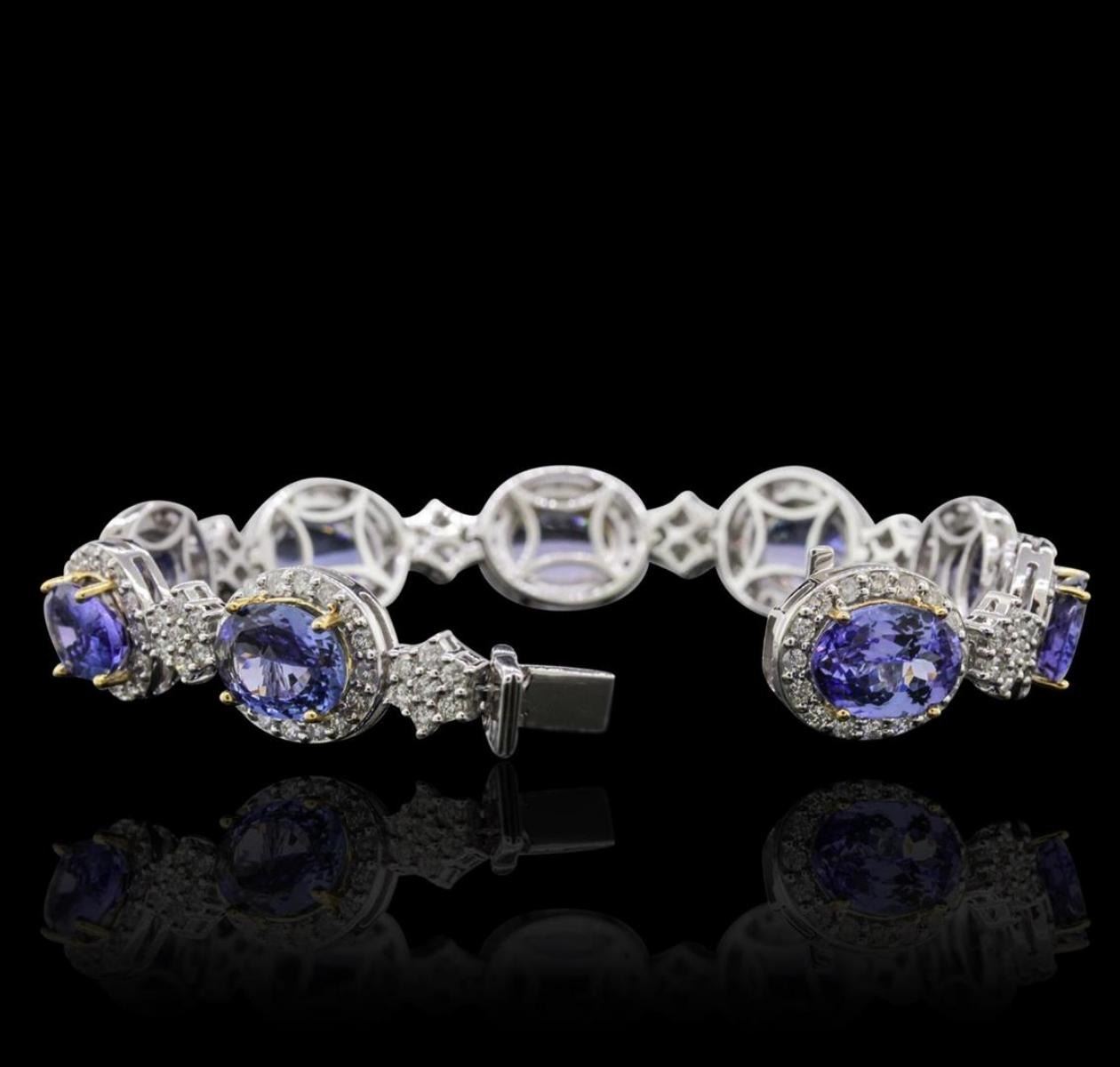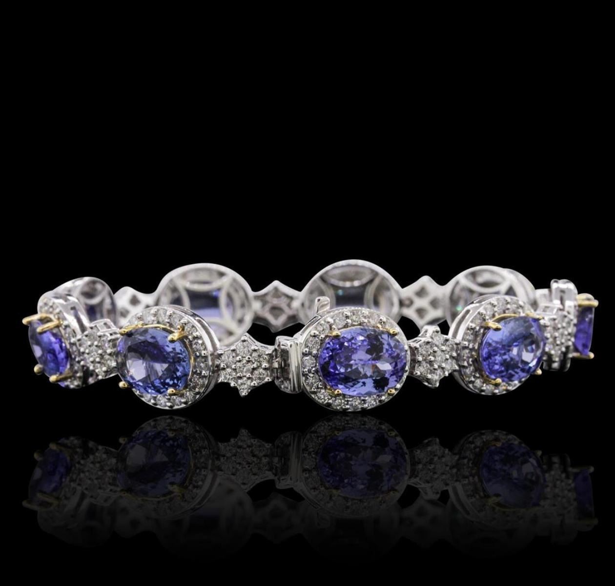 One electronically tested 14KT white and yellow gold ladies combination cast & assembled tanzanite and diamond bracelet with a hidden box clasp with safety closer with a bright polish finish. Measurements: 7.25" in length. Identified with markings of "14K". Condition is new. Containing: Nine prong set oval modified brilliant cut natural tanzanites, measuring 10.93 x 8.27 x 4.63mm, approximate total weight of 25.74ct., clarity is eye clean, type I, medium, moderately strong, bluish violet color, (GIA bV 5/4), cut is very good. Two Hundred Seven prong set round brilliant cut diamonds, measuring 1.60 - 1.30 x 0.87mm (depth est.) approximate total weight of 207 Stones = 2.30ct. Clarity: SI-2 to I-2. Color: H - I, Cut is Good. Colored gemstones are presumed to have been subjected to commonly used enhancement processes. All diamonds and colored gemstones are graded in the mounting, unless otherwise stated. Total Weight of Colored Stones 25.74ct. Total Weight of Diamonds 2.30ct. Total Weight of Bracelet 28.10 grams. GGL Appraised.