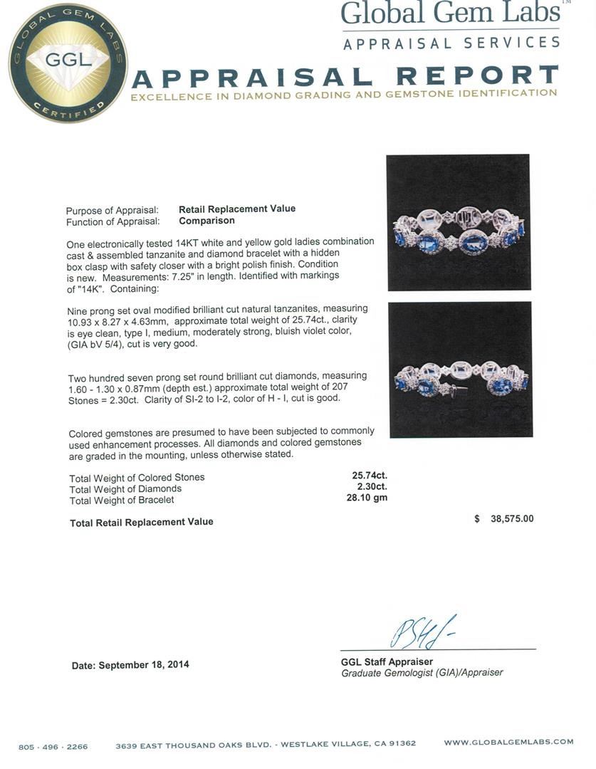 One electronically tested 14KT white and yellow gold ladies combination cast & assembled tanzanite and diamond bracelet with a hidden box clasp with safety closer with a bright polish finish. Measurements: 7.25" in length. Identified with markings of "14K". Condition is new. Containing: Nine prong set oval modified brilliant cut natural tanzanites, measuring 10.93 x 8.27 x 4.63mm, approximate total weight of 25.74ct., clarity is eye clean, type I, medium, moderately strong, bluish violet color, (GIA bV 5/4), cut is very good. Two Hundred Seven prong set round brilliant cut diamonds, measuring 1.60 - 1.30 x 0.87mm (depth est.) approximate total weight of 207 Stones = 2.30 ct. Clarity: SI-2 to I-2. Color: H - I, Cut is Good. Colored gemstones are presumed to have been subjected to commonly used enhancement processes. All diamonds and colored gemstones are graded in the mounting, unless otherwise stated. Total Weight of Colored Stones 25.74ct. Total Weight of Diamonds 2.30 ct. Total Weight of Bracelet 28.10 grams. GGL Appraised.