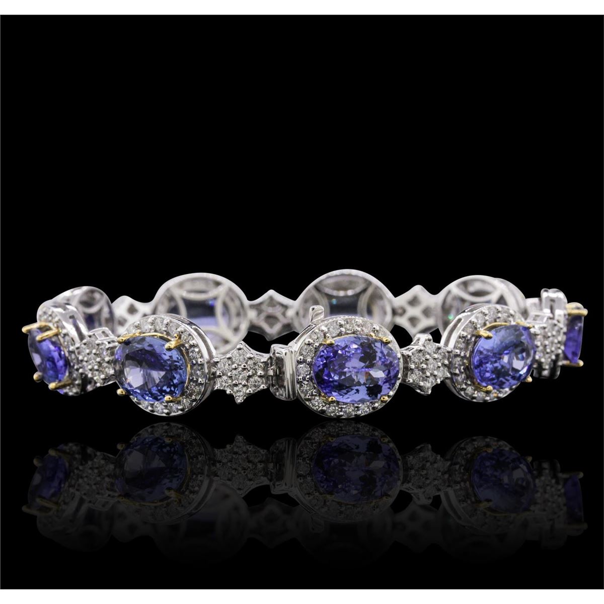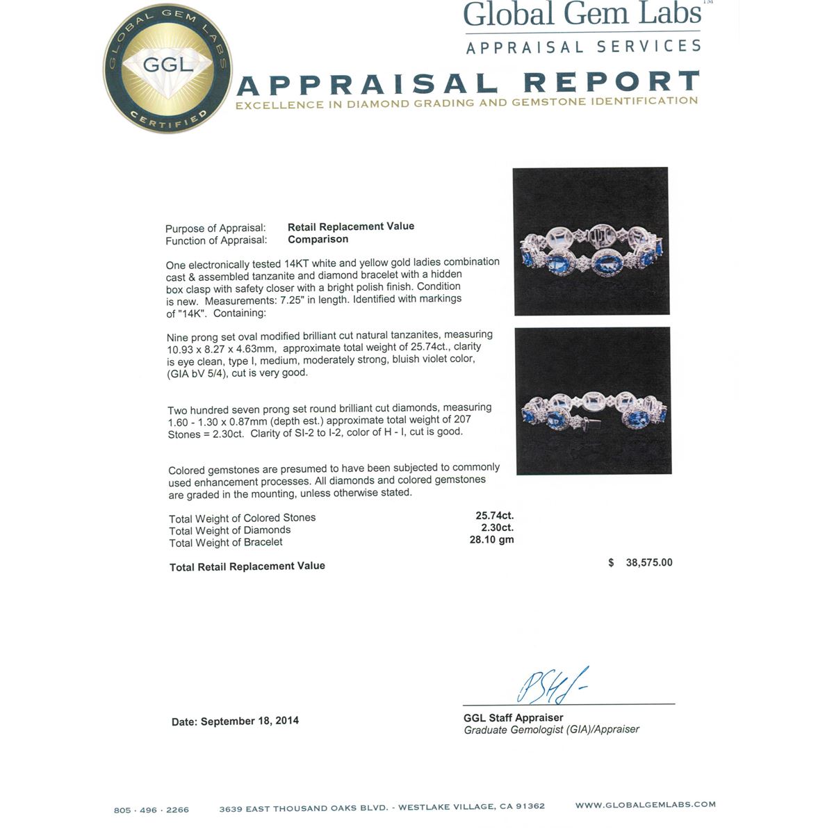 One electronically tested 14KT white and yellow gold ladies combination cast & assembled tanzanite and diamond bracelet with a hidden box clasp with safety closer with a bright polish finish. Measurements: 7.25" in length. Identified with markings of "14K". Condition is new. Containing: Nine prong set oval modified brilliant cut natural tanzanites, measuring 10.93 x 8.27 x 4.63mm, approximate total weight of 25.74ct., clarity is eye clean, type I, medium, moderately strong, bluish violet color, (GIA bV 5/4), cut is very good. Two Hundred Seven prong set round brilliant cut diamonds, measuring 1.60 - 1.30 x 0.87mm (depth est.) approximate total weight of 207 Stones = 2.30ct. Clarity: SI-2 to I-2. Color: H - I, Cut is Good. Colored gemstones are presumed to have been subjected to commonly used enhancement processes. All diamonds and colored gemstones are graded in the mounting, unless otherwise stated. Total Weight of Colored Stones 25.74ct. Total Weight of Diamonds 2.30ct. Total Weight of Bracelet 28.10 grams. GGL Appraised at $38,575.00.