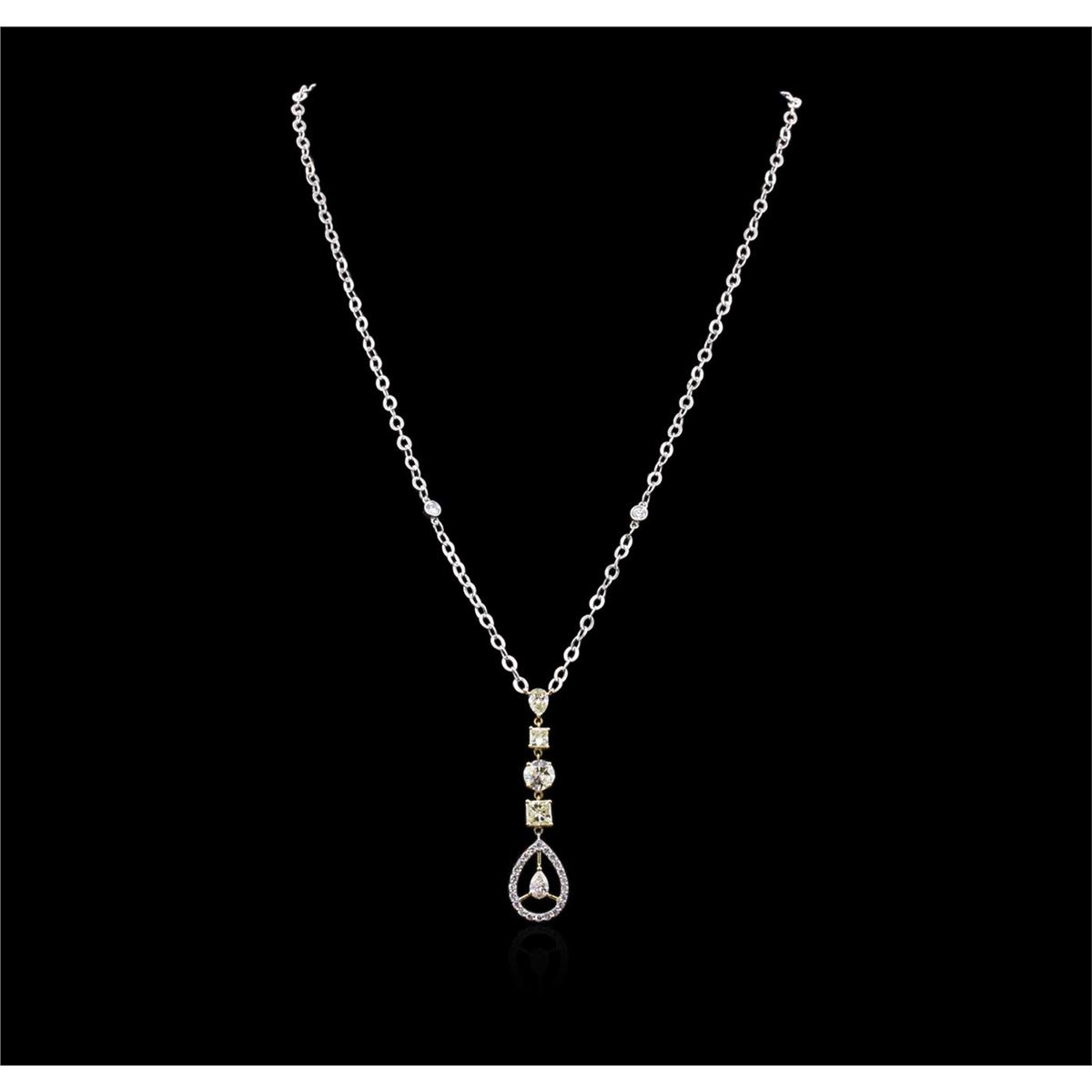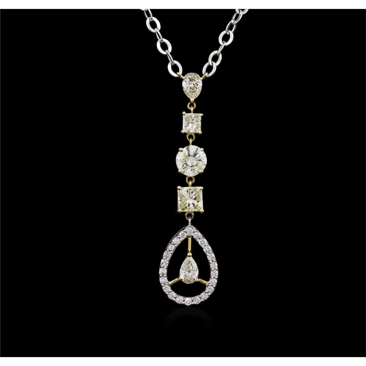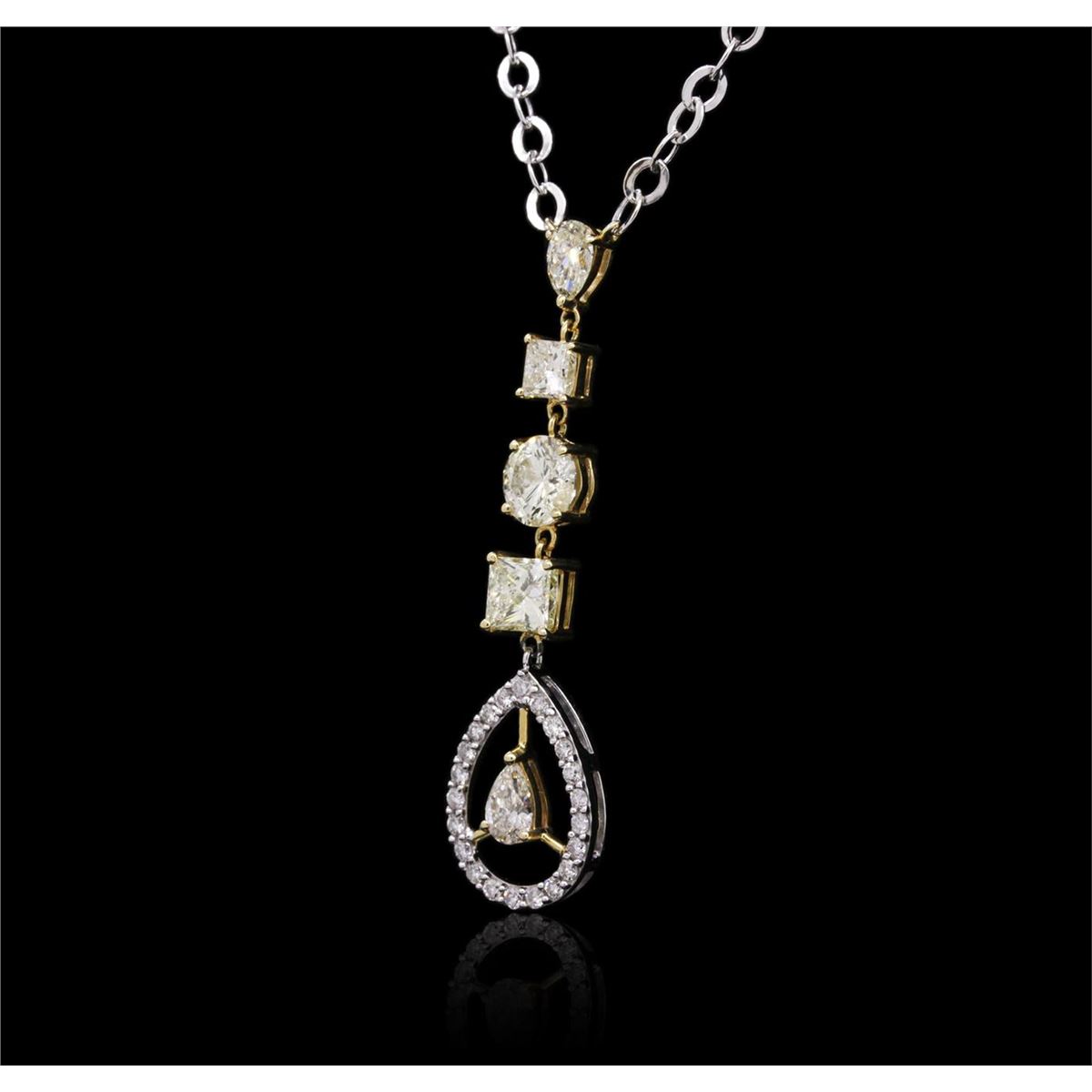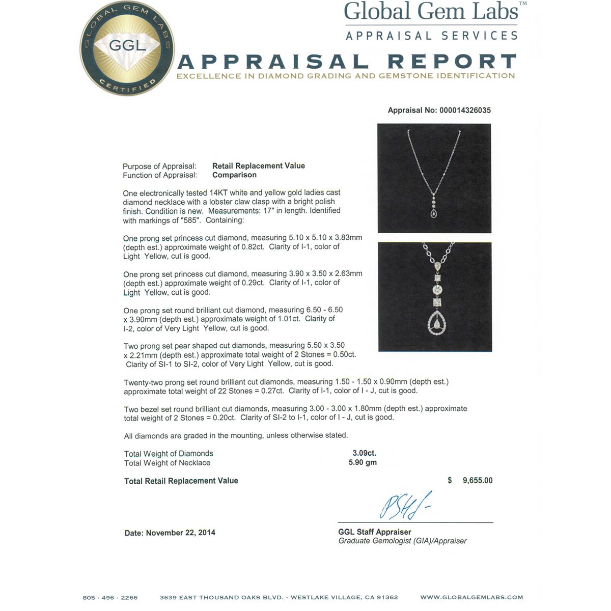 One electronically tested 14KT white and yellow gold ladies cast diamond necklace with a lobster claw clasp with a bright polish finish. Measurements: 17" in length. Identified with markings of "585". Condition is new. Containing: One prong set princess cut diamond, measuring 5.10 x 5.10 x 3.83mm (depth est.) approximate weight of 0.82ct. Clarity: I-1, Cut is Good. One prong set princess cut diamond, measuring 3.90 x 3.50 x 2.63mm (depth est.) approximate weight of 0.29ct. Clarity: I-1, Cut is Good. One prong set round brilliant cut diamond, measuring 6.50 - 6.50 x 3.90mm (depth est.) approximate weight of 1.01ct. Clarity: I-2, Cut is Good. Two prong set pear shaped cut diamonds, measuring 5.50 x 3.50 x 2.21mm (depth est.) approximate total weight of 2 Stones = 0.50ct. Clarity: SI-1 to SI-2, Cut is Good. Twenty-Two prong set round brilliant cut diamonds, measuring 1.50 - 1.50 x 0.90mm (depth est.) approximate total weight of 22 Stones = 0.27ct. Clarity: I-1. Color: I - J, Cut is Good. Two bezel set round brilliant cut diamonds, measuring 3.00 - 3.00 x 1.80mm (depth est.) approximate total weight of 2 Stones = 0.20ct. Clarity: SI-2 to I-1. Color: I - J, Cut is Good. All diamonds are graded in the mounting, unless otherwise stated. Total Weight of Diamonds 3.09ct. Total Weight of Necklace 5.90 grams. GGL Appraised at $9,655.00.