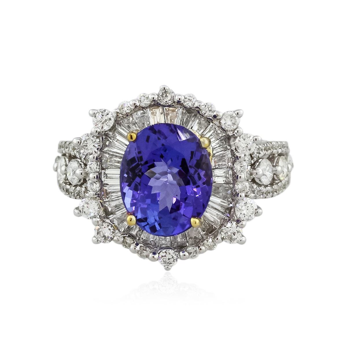 One electronically tested 14KT white and yellow gold Ladies combination cast & assembled ring with a bright polish finish. Condition is new. Identified with markings of "14K". Containing: One prong set oval modified mixed cut natural tanzanite, measuring 10.00 x 8.00 x 5.20mm, approximate weight of 3.15ct., clarity is eye clean, type I, medium, moderately strong, bluish violet color, (GIA bV 5/4), cut is very good. Colored gemstones are presumed to have been subjected to commonly used color/clarity enhancement processes. Twenty-Six channel set baguette cut diamonds, measuring 2.20 x 1.80 x 1.53mm (depth est.) approximate. Total Weight of 26 Stones = 1.30ct. Clarity: VS-2. Color: H - I, Cut is Good. Thirty-Four prong set round brilliant cut diamonds, measuring 1.00 - 1.00 x 0.60mm (depth est.) approximate. Total Weight of 34 Stones = 0.12ct. Clarity: I-1 to I-2. Color: H - I, Cut is Good. Fourteen prong set round brilliant cut diamonds, measuring 2.40 - 1.90 x 1.29mm (depth est.) approximate. Total Weight of 14 Stones = 0.31ct. Clarity: SI-2 to I-1. Color: H - I, Cut is Good. Total Weight of Colored Stones 3.15ct. Total Weight of Diamonds 1.73ct. Total Weight of Ring 6.40 grams. GGL Appraised at $11,230.00.