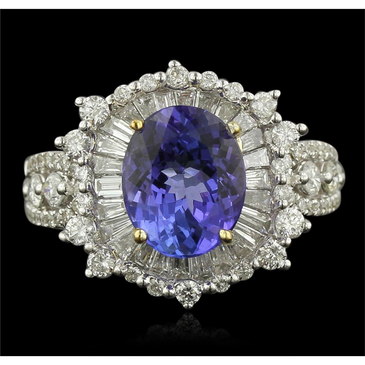 One electronically tested 14KT white and yellow gold Ladies combination cast & assembled ring with a bright polish finish. Condition is new. Identified with markings of "14K". Containing: One prong set oval modified mixed cut natural tanzanite, measuring 10.00 x 8.00 x 5.20mm, approximate weight of 3.15ct., clarity is eye clean, type I, medium, moderately strong, bluish violet color, (GIA bV 5/4), cut is very good. Colored gemstones are presumed to have been subjected to commonly used color/clarity enhancement processes. Twenty-Six channel set baguette cut diamonds, measuring 2.20 x 1.80 x 1.53mm (depth est.) approximate. Total Weight of 26 Stones = 1.30ct. Clarity: VS-2. Color: H - I, Cut is Good. Thirty-Four prong set round brilliant cut diamonds, measuring 1.00 - 1.00 x 0.60mm (depth est.) approximate. Total Weight of 34 Stones = 0.12ct. Clarity: I-1 to I-2. Color: H - I, Cut is Good. Fourteen prong set round brilliant cut diamonds, measuring 2.40 - 1.90 x 1.29mm (depth est.) approximate. Total Weight of 14 Stones = 0.31ct. Clarity: SI-2 to I-1. Color: H - I, Cut is Good. Total Weight of Colored Stones 3.15ct. Total Weight of Diamonds 1.73ct. Total Weight of Ring 6.40 grams. GGL Appraised at $11,230.00.