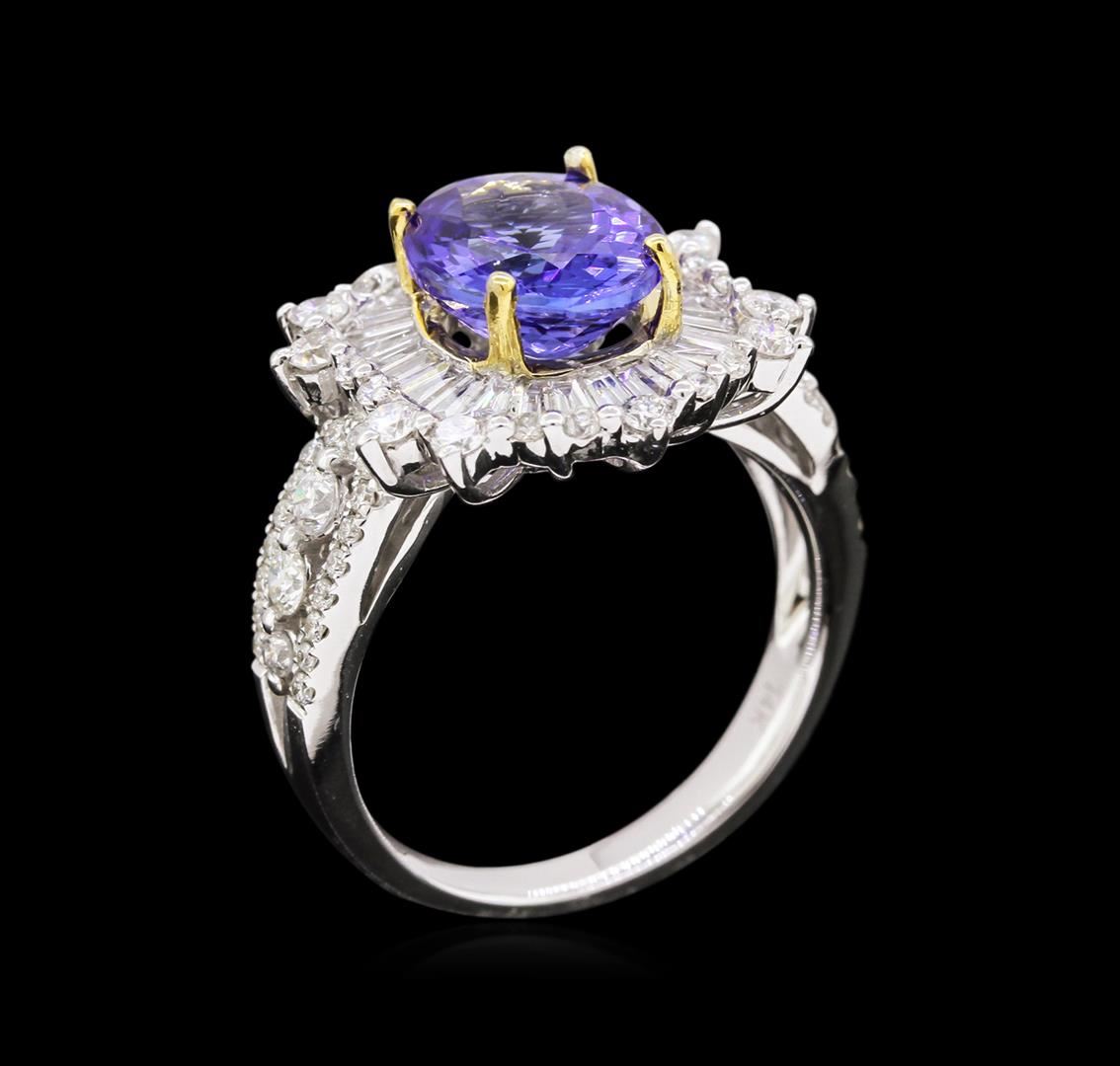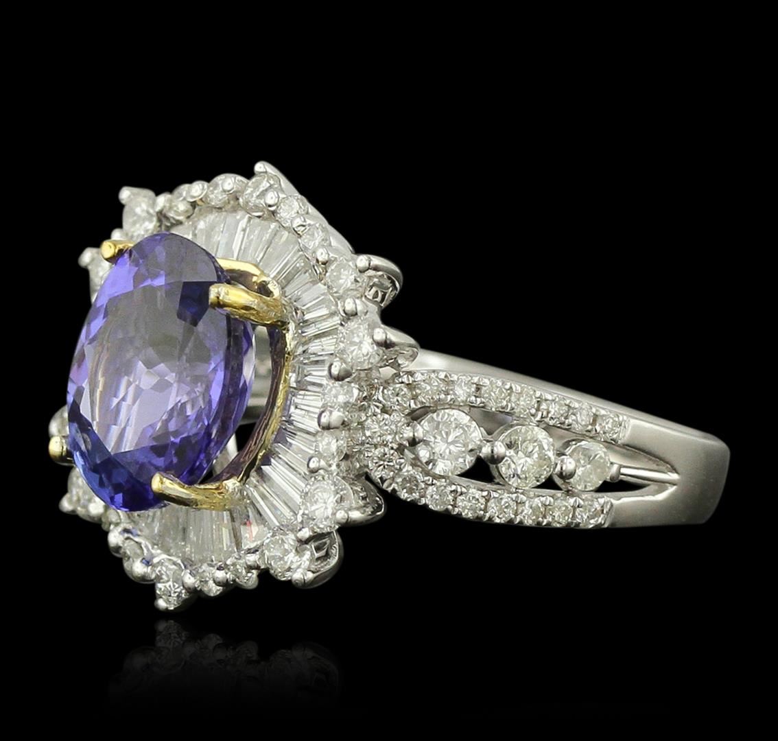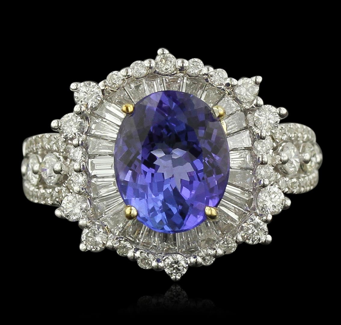 One electronically tested 14KT white and yellow gold Ladies combination cast & assembled ring with a bright polish finish. Condition is new. Identified with markings of "14K". Containing: One prong set oval modified mixed cut natural tanzanite, measuring 10.00 x 8.00 x 5.20mm, approximate weight of 3.15ct., clarity is eye clean, type I, medium, moderately strong, bluish violet color, (GIA bV 5/4), cut is very good. Colored gemstones are presumed to have been subjected to commonly used color/clarity enhancement processes. Twenty-Six channel set baguette cut diamonds, measuring 2.20 x 1.80 x 1.53mm (depth est.) approximate. Total Weight of 26 Stones = 1.30ct. Clarity: VS-2. Color: H - I, Cut is Good. Thirty-Four prong set round brilliant cut diamonds, measuring 1.00 - 1.00 x 0.60mm (depth est.) approximate. Total Weight of 34 Stones = 0.12ct. Clarity: I-1 to I-2. Color: H - I, Cut is Good. Fourteen prong set round brilliant cut diamonds, measuring 2.40 - 1.90 x 1.29mm (depth est.) approximate. Total Weight of 14 Stones = 0.31ct. Clarity: SI-2 to I-1. Color: H - I, Cut is Good. Total Weight of Colored Stones 3.15ct. Total Weight of Diamonds 1.73ct. Total Weight of Ring 6.40 grams. GGL Appraised at $11,230.00.