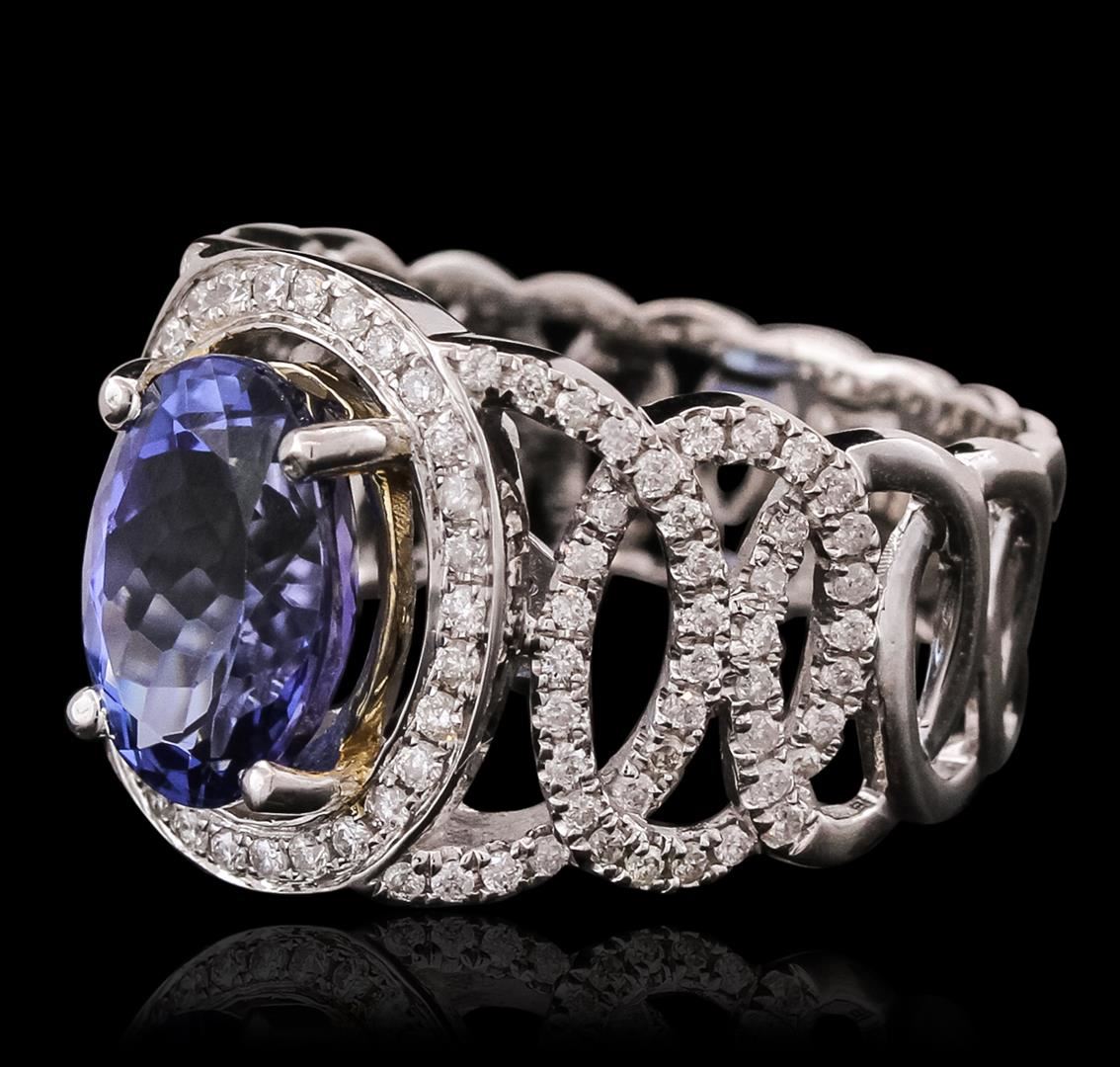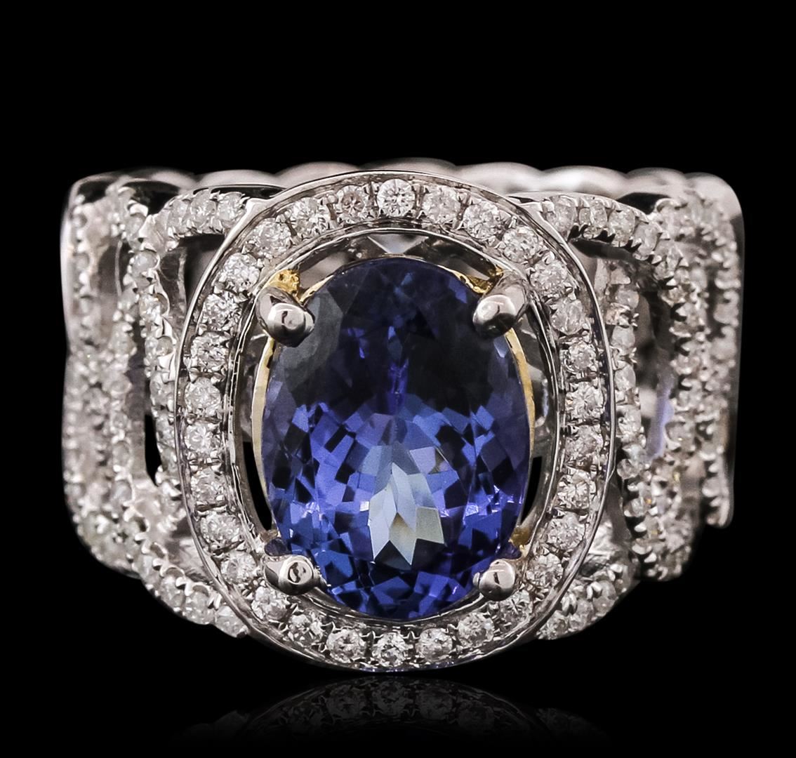 One electronically tested 14KT white and yellow gold ladies combination cast & assembled tanzanite and diamond ring with a tapered shank with a bright polish finish. Identified with markings of "14K". Condition is new. Containing: One prong set oval modified brilliant cut natural tanzanite, measuring 10.74 x 7.88 x 5.63mm, approximate weight of 3.27ct., clarity is eye clean, type I, medium, very slightly grayish, violet color, (GIA V 5/3), cut is good. One Hundred Eighteen prong set round brilliant cut diamonds, measuring 1.20 - 1.20 x 0.72mm (depth est.) approximate total weight of 118 Stones = 0.74ct. Clarity: I-1 to I-2. Color: I - J, Cut is Good. Colored gemstones are presumed to have been subjected to commonly used enhancement processes. All diamonds and colored gemstones are graded in the mounting, unless otherwise stated total weight of Colored Stones 3.27ct. Total Weight of Diamonds 0.74ct. Total Weight of Ring 7.90 grams. GGL Appraised at $8,970.00.