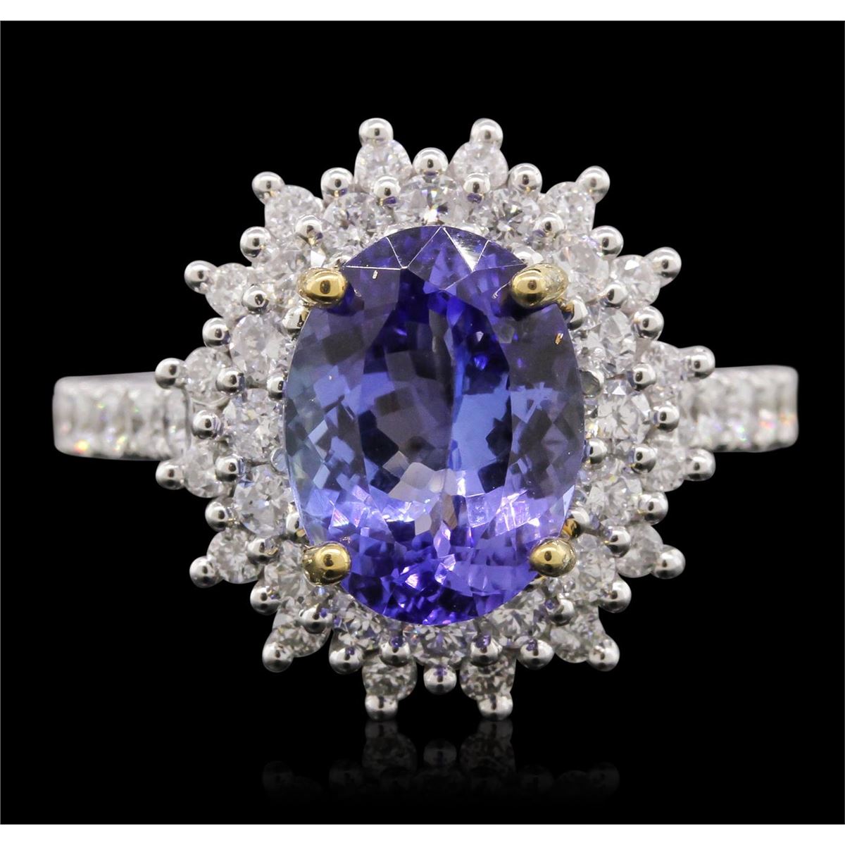 One electronically tested 14KT white and yellow gold Ladies combination cast & assembled ring with a bright polish finish. Condition is new. Identified with markings of "14K". Containing: One prong set oval modified brilliant cut natural tanzanite, measuring 11.00. x 8.30 x 5.25mm, approximate weight of 3.28ct., clarity is eye clean, type I, medium light, very slightly grayish, bluish violet color, (GIA bV 4/3), cut is good. Colored gemstones are presumed to have been subjected to commonly used color/clarity enhancement processes. Forty-Two prong set round brilliant cut diamonds, measuring 2.00. - 1.50 x 1.05mm (depth est.) approximate. Total Weight of 42 Stones = 0.82ct. . Clarity: I-1 to I-2. Color: I - J, Cut is Good. . Total Weight of Colored Stones 3.28ct. Total Weight of Diamonds 0.82ct. Total Weight of Ring 6.60 grams. GGL Appraised at $7,785.00.