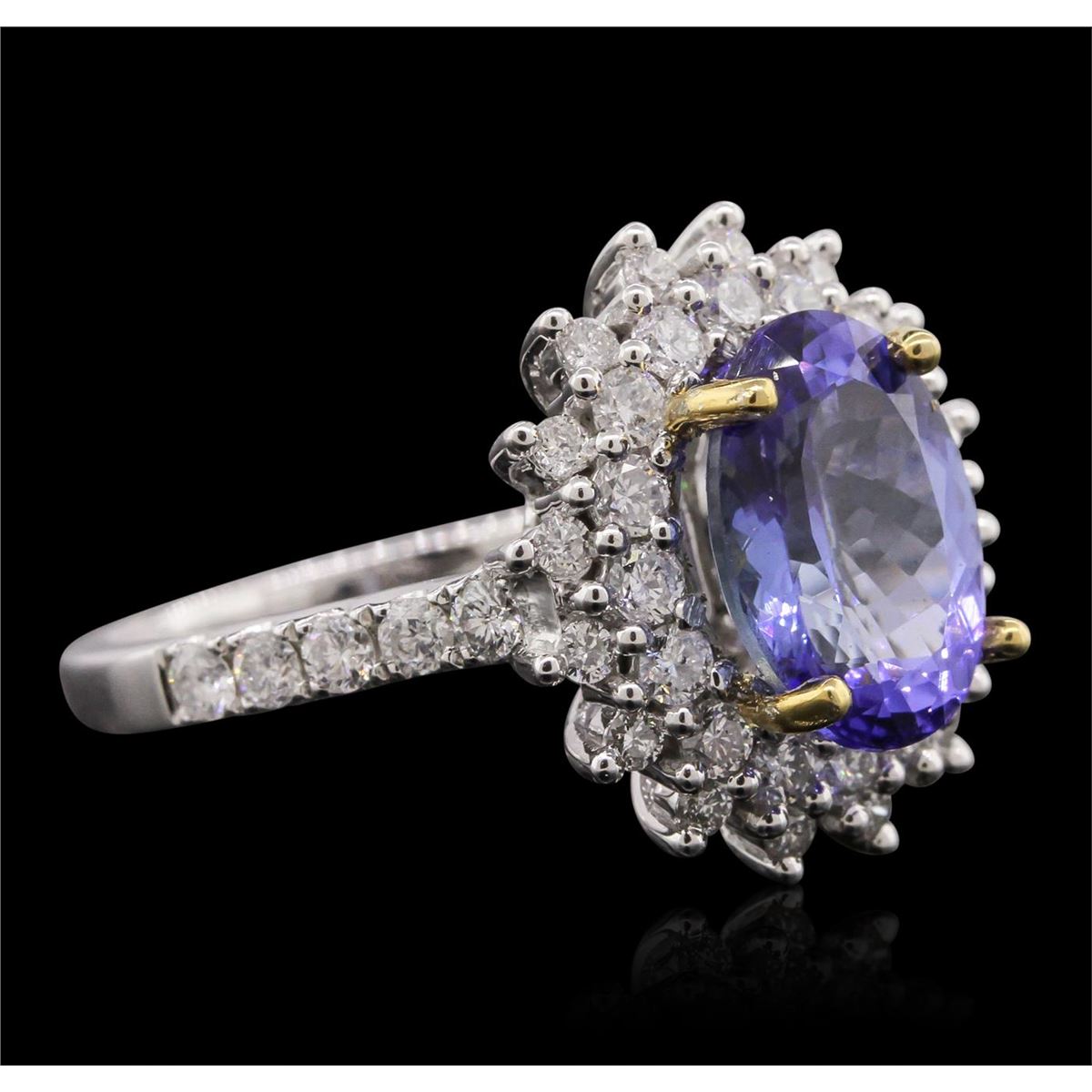 One electronically tested 14KT white and yellow gold Ladies combination cast & assembled ring with a bright polish finish. Condition is new. Identified with markings of "14K". Containing: One prong set oval modified brilliant cut natural tanzanite, measuring 11.00. x 8.30 x 5.25mm, approximate weight of 3.28ct., clarity is eye clean, type I, medium light, very slightly grayish, bluish violet color, (GIA bV 4/3), cut is good. Colored gemstones are presumed to have been subjected to commonly used color/clarity enhancement processes. Forty-Two prong set round brilliant cut diamonds, measuring 2.00. - 1.50 x 1.05mm (depth est.) approximate. Total Weight of 42 Stones = 0.82ct. . Clarity: I-1 to I-2. Color: I - J, Cut is Good. . Total Weight of Colored Stones 3.28ct. Total Weight of Diamonds 0.82ct. Total Weight of Ring 6.60 grams. GGL Appraised at $7,785.00.