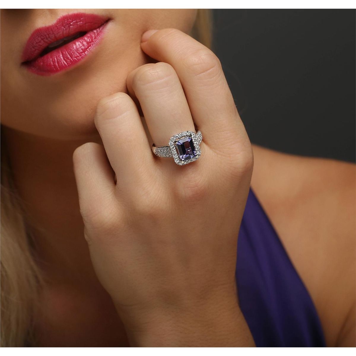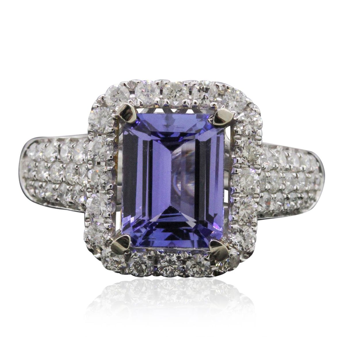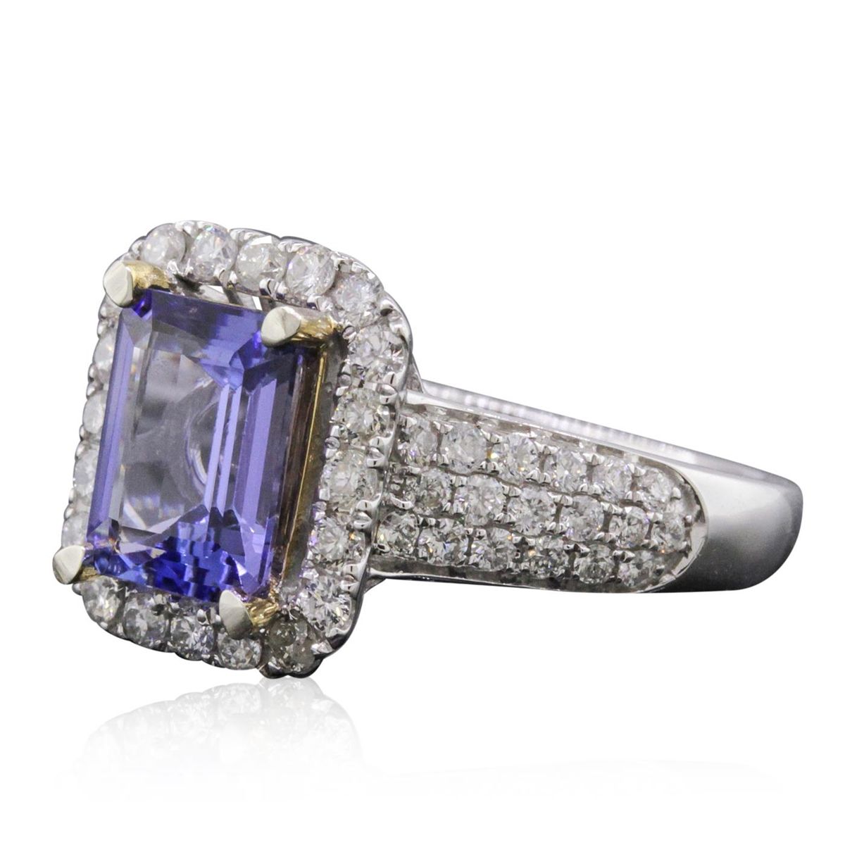 One electronically tested 14KT white and yellow gold ladies combination cast & assembled tanzanite and diamond ring with a flat shank with a bright polish finish. Identified with markings of "14K". Condition is new. Containing: One prong set emerald standard step cut natural tanzanite, measuring 9.00 x 6.80 x 5.97mm, approximate weight of 3.30ct., clarity is eye clean, type I, medium light, very slightly grayish, violet color, (GIA V 4/3), cut is good. Fifty-Six prong set round brilliant cut diamonds, measuring 1.50 - 1.50 x 0.90mm (depth est.) stated total weight of 56 Stones = 0.69ct. Clarity: I-1 to I-2. Color: H - I, Cut is Good. Colored gemstones are presumed to have been subjected to commonly used enhancement processes. All diamonds and colored gemstones are graded in the mounting, unless otherwise stated total weight of Colored Stones 3.30ct. Total Weight of Diamonds 0.69ct. Total Weight of Ring 5.90 grams. GGL Appraised at $8,270.00.