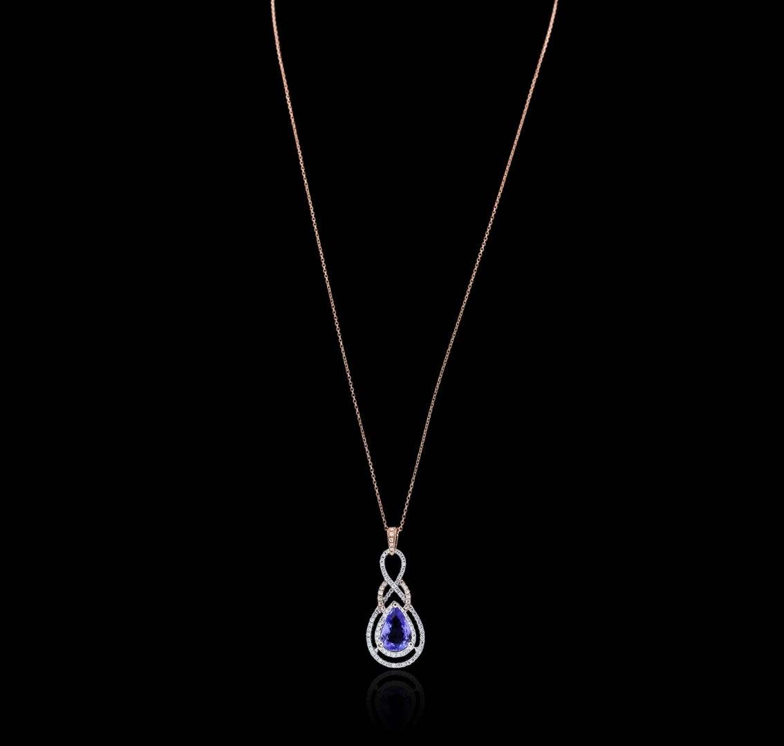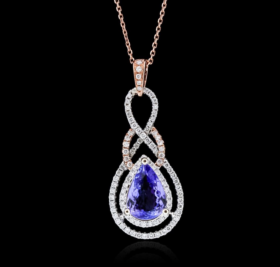 One electronically tested 14KT white and rose gold ladies cast tanzanite and diamond pendant & chain 18.0" long, cable link with a spring ring clasp with a bright polish finish. Identified with markings of "14K". Condition is new. Containing: One prong set pear modified brilliant cut natural tanzanite, measuring 11.39 x 8.30 x 5.27mm, approximate weight of 3.34ct., clarity is eye clean, type I, medium light, very slightly grayish, violet color, (GIA V 4/3), cut is good. One Hundred Forty-Three prong set round brilliant cut diamonds, measuring 1.30 - 1.30 x 0.78mm (depth est.) approximate total weight of 143 Stones = 1.14ct. Clarity: I-1 to I-2. Color: I - J, Cut is Good. Colored gemstones are presumed to have been subjected to commonly used enhancement processes. All diamonds and colored gemstones are graded in the mounting, unless otherwise stated. Total Weight of Colored Stones 3.34ct. Total Weight of Diamonds 1.14ct. Total Weight of Pendant & Chain 5.90 grams. GGL Appraised at $5,460.00.