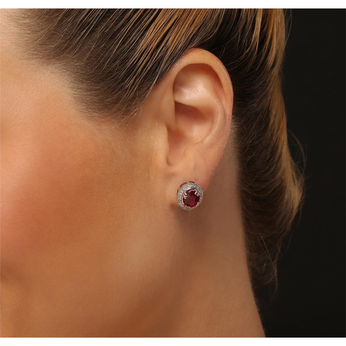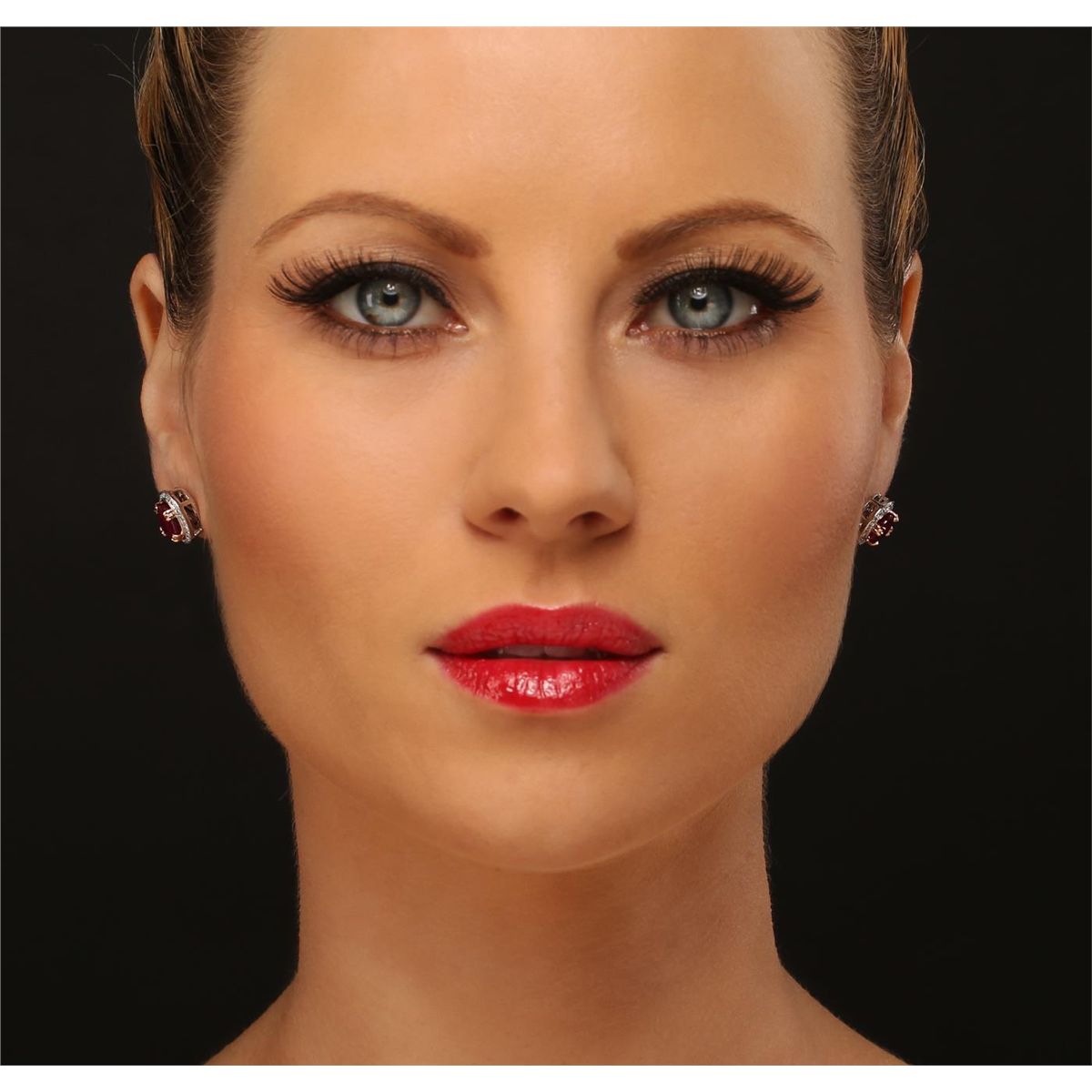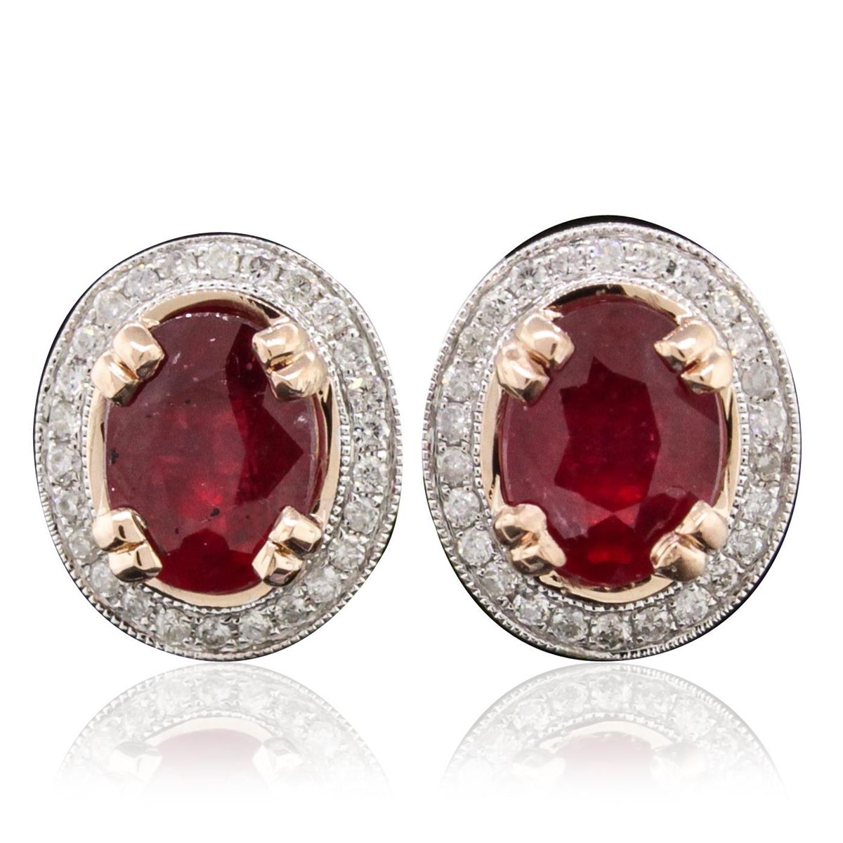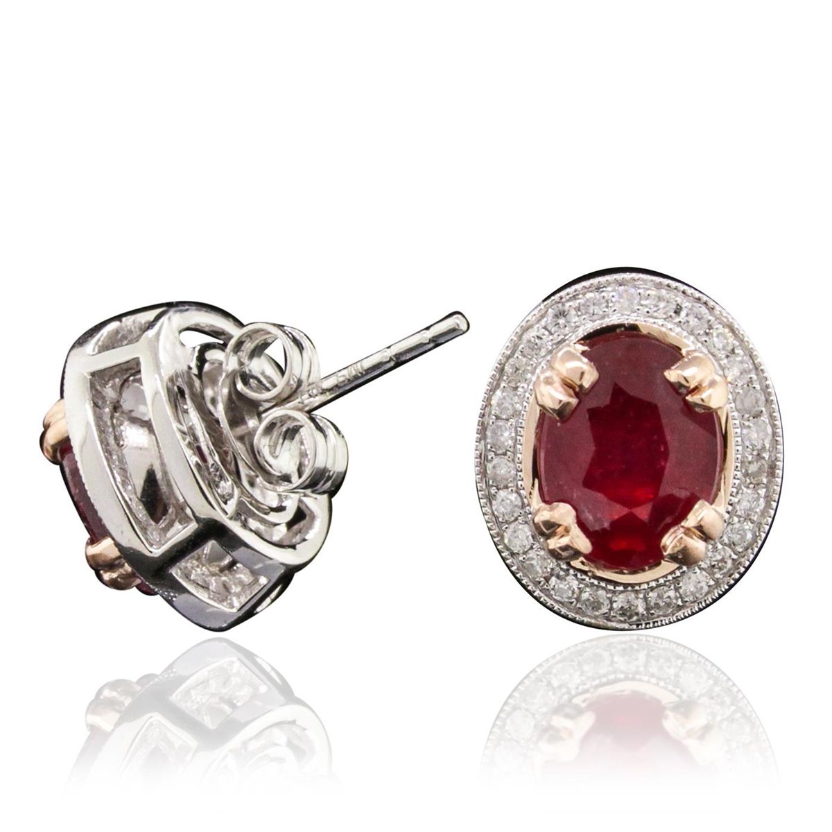 One pair electronically tested 14KT white and rose gold ladies combination cast & assembled stud earrings with friction posts with a bright polish finish. Condition is new. Identified with markings of "14K". Containing: Two prong set oval modified brilliant cut natural rubies, measuring 8.10 x 6.20 x 4.32mm, approximate total weight of 3.54ct., clarity is heavily included, type II, medium, moderately strong, strongly purplish red color, (GIA stpR 5/4), cut is good. Fifty-Two prong set round brilliant cut diamonds, measuring 1.30 - 1.30 x 0.78mm (depth est.) approximate total weight of 52 Stones = 0.42ct. Clarity: I-1 to I-2. Color: J - K, Cut is Good. Colored gemstones are presumed to have been subjected to commonly used enhancement processes. All diamonds and colored gemstones are graded in the mounting, unless otherwise stated. Total Weight of Colored Stones 3.54ct. Total Weight of Diamonds 0.42ct. Total Weight of Earrings 5.60 grams. GGL Appraised at $4,120.00.