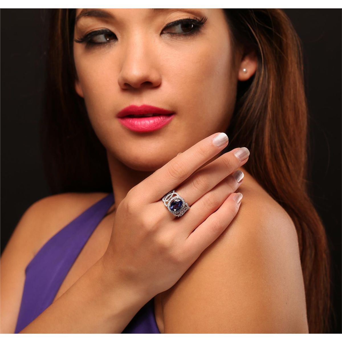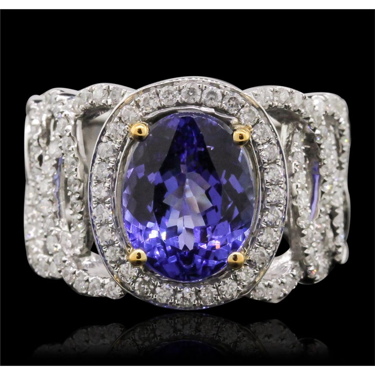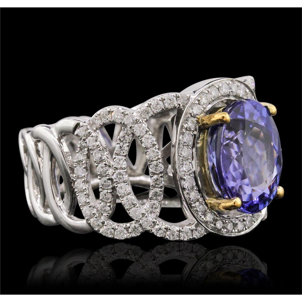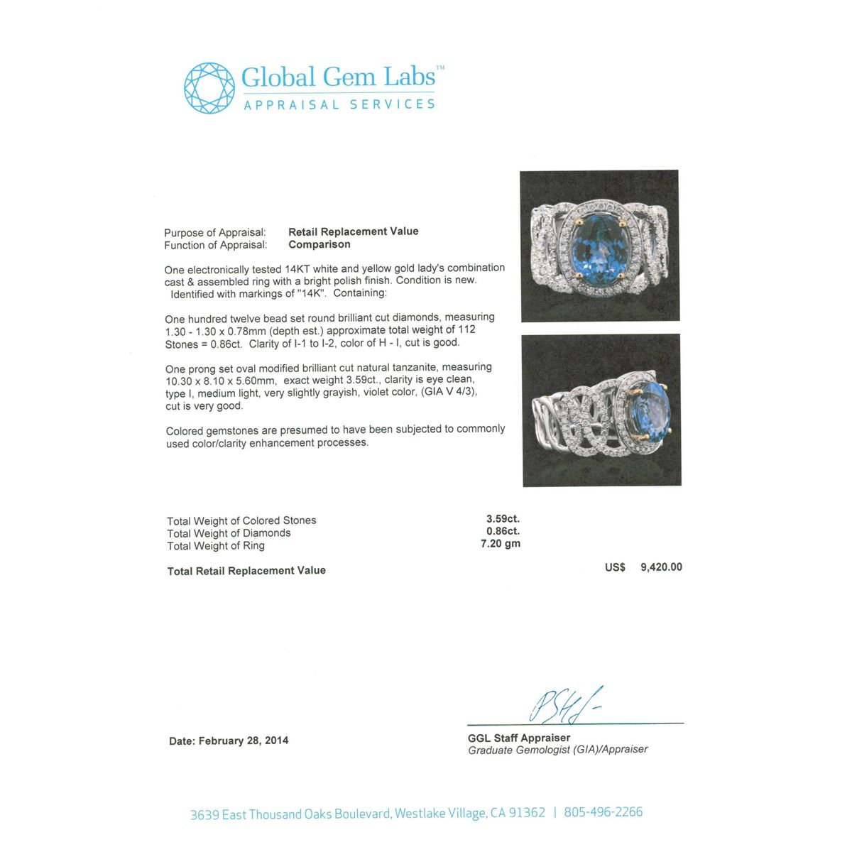 One electronically tested 14KT white and yellow gold Ladies combination cast & assembled ring with a bright polish finish. Condition is new. Identified with markings of "14K". Containing: One Hundred Twelve bead set round brilliant cut diamonds, measuring 1.30 - 1.30 x 0.78mm (depth est.) approximate. Total Weight of 112 Stones = 0.86ct. Clarity: I-1 to I-2. Color: H - I, Cut is Good. One prong set oval modified brilliant cut natural tanzanite, measuring 10.30 x 8.10 x 5.60mm, exact weight 3.59ct., clarity is eye clean, type I, medium light, very slightly grayish, violet color, (GIA V 4/3), cut is very good. Colored gemstones are presumed to have been subjected to commonly used color/clarity enhancement processes. Total Weight of Colored Stones 3.59ct. Total Weight of Diamonds 0.86ct. Total Weight of Ring 7.20 grams. GGL Appraised at $9,420.00.