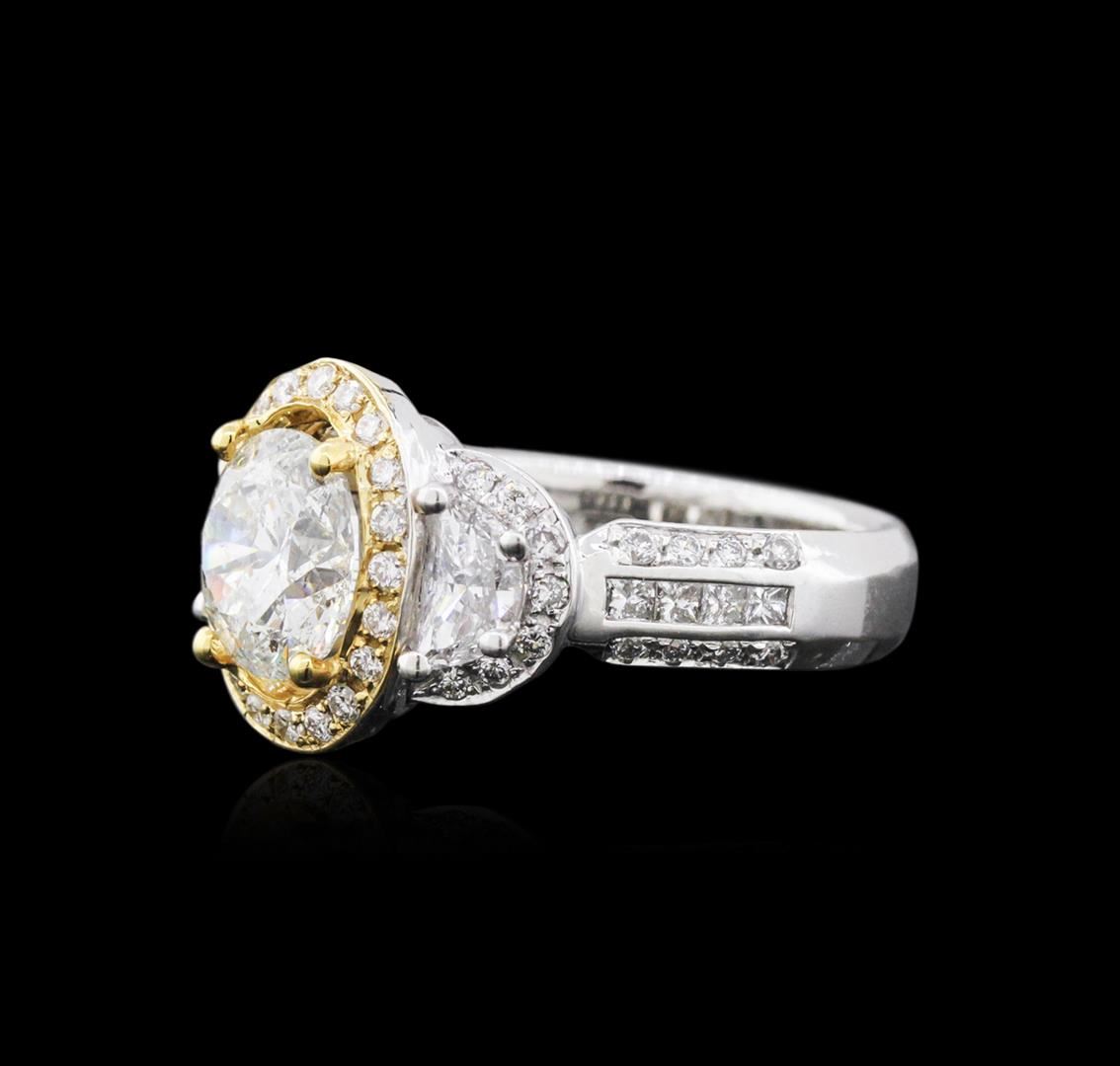 One electronically tested 14KT white and yellow gold Ladies combination cast & assembled engagement ring with a bright polish finish. Condition is new. Identified with markings of "14K". Containing: One prong set round brilliant cut diamond, measuring 8.60 - 8.50 x 5.50mm (depth est.) approximate weight of 2.45ct. Clarity: I-2. Color: K, Cut is Good. Two prong set half moon cut diamonds, measuring 5.40 x 3.00 x 2.00mm (depth est.) approximate. Total Weight of 2 Stones = 0.60ct. Clarity: SI-1 to SI-2. Color: H, Cut is Good. Eight prong set princess cut diamonds, measuring 1.50 x 1.50 x 1.13mm (depth est.) approximate. Total Weight of 8 Stones = 0.17ct. Clarity: SI-2. Color: I, Cut is Good. Fifty bead set round brilliant cut diamonds, measuring 1.30 - 1.30 x 0.78mm (depth est.) approximate. Total Weight of 50 Stones = 0.40ct. Clarity: SI-2 to I-1. Color: H - I, Cut is Good. Total Weight of Diamonds 3.62ct. Total Weight of Engagement Ring 8.40 grams. GGL Appraised at $24,105.00.