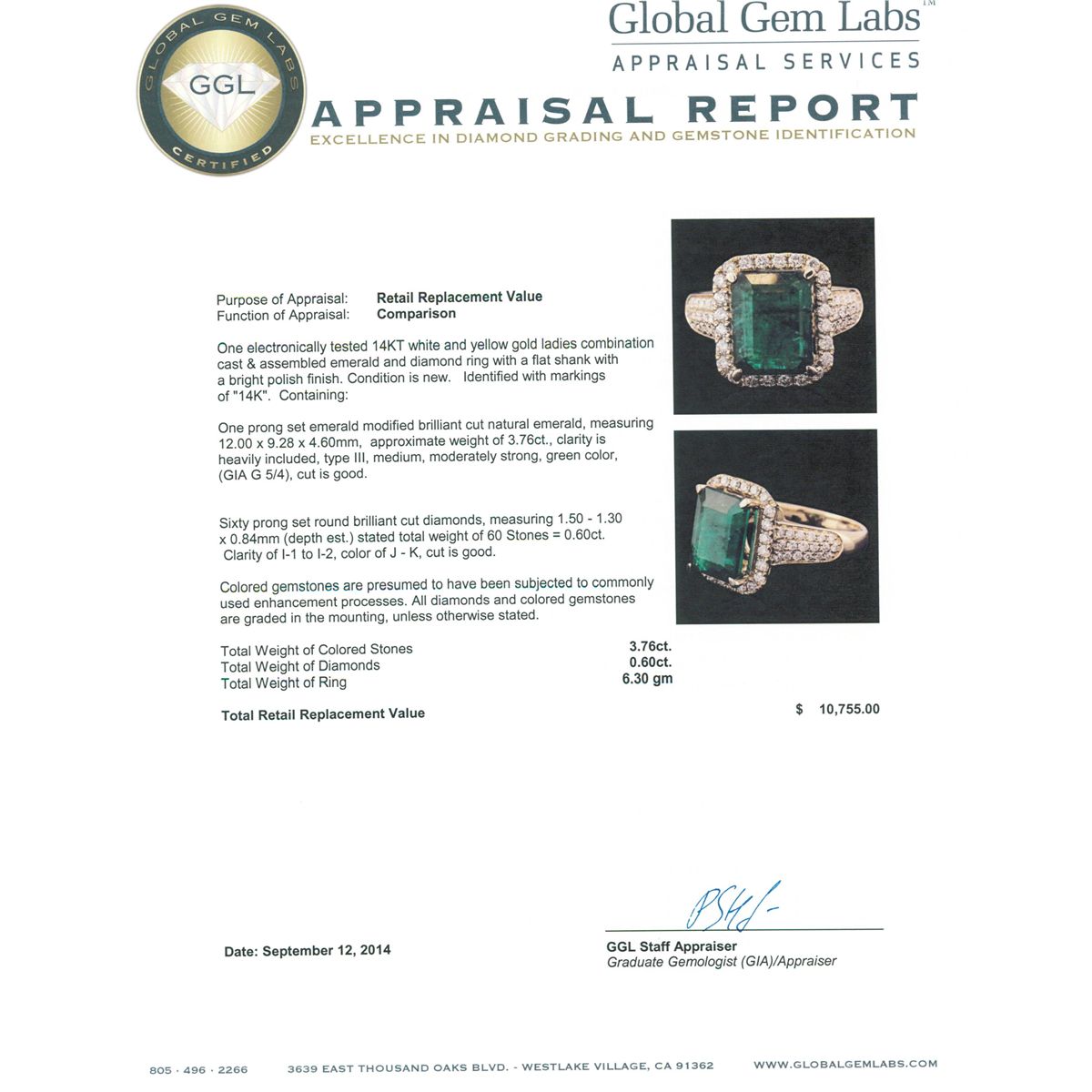 One electronically tested 14KT white and yellow gold ladies combination cast & assembled emerald and diamond ring with a flat shank with a bright polish finish. Identified with markings of "14K". Condition is new. Containing: One prong set emerald modified brilliant cut natural emerald, measuring 12.00 x 9.28 x 4.60mm, approximate weight of 3.76ct., clarity is heavily included, type III, medium, moderately strong, green color, (GIA G 5/4), cut is good. Sixty prong set round brilliant cut diamonds, measuring 1.50 - 1.30 x 0.84mm (depth est.) stated total weight of 60 Stones = 0.60ct. Clarity: I-1 to I-2. Color: J - K, Cut is Good. Colored gemstones are presumed to have been subjected to commonly used enhancement processes. All diamonds and colored gemstones are graded in the mounting, unless otherwise stated total weight of Colored Stones 3.76ct. Total Weight of Diamonds 0.60ct. Total Weight of Ring 6.30 grams. GGL Appraised at $10,755.00.