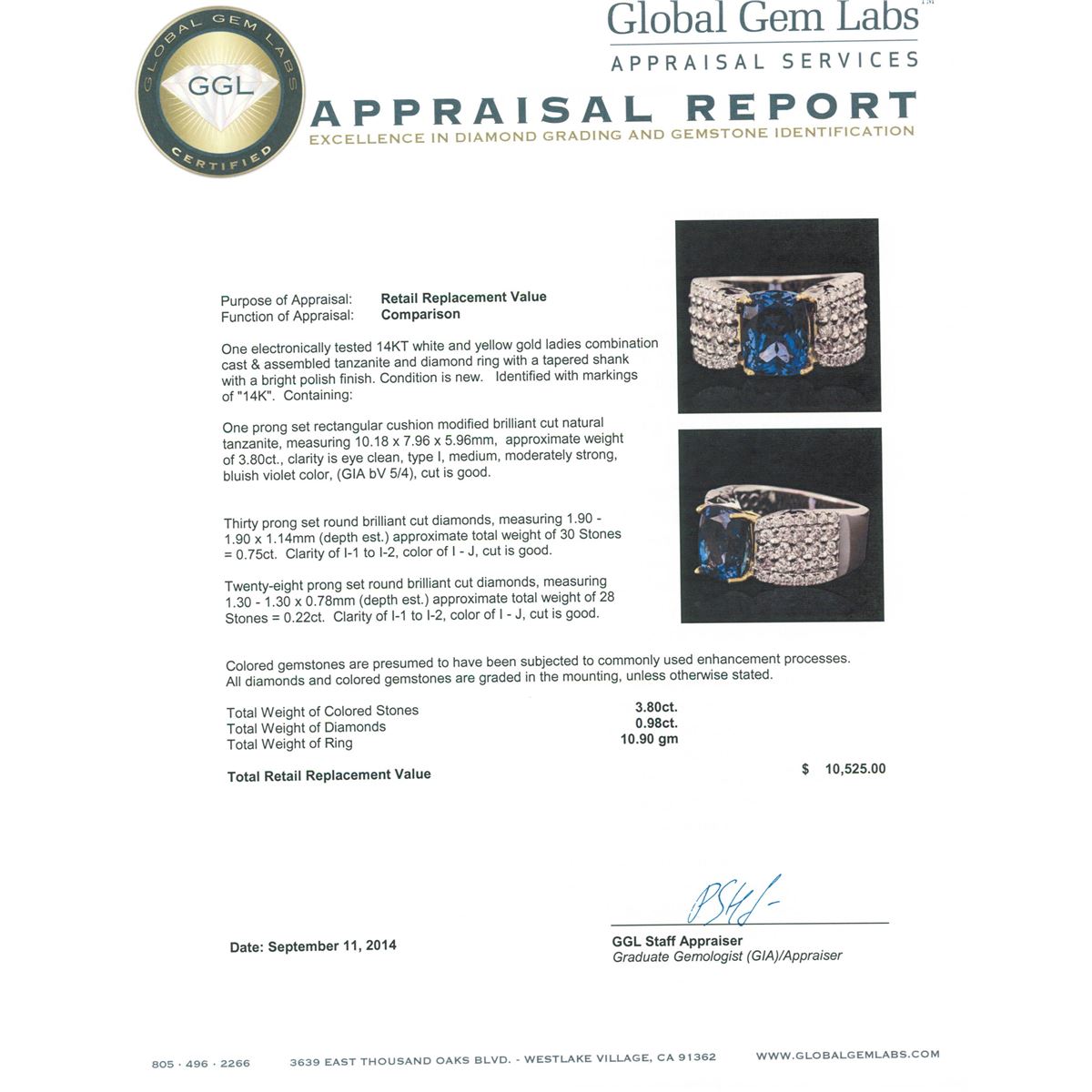 One electronically tested 14KT white and yellow gold ladies combination cast & assembled tanzanite and diamond ring with a tapered shank with a bright polish finish. Identified with markings of "14K". Condition is new. Containing: One prong set rectangular cushion modified brilliant cut natural tanzanite, measuring 10.18 x 7.96 x 5.96mm, approximate weight of 3.80ct., clarity is eye clean, type I, medium, moderately strong, bluish violet color, (GIA bV 5/4), cut is good. Thirty prong set round brilliant cut diamonds, measuring 1.90 - 1.90 x 1.14mm (depth est.) approximate total weight of 30 Stones = 0.75ct. Clarity: I-1 to I-2. Color: I - J, Cut is Good. Twenty-Eight prong set round brilliant cut diamonds, measuring 1.30 - 1.30 x 0.78mm (depth est.) approximate total weight of 28 Stones = 0.22ct. Clarity: I-1 to I-2. Color: I - J, Cut is Good. Colored gemstones are presumed to have been subjected to commonly used enhancement processes. All diamonds and colored gemstones are graded in the mounting, unless otherwise stated. Total Weight of Colored Stones 3.80ct. Total Weight of Diamonds 0.98ct. Total Weight of Ring 10.90 grams. GGL Appraised at $10,525.00.