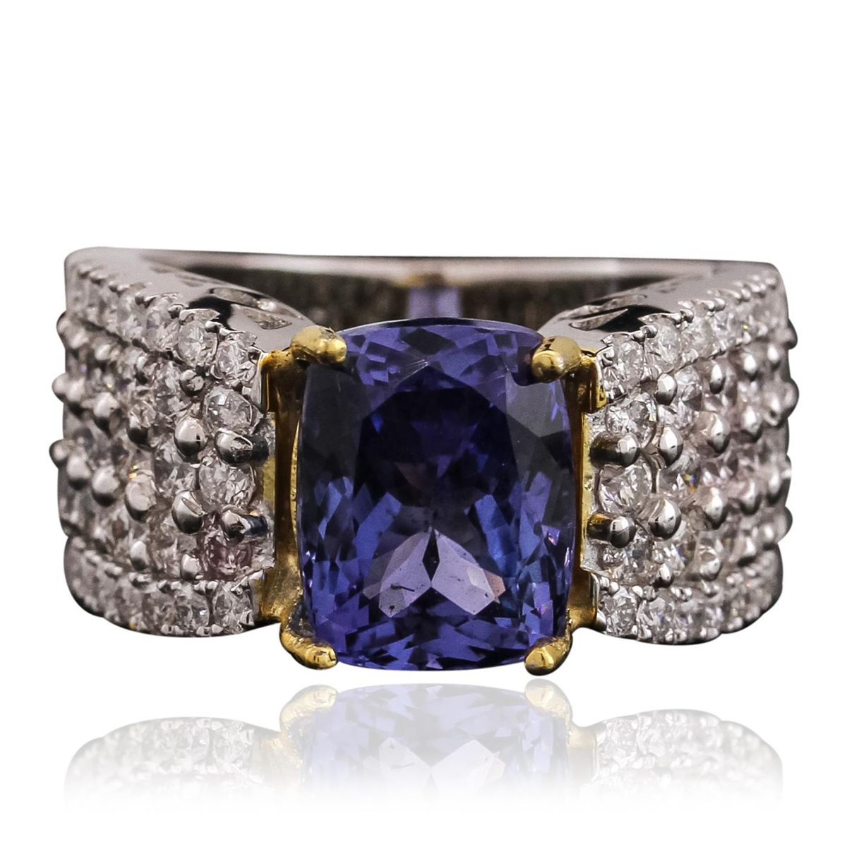 One electronically tested 14KT white and yellow gold ladies combination cast & assembled tanzanite and diamond ring with a tapered shank with a bright polish finish. Identified with markings of "14K". Condition is new. Containing: One prong set rectangular cushion modified brilliant cut natural tanzanite, measuring 10.18 x 7.96 x 5.96mm, approximate weight of 3.80ct., clarity is eye clean, type I, medium, moderately strong, bluish violet color, (GIA bV 5/4), cut is good. Thirty prong set round brilliant cut diamonds, measuring 1.90 - 1.90 x 1.14mm (depth est.) approximate total weight of 30 Stones = 0.75ct. Clarity: I-1 to I-2. Color: I - J, Cut is Good. Twenty-Eight prong set round brilliant cut diamonds, measuring 1.30 - 1.30 x 0.78mm (depth est.) approximate total weight of 28 Stones = 0.22ct. Clarity: I-1 to I-2. Color: I - J, Cut is Good. Colored gemstones are presumed to have been subjected to commonly used enhancement processes. All diamonds and colored gemstones are graded in the mounting, unless otherwise stated. Total Weight of Colored Stones 3.80ct. Total Weight of Diamonds 0.98ct. Total Weight of Ring 10.90 grams. GGL Appraised at $10,525.00.