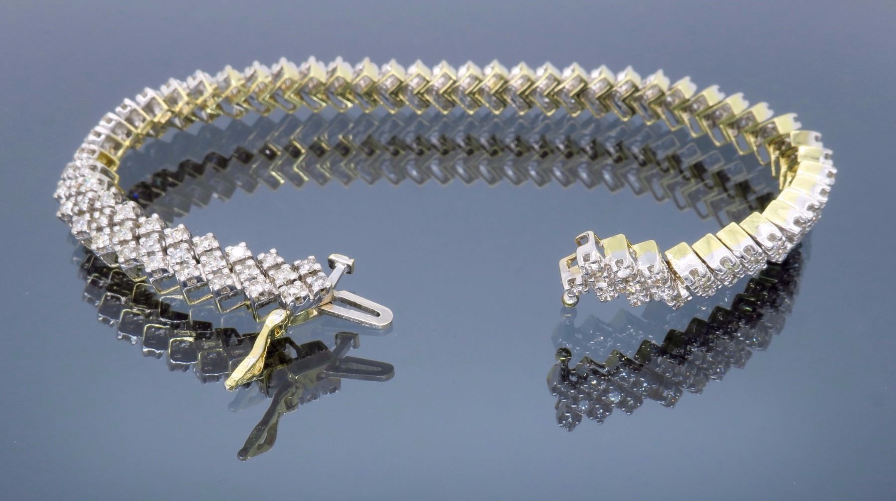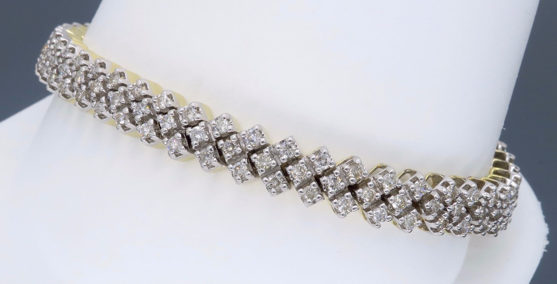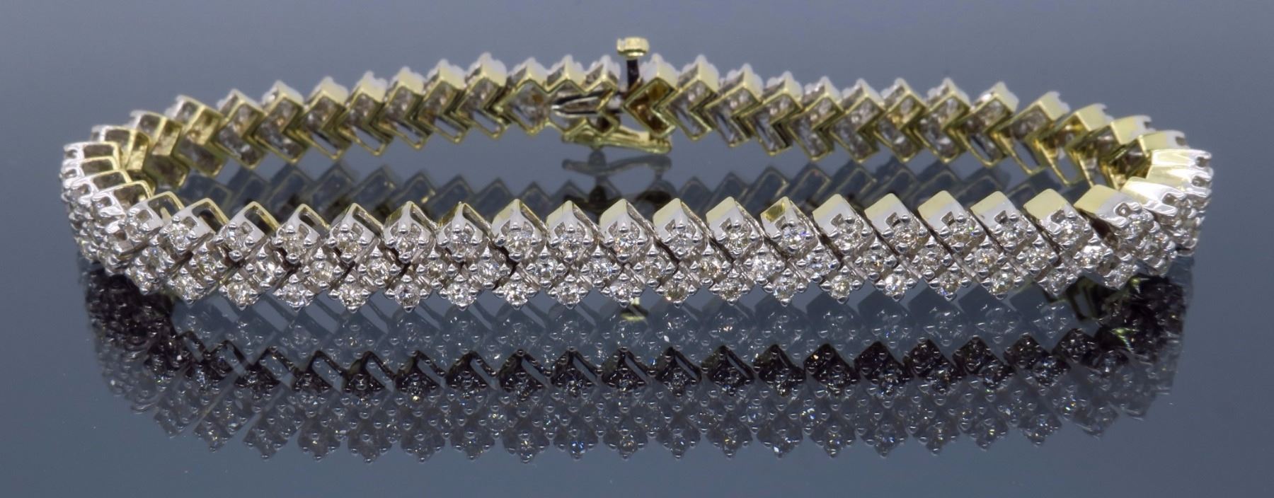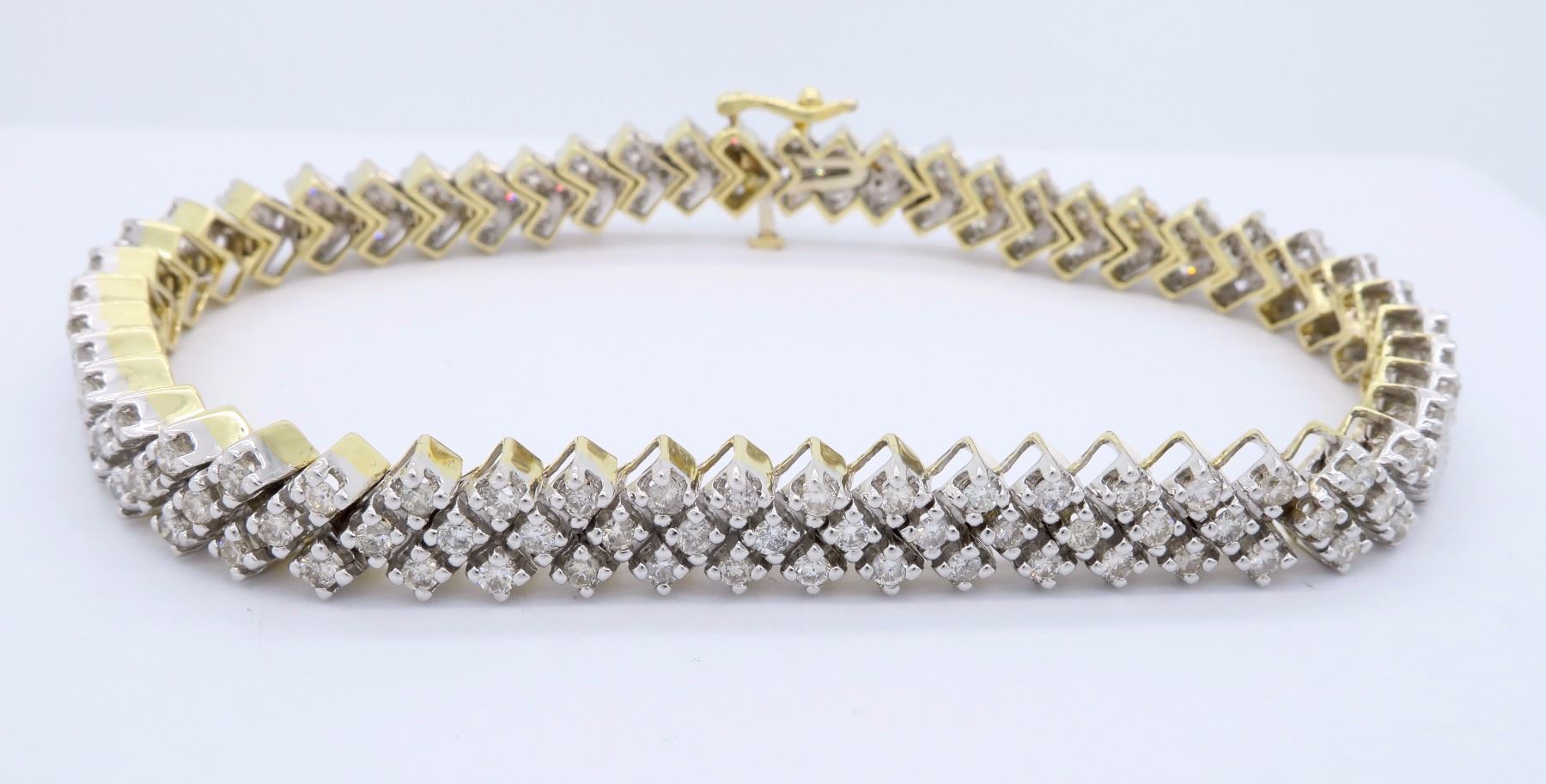 One 14KT Two Tone Gold 3.80ctw Diamond Bracelet. Round Diamonds with a total weight of 3.80cts with a color of H-J and clarity of SI-1 to I-1. Total length of this bracelet is 7.25 inches. Total weight of this bracelet is 20.5 grams.