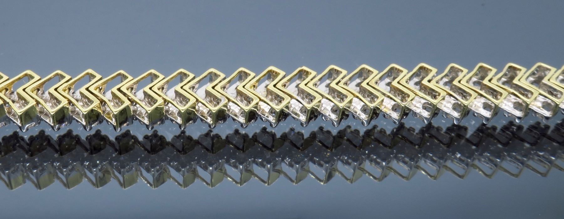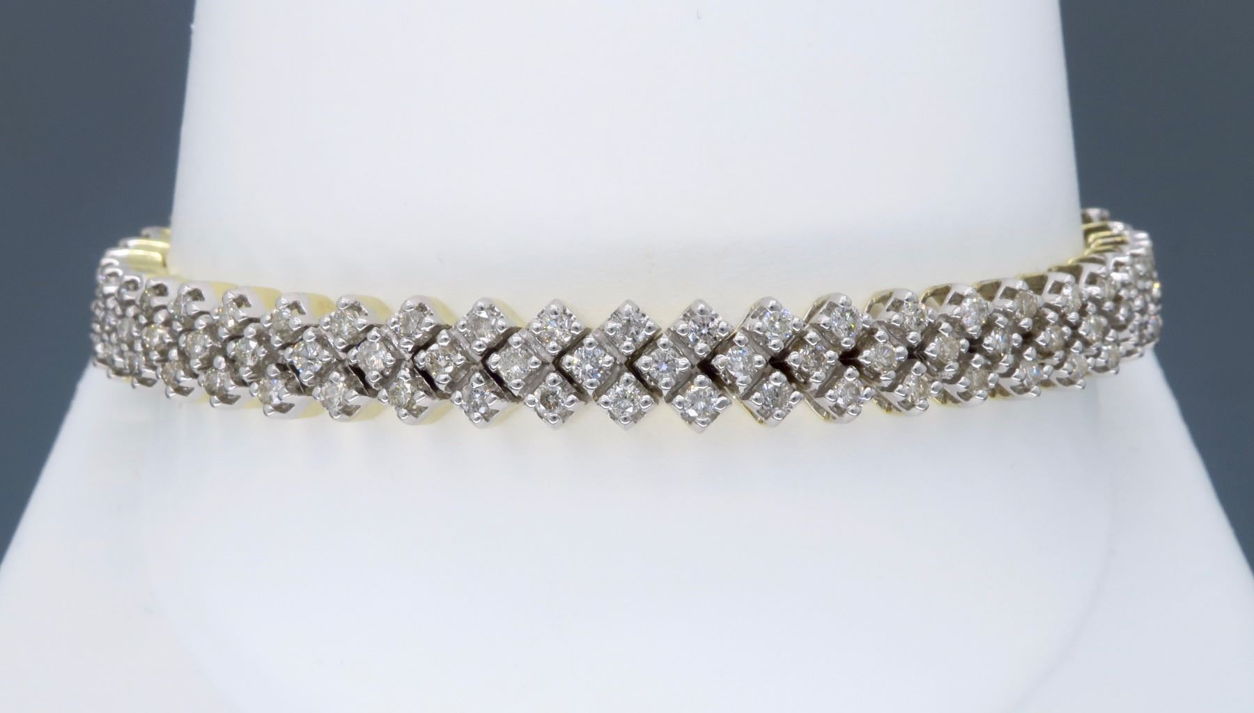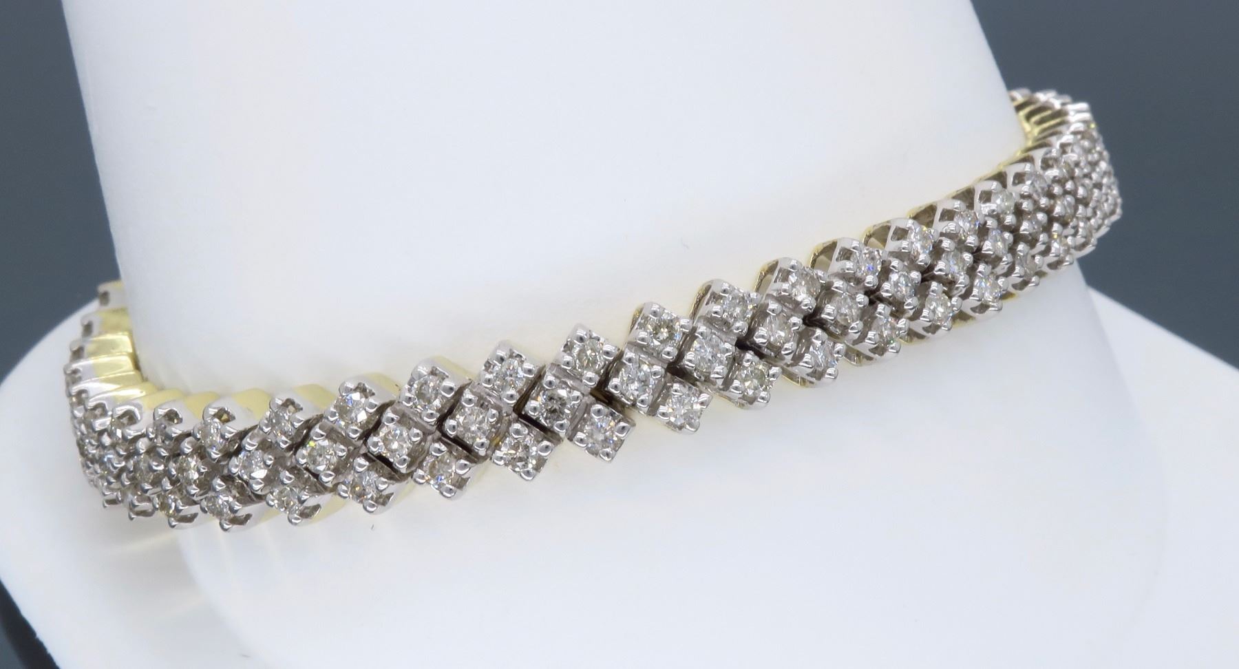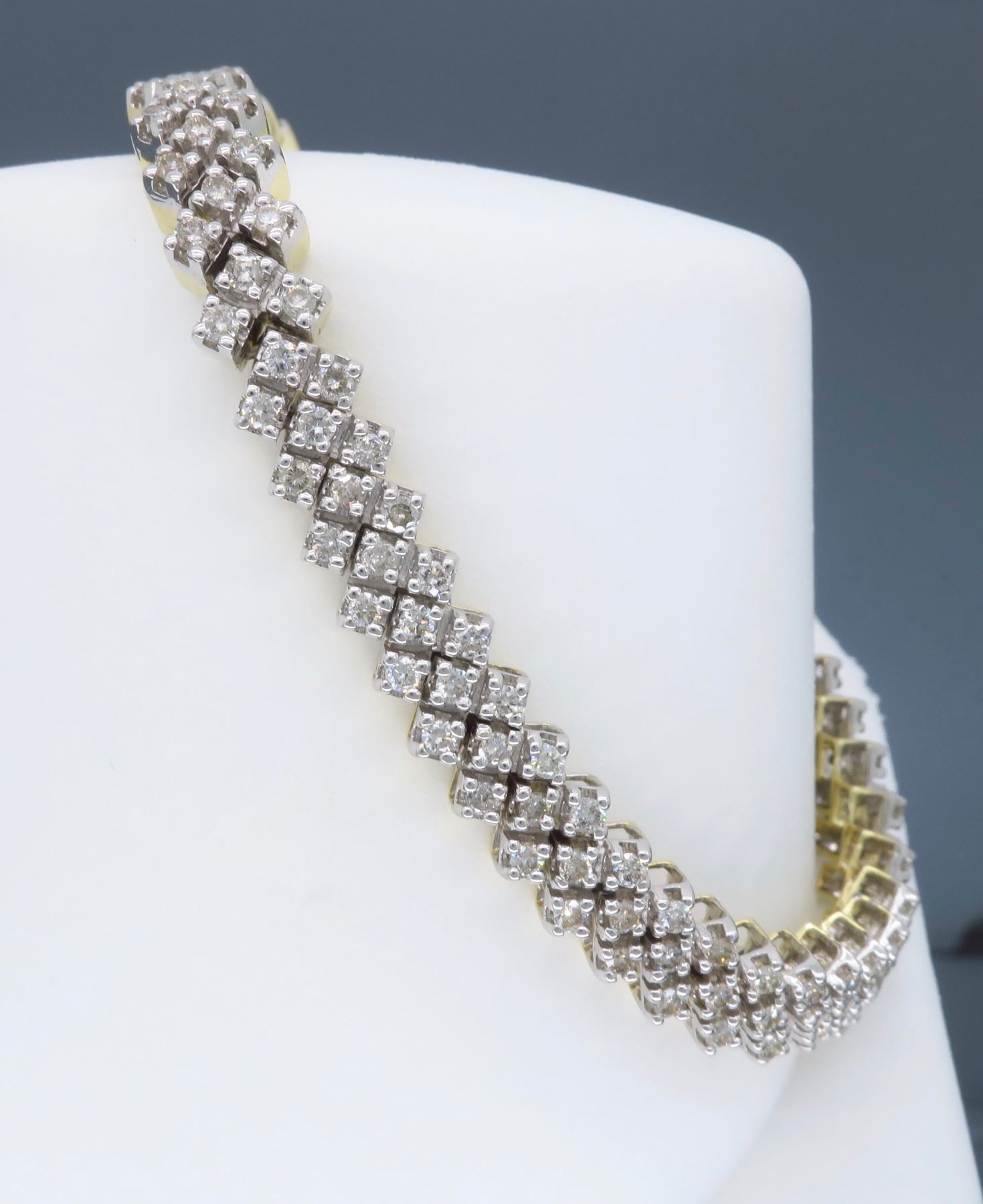One 14KT Two Tone Gold 3.80ctw Diamond Bracelet. Round Diamonds with a total weight of 3.80cts with a color of H-J and clarity of SI-1 to I-1. Total length of this bracelet is 7.25 inches. Total weight of this bracelet is 20.5 grams.