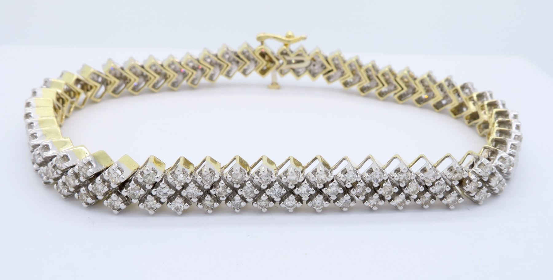One 14KT Two Tone Gold 3.80ctw Diamond Bracelet. Round Diamonds with a total weight of 3.80cts with a color of H-J and clarity of SI-1 to I-1. Total length of this bracelet is 7.25 inches. Total weight of this bracelet is 20.5 grams.