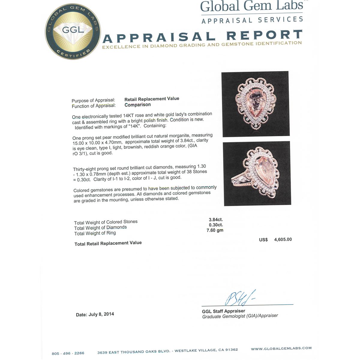 One electronically tested 14KT rose and white gold Ladies combination cast & assembled ring with a bright polish finish. Condition is new. Identified with markings of "14K". Containing: One prong set pear modified brilliant cut natural morganite, measuring 15.00 x 10.00 x 4.70mm, approximate. Total Weight of 3.84ct., clarity is eye clean, type I, light, brownish, reddish orange color, (GIA rO 3/1), cut is good. Thirty-Eight prong set round brilliant cut diamonds, measuring 1.30 - 1.30 x 0.78mm (depth est.) approximate. Total Weight of 38 Stones = 0.30ct. Clarity: I-1 to I-2. Color: I - J, Cut is Good. Colored gemstones are presumed to have been subjected to commonly used enhancement processes. All diamonds and colored gemstones are graded in the mounting, unless otherwise stated. Total Weight of Colored Stones 3.84ct. Total Weight of Diamonds 0.30ct. Total Weight of Ring 7.60 grams. GGL Appraised at $4,605.00.