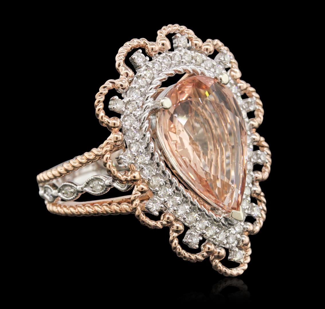 One electronically tested 14KT rose and white gold Ladies combination cast & assembled ring with a bright polish finish. Condition is new. Identified with markings of "14K". Containing: One prong set pear modified brilliant cut natural morganite, measuring 15.00 x 10.00 x 4.70mm, approximate. Total Weight of 3.84ct., clarity is eye clean, type I, light, brownish, reddish orange color, (GIA rO 3/1), cut is good. Thirty-Eight prong set round brilliant cut diamonds, measuring 1.30 - 1.30 x 0.78mm (depth est.) approximate. Total Weight of 38 Stones = 0.30ct. Clarity: I-1 to I-2. Color: I - J, Cut is Good. Colored gemstones are presumed to have been subjected to commonly used enhancement processes. All diamonds and colored gemstones are graded in the mounting, unless otherwise stated. Total Weight of Colored Stones 3.84ct. Total Weight of Diamonds 0.30ct. Total Weight of Ring 7.60 grams. GGL Appraised at $4,605.00.