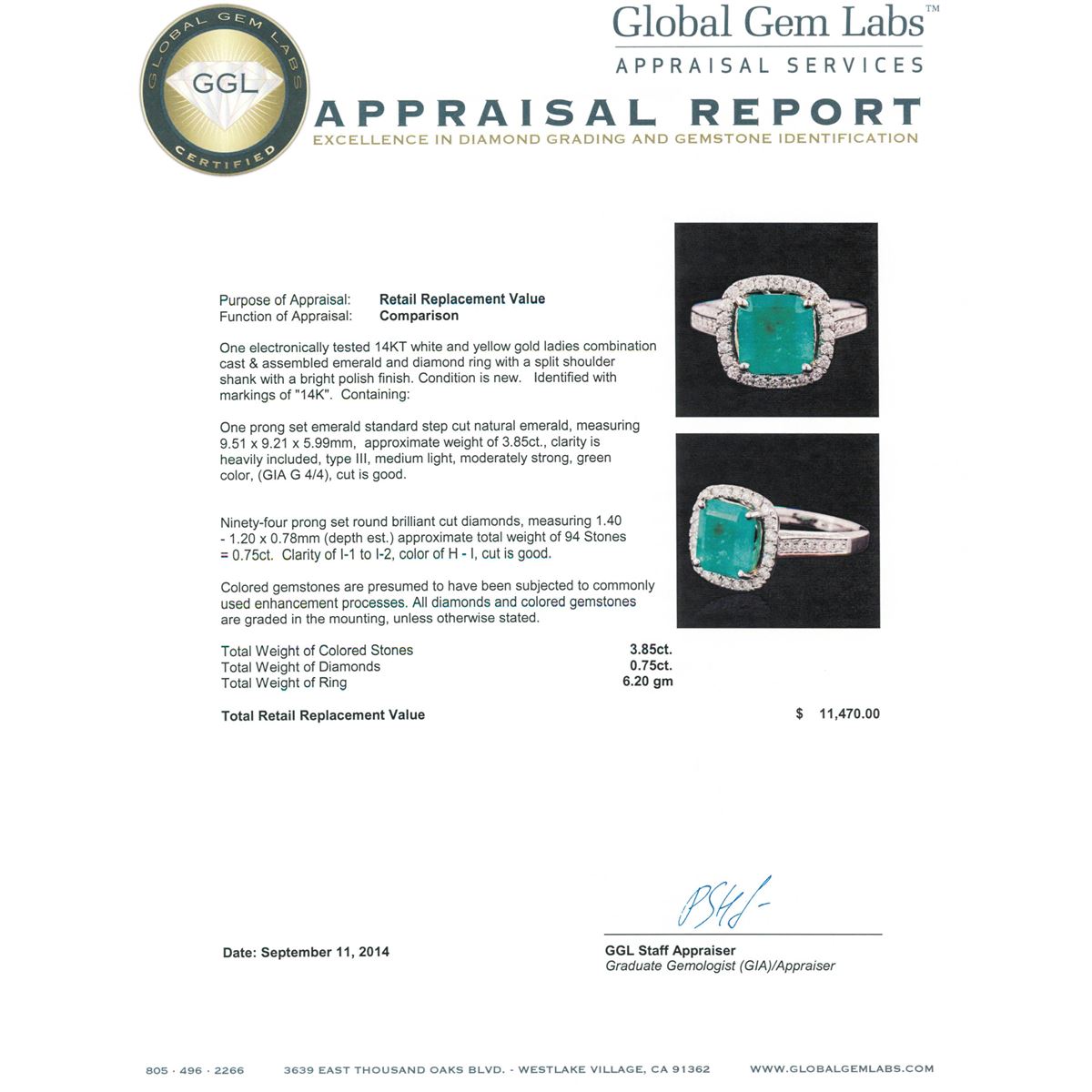 One electronically tested 14KT white and yellow gold ladies combination cast & assembled emerald and diamond ring with a split shoulder shank with a bright polish finish. Identified with markings of "14K". Condition is new. Containing: One prong set emerald standard step cut natural emerald, measuring 9.51 x 9.21 x 5.99mm, approximate weight of 3.85ct., clarity is heavily included, type III, medium light, moderately strong, green color, (GIA G 4/4), cut is good. Ninety-Four prong set round brilliant cut diamonds, measuring 1.40 - 1.20 x 0.78mm (depth est.) approximate total weight of 94 Stones = 0.75ct. . Clarity: I-1 to I-2. Color: H - I, Cut is Good. Colored gemstones are presumed to have been subjected to commonly used enhancement processes. All diamonds and colored gemstones are graded in the mounting, unless otherwise stated.. Total Weight of Colored Stones 3.85ct.. Total Weight of Diamonds 0.75ct.. Total Weight of Ring 6.20 grams. GGL Appraised at $11,470.00.