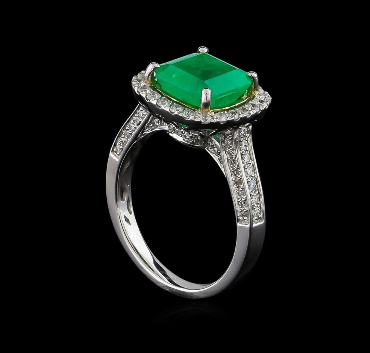 One electronically tested 14KT white and yellow gold ladies combination cast & assembled emerald and diamond ring with a split shoulder shank with a bright polish finish. Identified with markings of "14K". Condition is new. Containing: One prong set emerald standard step cut natural emerald, measuring 9.51 x 9.21 x 5.99mm, approximate weight of 3.85ct., clarity is heavily included, type III, medium light, moderately strong, green color, (GIA G 4/4), cut is good. Ninety-Four prong set round brilliant cut diamonds, measuring 1.40 - 1.20 x 0.78mm (depth est.) approximate total weight of 94 Stones = 0.75ct. . Clarity: I-1 to I-2. Color: H - I, Cut is Good. Colored gemstones are presumed to have been subjected to commonly used enhancement processes. All diamonds and colored gemstones are graded in the mounting, unless otherwise stated.. Total Weight of Colored Stones 3.85ct.. Total Weight of Diamonds 0.75ct.. Total Weight of Ring 6.20 grams. GGL Appraised.