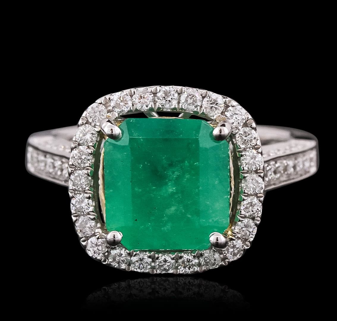 One electronically tested 14KT white and yellow gold ladies combination cast & assembled emerald and diamond ring with a split shoulder shank with a bright polish finish. Identified with markings of "14K". Condition is new. Containing: One prong set emerald standard step cut natural emerald, measuring 9.51 x 9.21 x 5.99mm, approximate weight of 3.85ct., clarity is heavily included, type III, medium light, moderately strong, green color, (GIA G 4/4), cut is good. Ninety-Four prong set round brilliant cut diamonds, measuring 1.40 - 1.20 x 0.78mm (depth est.) approximate total weight of 94 Stones = 0.75ct. . Clarity: I-1 to I-2. Color: H - I, Cut is Good. Colored gemstones are presumed to have been subjected to commonly used enhancement processes. All diamonds and colored gemstones are graded in the mounting, unless otherwise stated.. Total Weight of Colored Stones 3.85ct.. Total Weight of Diamonds 0.75ct.. Total Weight of Ring 6.20 grams. GGL Appraised at $11,470.00.