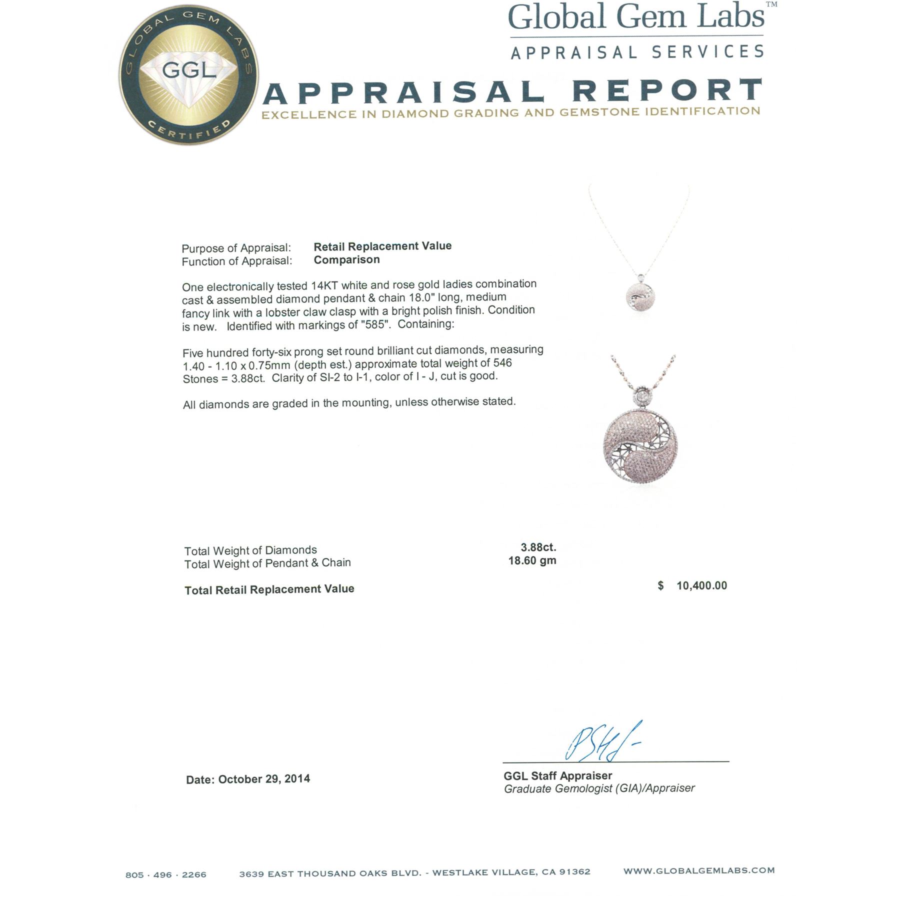 One electronically tested 14KT white and rose gold ladies combination cast & assembled diamond pendant & chain 18.0 long, medium fancy link with a lobster claw clasp with a bright polish finish. Identified with markings of 585. Condition is new. Containing: Five Hundred Forty-Six prong set round brilliant cut diamonds, measuring 1.40 - 1.10 x 0.75mm (depth est.) approximate total weight of 546 Stones = 3.88ct. Clarity: SI-2 to I-1. Color: I - J, Cut is Good. All diamonds are graded in the mounting, unless otherwise stated. Total Weight of Diamonds 3.88ct. Total Weight of Pendant & Chain 18.60 grams. GGL Appraised at $10,400.00.
