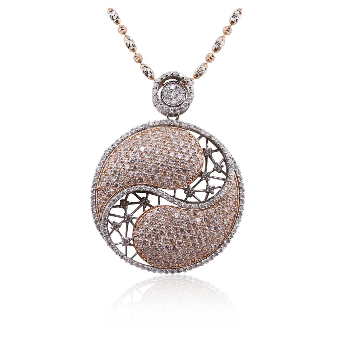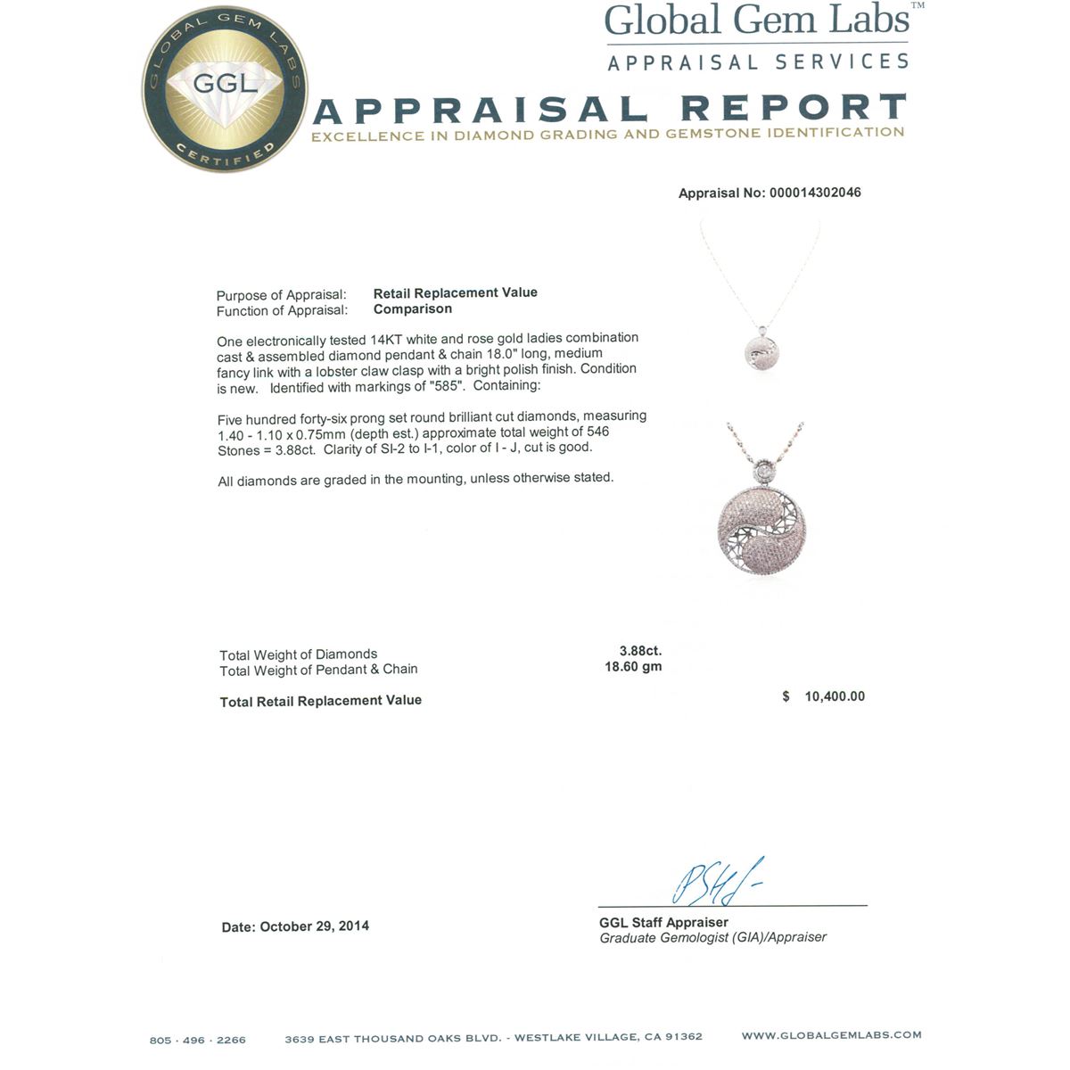 One electronically tested 14KT white and rose gold ladies combination cast & assembled diamond pendant & chain 18.0 long, medium fancy link with a lobster claw clasp with a bright polish finish. Identified with markings of 585. Condition is new. Containing: Five Hundred Forty-Six prong set round brilliant cut diamonds, measuring 1.40 - 1.10 x 0.75mm (depth est.) approximate total weight of 546 Stones = 3.88ct. Clarity: SI-2 to I-1. Color: I - J, Cut is Good. All diamonds are graded in the mounting, unless otherwise stated. Total Weight of Diamonds 3.88ct. Total Weight of Pendant & Chain 18.60 grams. GGL Appraised at $10,400.00.
