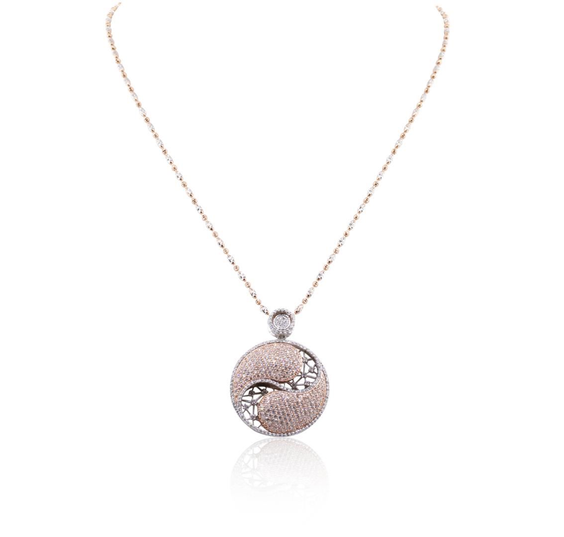 One electronically tested 14KT white and rose gold ladies combination cast & assembled diamond pendant & chain 18.0 long, medium fancy link with a lobster claw clasp with a bright polish finish. Identified with markings of 585. Condition is new. Containing: Five Hundred Forty-Six prong set round brilliant cut diamonds, measuring 1.40 - 1.10 x 0.75mm (depth est.) approximate total weight of 546 Stones = 3.88ct. Clarity: SI-2 to I-1. Color: I - J, Cut is Good. All diamonds are graded in the mounting, unless otherwise stated. Total Weight of Diamonds 3.88ct. Total Weight of Pendant & Chain 18.60 grams. GGL Appraised at $10,400.00.