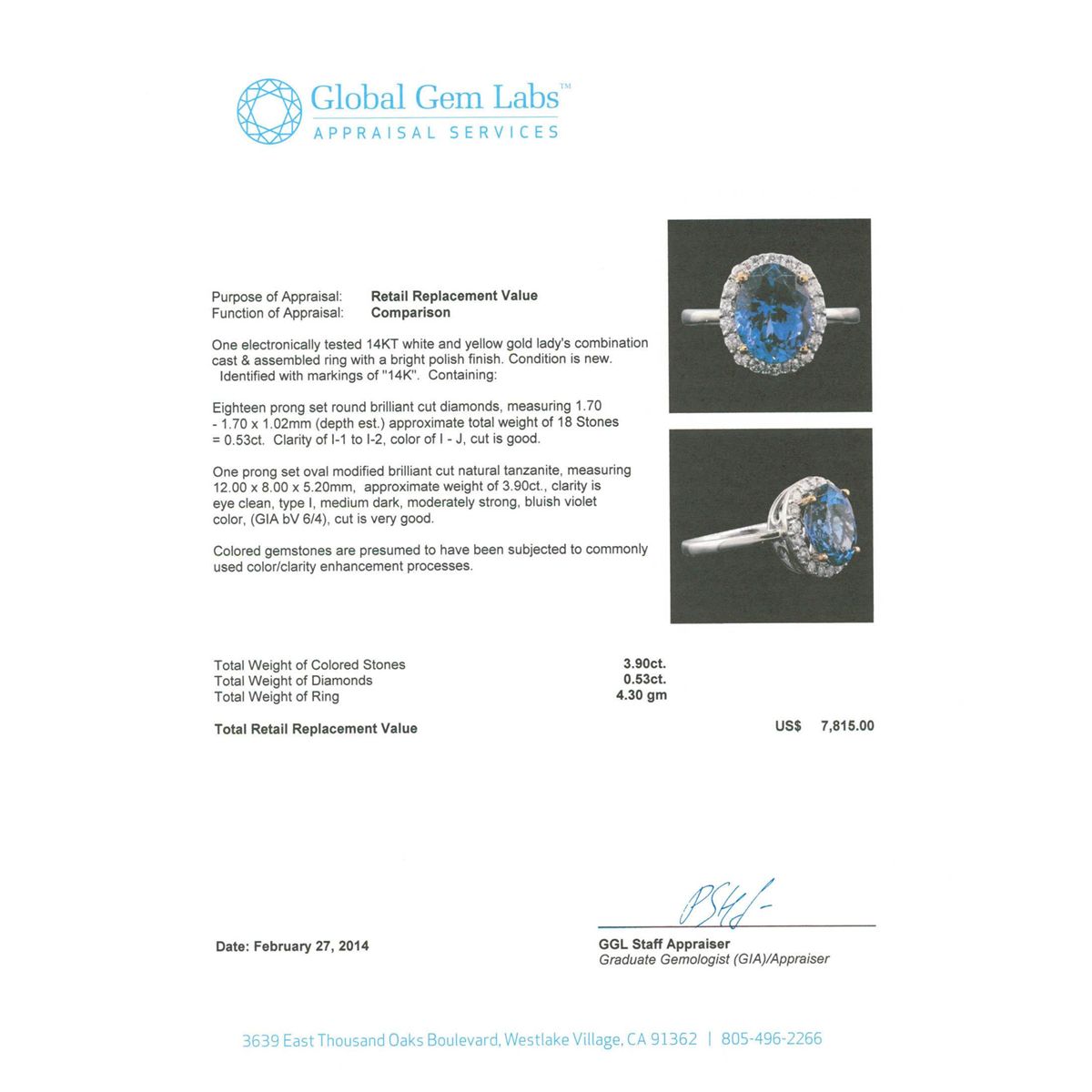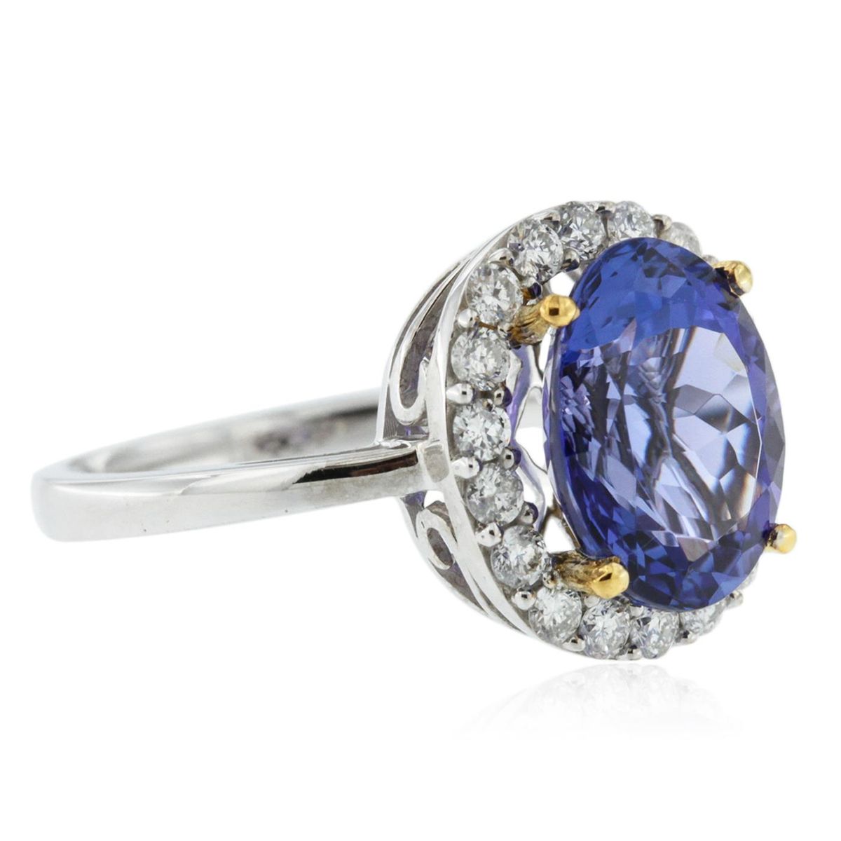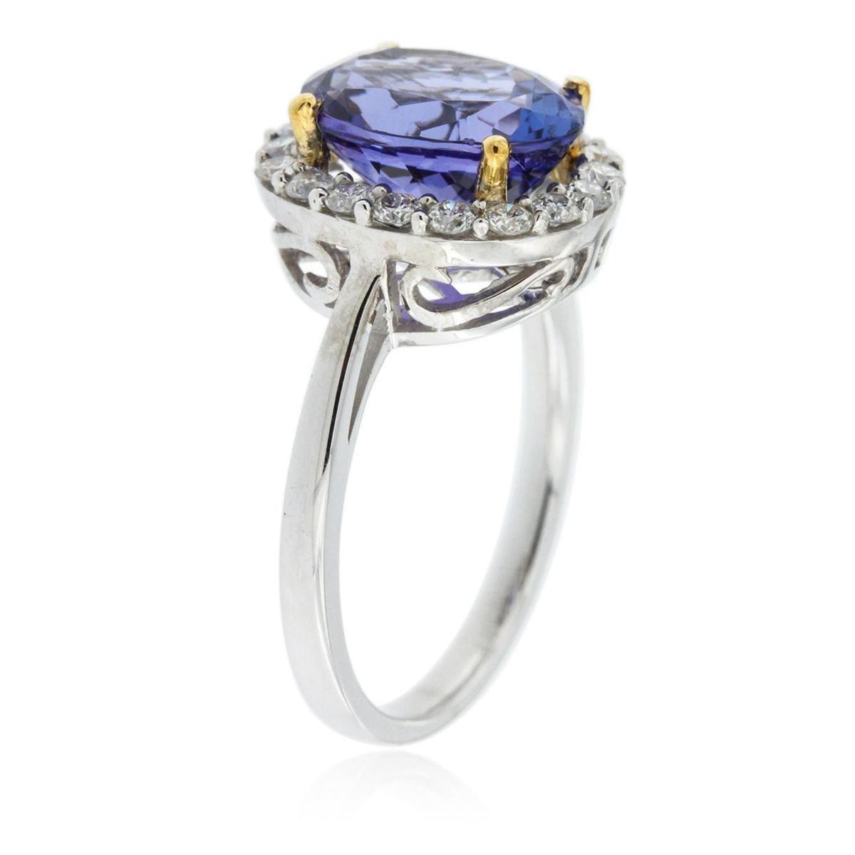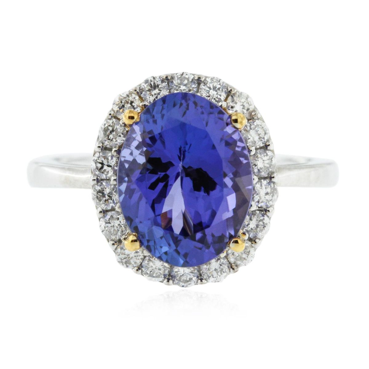 One electronically tested 14KT white and yellow gold Ladies combination cast & assembled ring with a bright polish finish. Condition is new. Identified with markings of "14K". Containing: Eighteen prong set round brilliant cut diamonds, measuring 1.70 - 1.70 x 1.02mm (depth est.) approximate. Total Weight of 18 Stones = 0.53ct. Clarity: I-1 to I-2. Color: I - J, Cut is Good. One prong set oval modified brilliant cut natural tanzanite, measuring 12.00 x 8.00 x 5.20mm, approximate weight of 3.90ct., clarity is eye clean, type I, medium dark, moderately strong, bluish violet color, (GIA bV 6/4), cut is very good. Colored gemstones are presumed to have been subjected to commonly used color/clarity enhancement processes. Total Weight of Colored Stones 3.90ct. Total Weight of Diamonds 0.53ct. Total Weight of Ring 4.30 grams. GGL Appraised at $7,815.00.