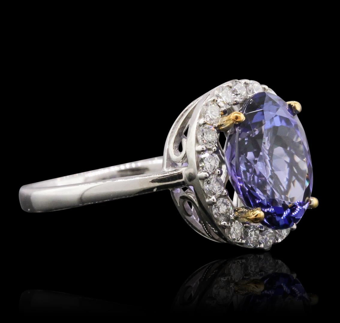 One electronically tested 14KT white and yellow gold Ladies combination cast & assembled ring with a bright polish finish. Condition is new. Identified with markings of "14K". Containing: Eighteen prong set round brilliant cut diamonds, measuring 1.70 - 1.70 x 1.02mm (depth est.) approximate. Total Weight of 18 Stones = 0.53ct. Clarity: I-1 to I-2. Color: I - J, Cut is Good. One prong set oval modified brilliant cut natural tanzanite, measuring 12.00 x 8.00 x 5.20mm, approximate weight of 3.90ct., clarity is eye clean, type I, medium dark, moderately strong, bluish violet color, (GIA bV 6/4), cut is very good. Colored gemstones are presumed to have been subjected to commonly used color/clarity enhancement processes. Total Weight of Colored Stones 3.90ct. Total Weight of Diamonds 0.53ct. Total Weight of Ring 4.30 grams. GGL Appraised at $7,815.00.