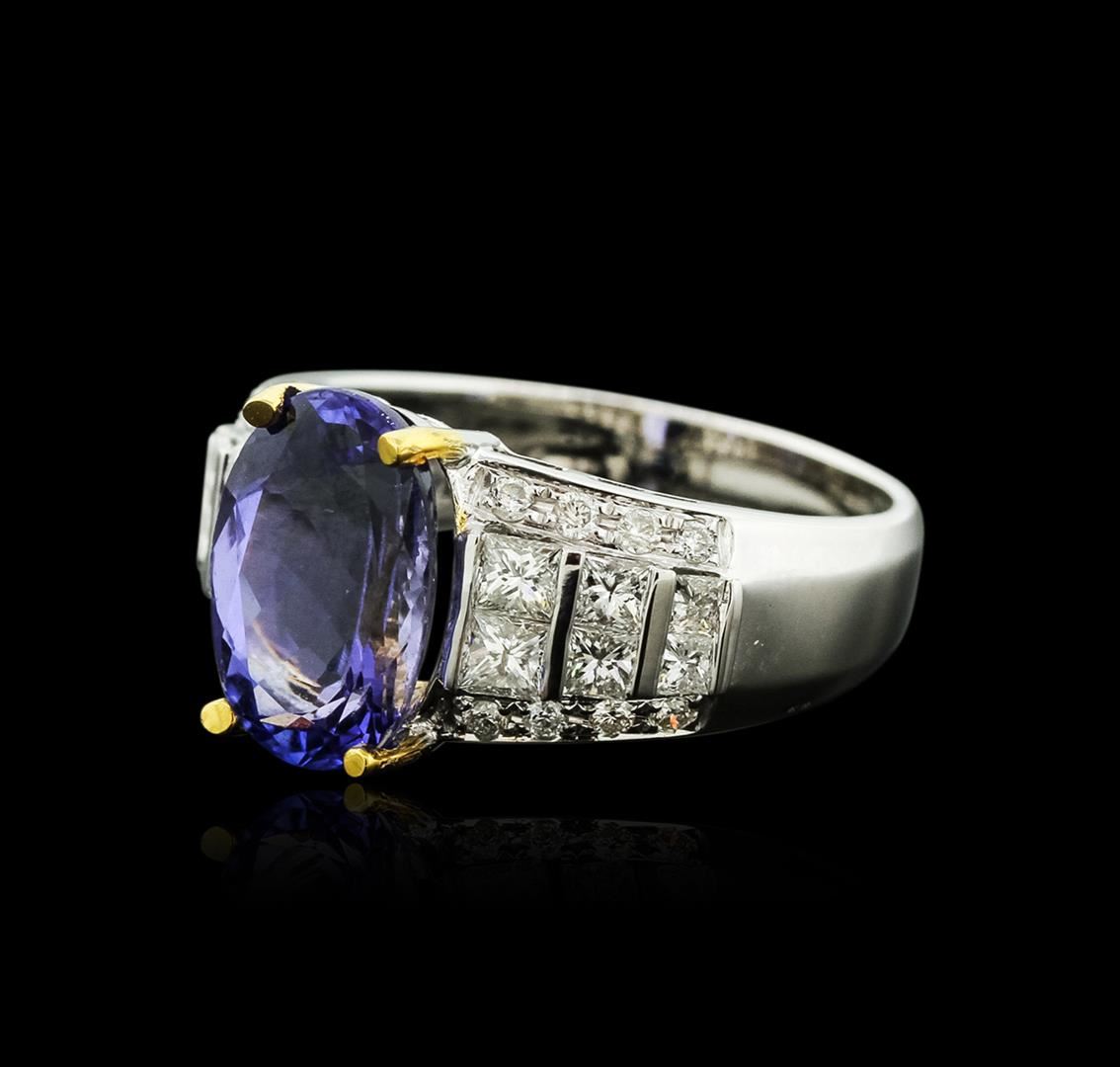 One electronically tested 14KT white and yellow gold ladies cast tanzanite and diamond ring with a bright polish finish. Identified with markings of "14K". Condition is new. Containing: One prong set oval modified brilliant cut natural tanzanite, measuring 11.50 x 7.80 x 6.20mm, approximate weight of 3.91ct., clarity is eye clean, type I, medium, moderately strong, violet color, (GIA V 5/4), cut is good. Sixteen prong set round brilliant cut diamonds, measuring 1.20 - 1.20 x 0.72mm (depth est.) approximate total weight of 16 Stones = 0.10ct. Clarity: SI-2 to I-1. Color: I - J, Cut is Good. Twelve channel set princess cut diamonds, measuring 2.50 x 2.50 x 1.88mm (depth est.) approximate total weight of 12 Stones = 1.16ct. Clarity: SI-1 to SI-2. Color: I - J, Cut is Good. Colored gemstones are presumed to have been subjected to commonly used enhancement processes. All diamonds and colored gemstones are graded in the mounting, unless otherwise stated. Total Weight of Colored Stones 3.91ct. Total Weight of Diamonds 1.26ct. Total Weight of Ring 5.80 grams. GGL Appraised at $5,325.00.