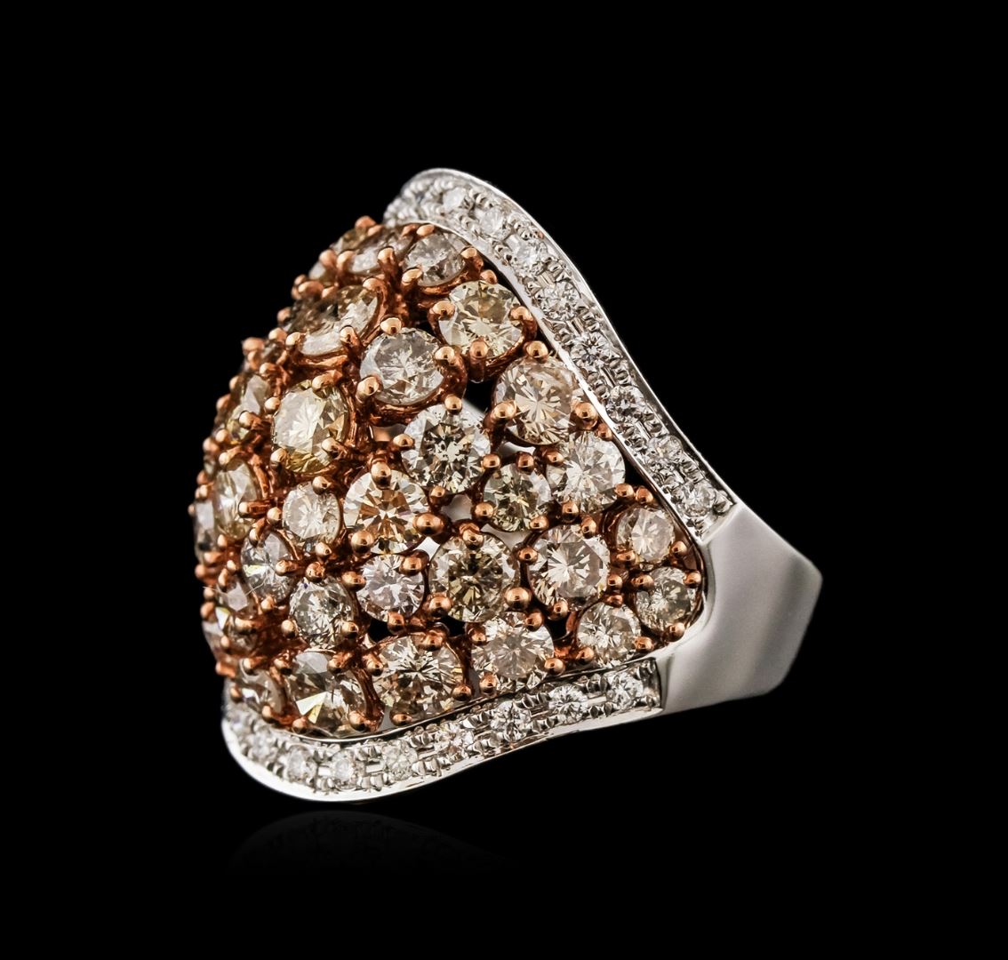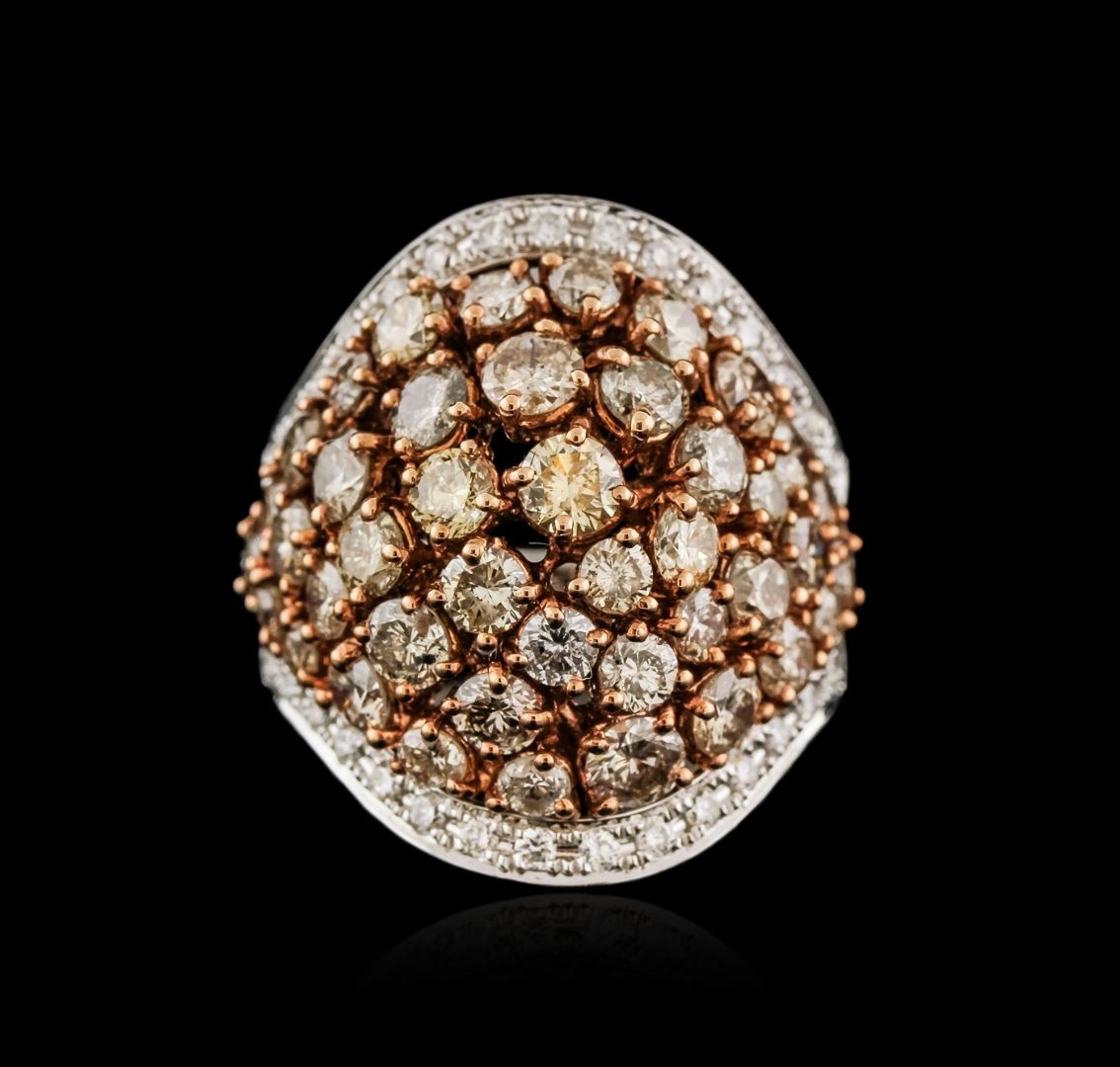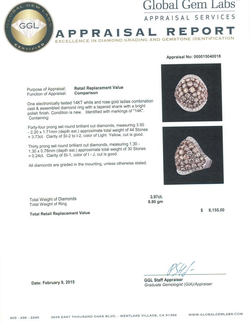 One electronically tested 14KT white and rose gold ladies combination cast & assembled diamond ring with a tapered shank with a bright polish finish. Identified with markings of "14K". Condition is new. Containing: Forty-Four prong set round brilliant cut diamonds, measuring 3.50 - 2.20 x 1.71mm (depth est.) approximate total weight of 44 Stones = 3.73ct. Clarity: SI-2 to I-2, Color of Light Yellow, Cut is Good. Thirty prong set round brilliant cut diamonds, measuring 1.30 - 1.30 x 0.78mm (depth est.) approximate total weight of 30 Stones = 0.24ct. Clarity: SI-1. Color: I - J, Cut is Good. All diamonds are graded in the mounting, unless otherwise stated. Total Weight of Diamonds 3.97ct. Total Weight of Ring 8.80 grams. GGL Appraised at $8,155.00.
