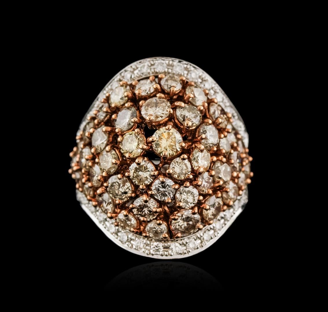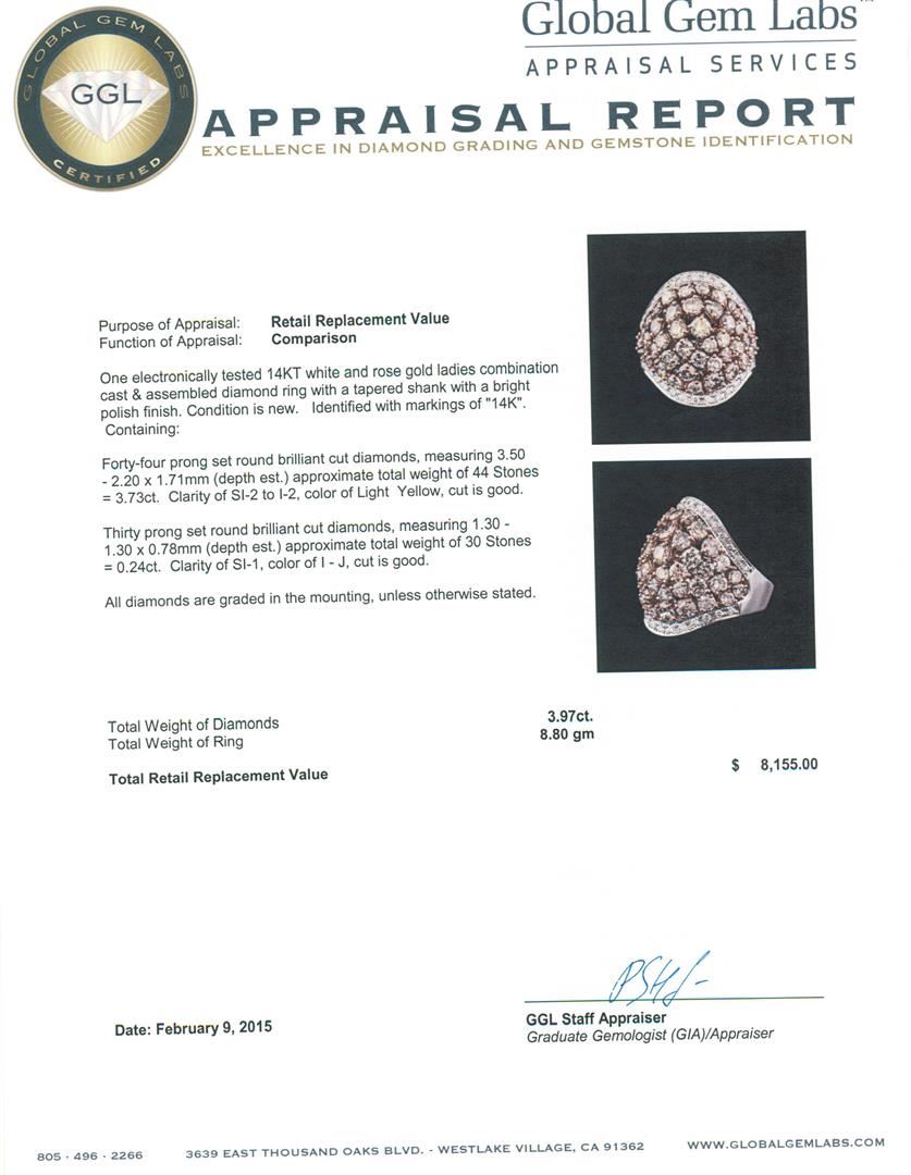 One electronically tested 14KT white and rose gold ladies combination cast & assembled diamond ring with a tapered shank with a bright polish finish. Identified with markings of "14K". Condition is new. Containing: Forty-Four prong set round brilliant cut diamonds, measuring 3.50 - 2.20 x 1.71mm (depth est.) approximate total weight of 44 Stones = 3.73ct. Clarity: SI-2 to I-2, Color of Light Yellow, Cut is Good. Thirty prong set round brilliant cut diamonds, measuring 1.30 - 1.30 x 0.78mm (depth est.) approximate total weight of 30 Stones = 0.24ct. Clarity: SI-1. Color: I - J, Cut is Good. All diamonds are graded in the mounting, unless otherwise stated. Total Weight of Diamonds 3.97ct. Total Weight of Ring 8.80 grams. GGL Appraised at $8,155.00.