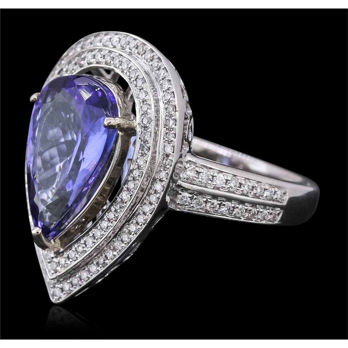 One electronically tested 14KT white and yellow gold ladies combination cast & assembled tanzanite and diamond ring with a flat shank with a bright polish finish. Identified with markings of "14K". Condition is new. Containing: One prong set pear modified brilliant cut natural tanzanite, measuring 12.50 x 8.90 x 5.43mm, approximate weight of 4.05ct., clarity is eye clean, type I, medium, moderately strong, violetish blue color, (GIA vB 5/4), cut is good. One Hundred Thirty-Two prong set round brilliant cut diamonds, measuring 1.00 - 1.00 x 0.60mm (depth est.) approximate total weight of 132 Stones = 0.48ct. Clarity: I-1 to I-2. Color: I - J, Cut is Good. Colored gemstones are presumed to have been subjected to commonly used enhancement processes. All diamonds and colored gemstones are graded in the mounting, unless otherwise stated. Total Weight of Colored Stones 4.05ct. Total Weight of Diamonds 0.48ct. Total Weight of Ring 8.20 grams. GGL Appraised at $8,830.00.