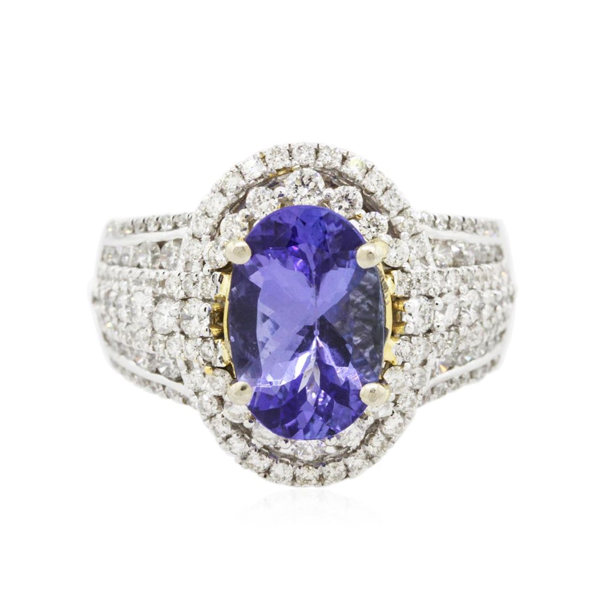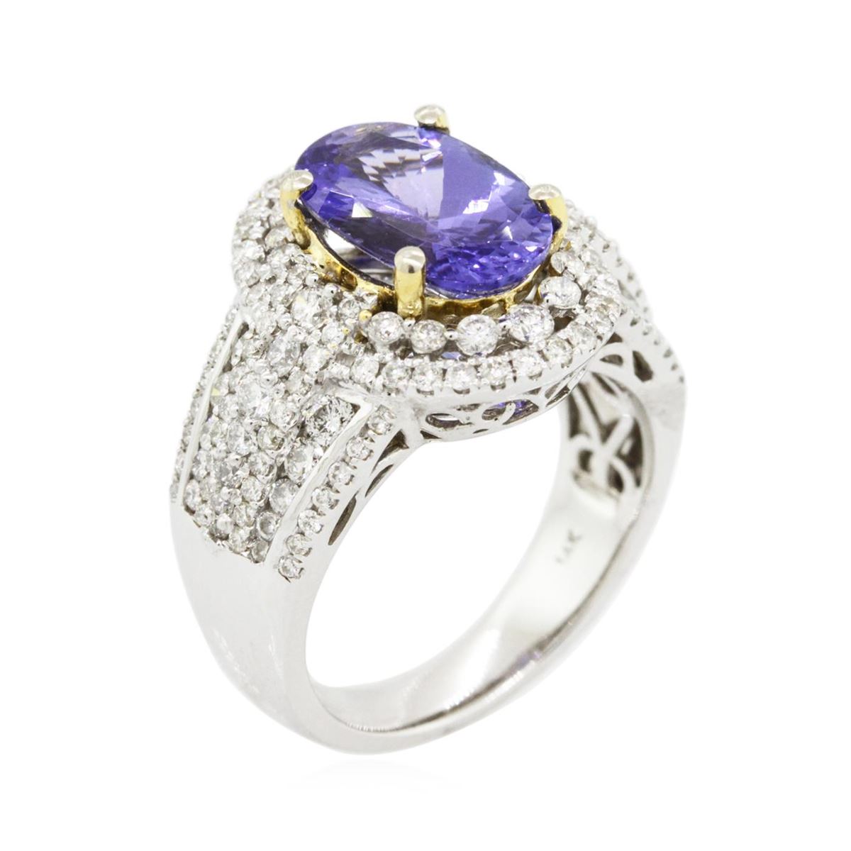 One electronically tested 14KT white and yellow gold ladies combination cast & assembled tanzanite and diamond ring with a tapered shank with a bright polish finish. Identified with markings of "14K". Condition is new. Containing: One prong set oval modified brilliant cut natural tanzanite, measuring 12.26 x 8.00 x 5.99mm, approximate weight of 4.12ct., clarity is eye clean, type I, medium, moderately strong, violet color, (GIA V 5/4), cut is good. Twenty-Eight prong set round brilliant cut diamonds, measuring 1.80 - 1.30 x 0.93mm (depth est.) approximate total weight of 28 Stones = 0.38ct. Clarity: I-1 to I-2. Color: J - K, Cut is Good. Colored gemstones are presumed to have been subjected to commonly used enhancement processes. All diamonds and colored gemstones are graded in the mounting, unless otherwise stated. Total Weight of Colored Stones 4.12ct. Total Weight of Diamonds 0.38ct. Total Weight of Ring 9.90 grams. GGL Appraised at $9,490.00.