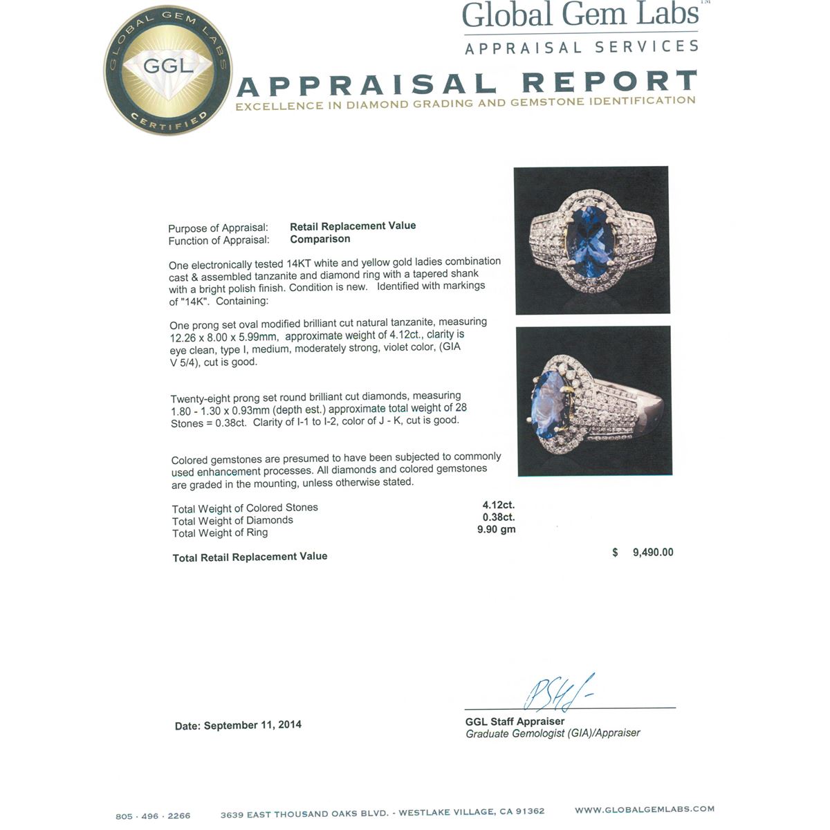 One electronically tested 14KT white and yellow gold ladies combination cast & assembled tanzanite and diamond ring with a tapered shank with a bright polish finish. Identified with markings of "14K". Condition is new. Containing: One prong set oval modified brilliant cut natural tanzanite, measuring 12.26 x 8.00 x 5.99mm, approximate weight of 4.12ct., clarity is eye clean, type I, medium, moderately strong, violet color, (GIA V 5/4), cut is good. Twenty-Eight prong set round brilliant cut diamonds, measuring 1.80 - 1.30 x 0.93mm (depth est.) approximate total weight of 28 Stones = 0.38ct. Clarity: I-1 to I-2. Color: J - K, Cut is Good. Colored gemstones are presumed to have been subjected to commonly used enhancement processes. All diamonds and colored gemstones are graded in the mounting, unless otherwise stated. Total Weight of Colored Stones 4.12ct. Total Weight of Diamonds 0.38ct. Total Weight of Ring 9.90 grams. GGL Appraised at $9,490.00.