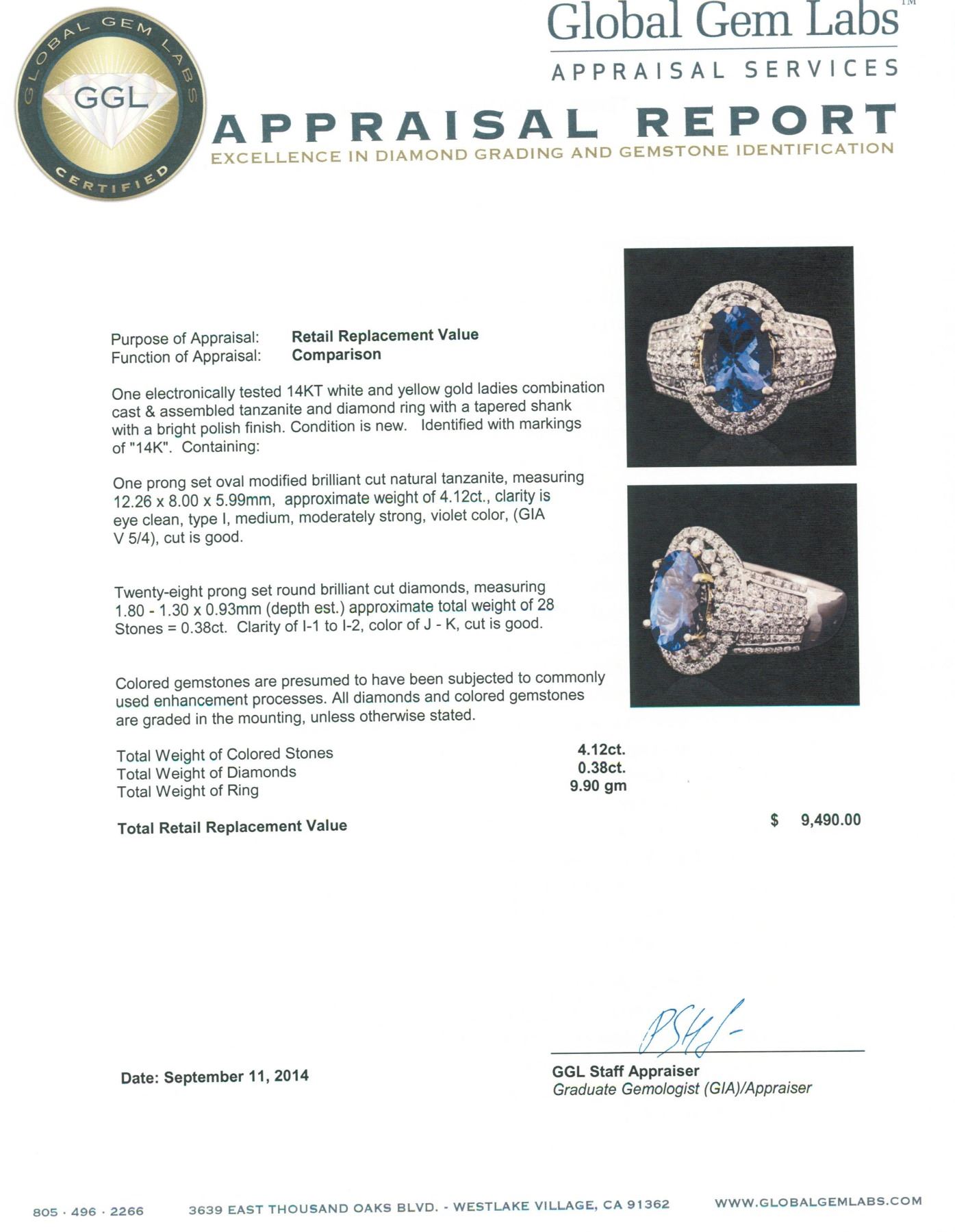 One electronically tested 14KT white and yellow gold ladies combination cast & assembled tanzanite and diamond ring with a tapered shank with a bright polish finish. Identified with markings of "14K". Condition is new. Containing: One prong set oval modified brilliant cut natural tanzanite, measuring 12.26 x 8.00 x 5.99mm, approximate weight of 4.12ct., clarity is eye clean, type I, medium, moderately strong, violet color, (GIA V 5/4), cut is good. Twenty-Eight prong set round brilliant cut diamonds, measuring 1.80 - 1.30 x 0.93mm (depth est.) approximate total weight of 28 Stones = 0.38ct. Clarity: I-1 to I-2. Color: J - K, Cut is Good. Colored gemstones are presumed to have been subjected to commonly used enhancement processes. All diamonds and colored gemstones are graded in the mounting, unless otherwise stated. Total Weight of Colored Stones 4.12ct. Total Weight of Diamonds 0.38ct. Total Weight of Ring 9.90 grams. GGL Appraised.