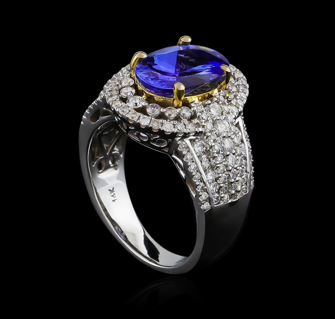 One electronically tested 14KT white and yellow gold ladies combination cast & assembled tanzanite and diamond ring with a tapered shank with a bright polish finish. Identified with markings of "14K". Condition is new. Containing: One prong set oval modified brilliant cut natural tanzanite, measuring 12.26 x 8.00 x 5.99mm, approximate weight of 4.12ct., clarity is eye clean, type I, medium, moderately strong, violet color, (GIA V 5/4), cut is good. Twenty-Eight prong set round brilliant cut diamonds, measuring 1.80 - 1.30 x 0.93mm (depth est.) approximate total weight of 28 Stones = 0.38ct. Clarity: I-1 to I-2. Color: J - K, Cut is Good. Colored gemstones are presumed to have been subjected to commonly used enhancement processes. All diamonds and colored gemstones are graded in the mounting, unless otherwise stated. Total Weight of Colored Stones 4.12ct. Total Weight of Diamonds 0.38ct. Total Weight of Ring 9.90 grams. GGL Appraised.