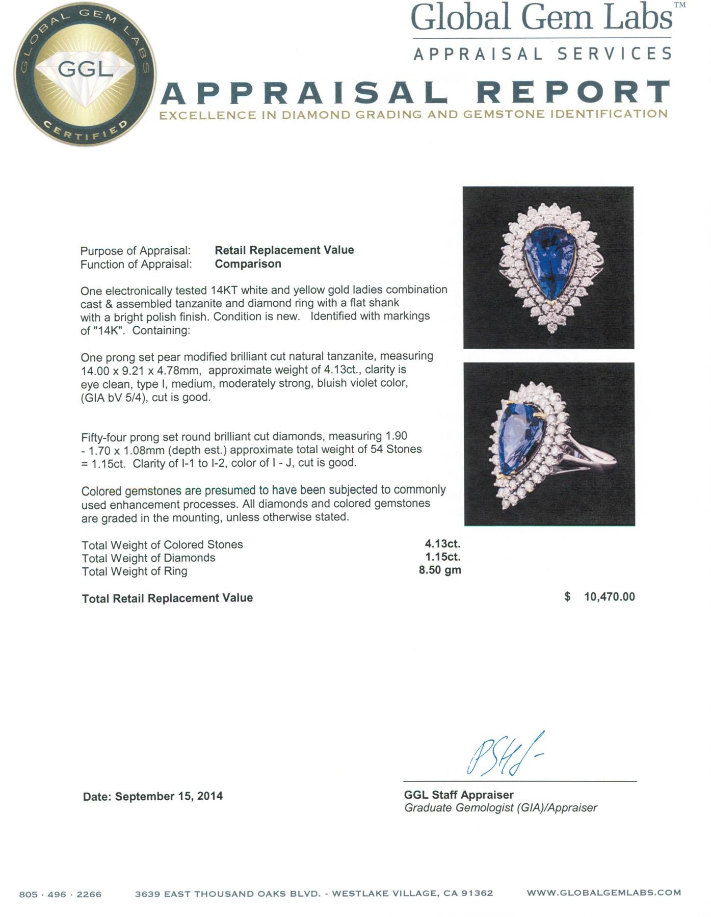 One electronically tested 14KT white and yellow gold ladies combination cast & assembled tanzanite and diamond ring with a flat shank with a bright polish finish. Identified with markings of "14K". Condition is new. Containing: One prong set pear modified brilliant cut natural tanzanite, measuring 14.00 x 9.21 x 4.78mm, approximate weight of 4.13ct., clarity is eye clean, type I, medium, moderately strong, bluish violet color, (GIA bV 5/4), cut is good. Fifty-Four prong set round brilliant cut diamonds, measuring 1.90 - 1.70 x 1.08mm (depth est.) approximate total weight of 54 Stones = 1.15ct. Clarity: I-1 to I-2. Color: I - J, Cut is Good. Colored gemstones are presumed to have been subjected to commonly used enhancement processes. All diamonds and colored gemstones are graded in the mounting, unless otherwise stated total weight of Colored Stones 4.13ct. Total Weight of Diamonds 1.15ct. Total Weight of Ring 8.50 grams. GGL Appraised.