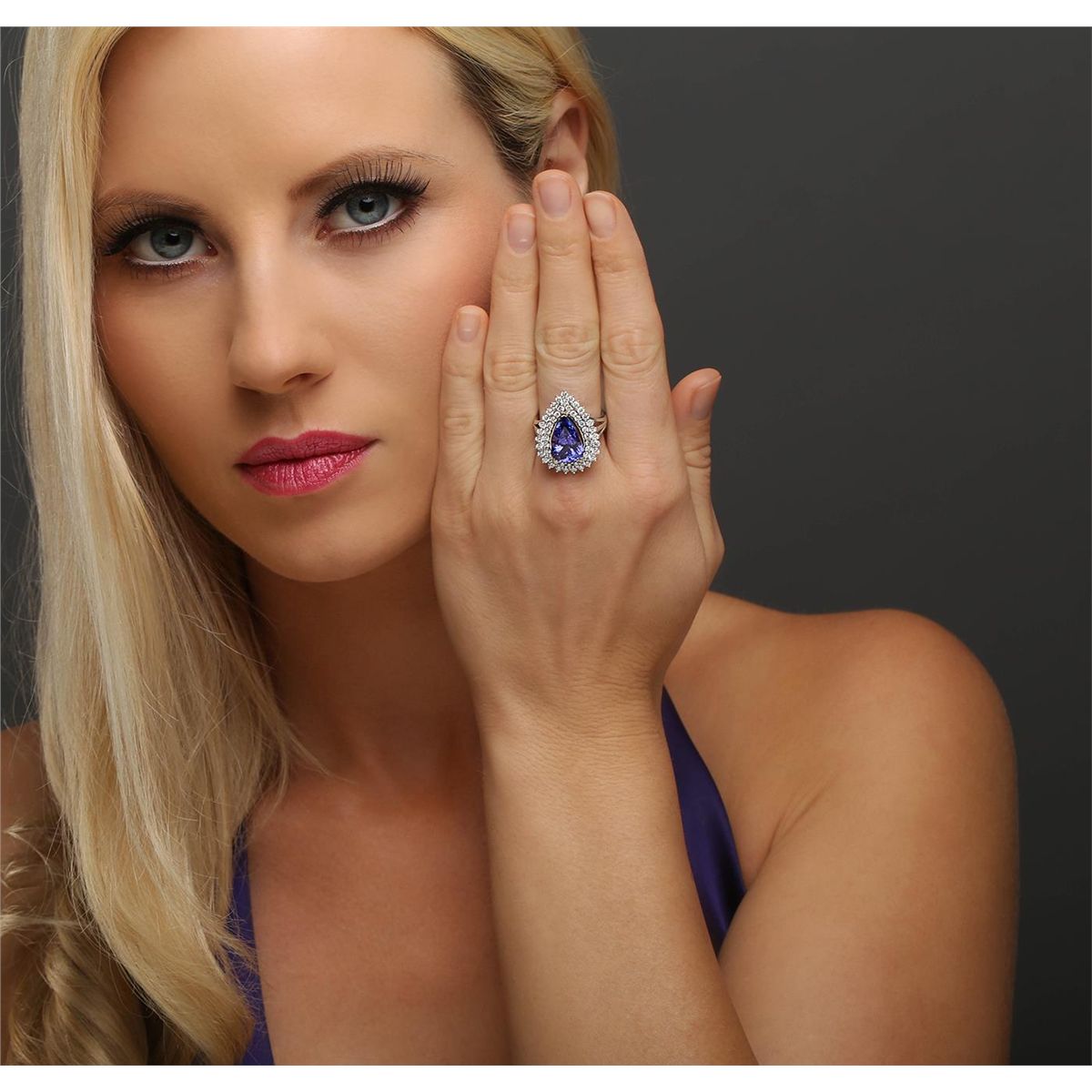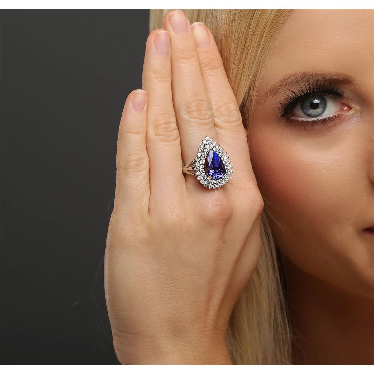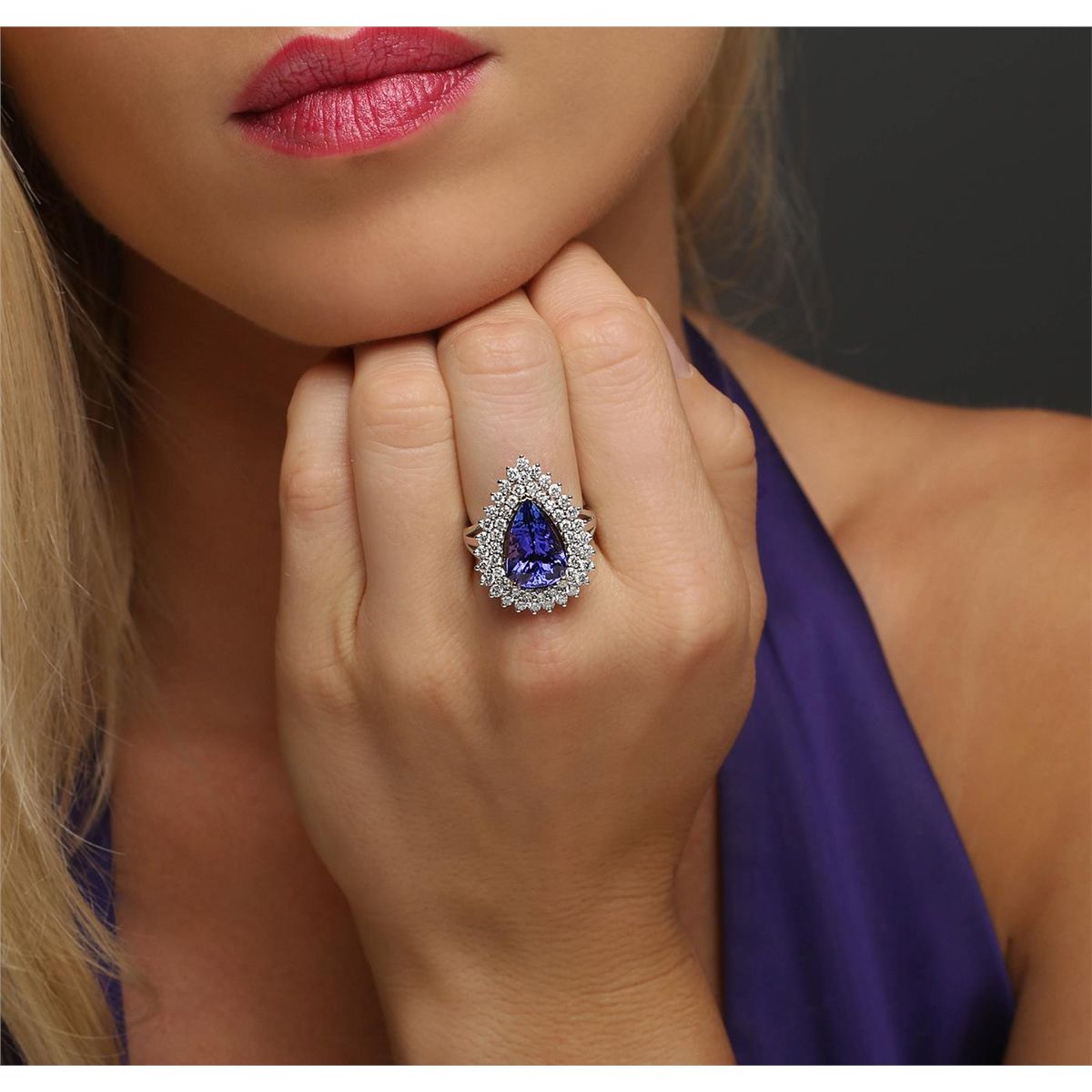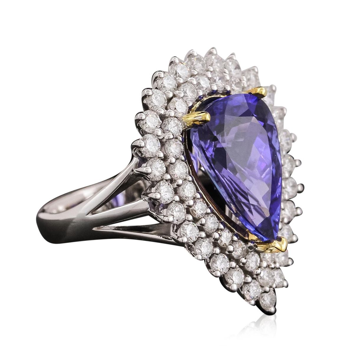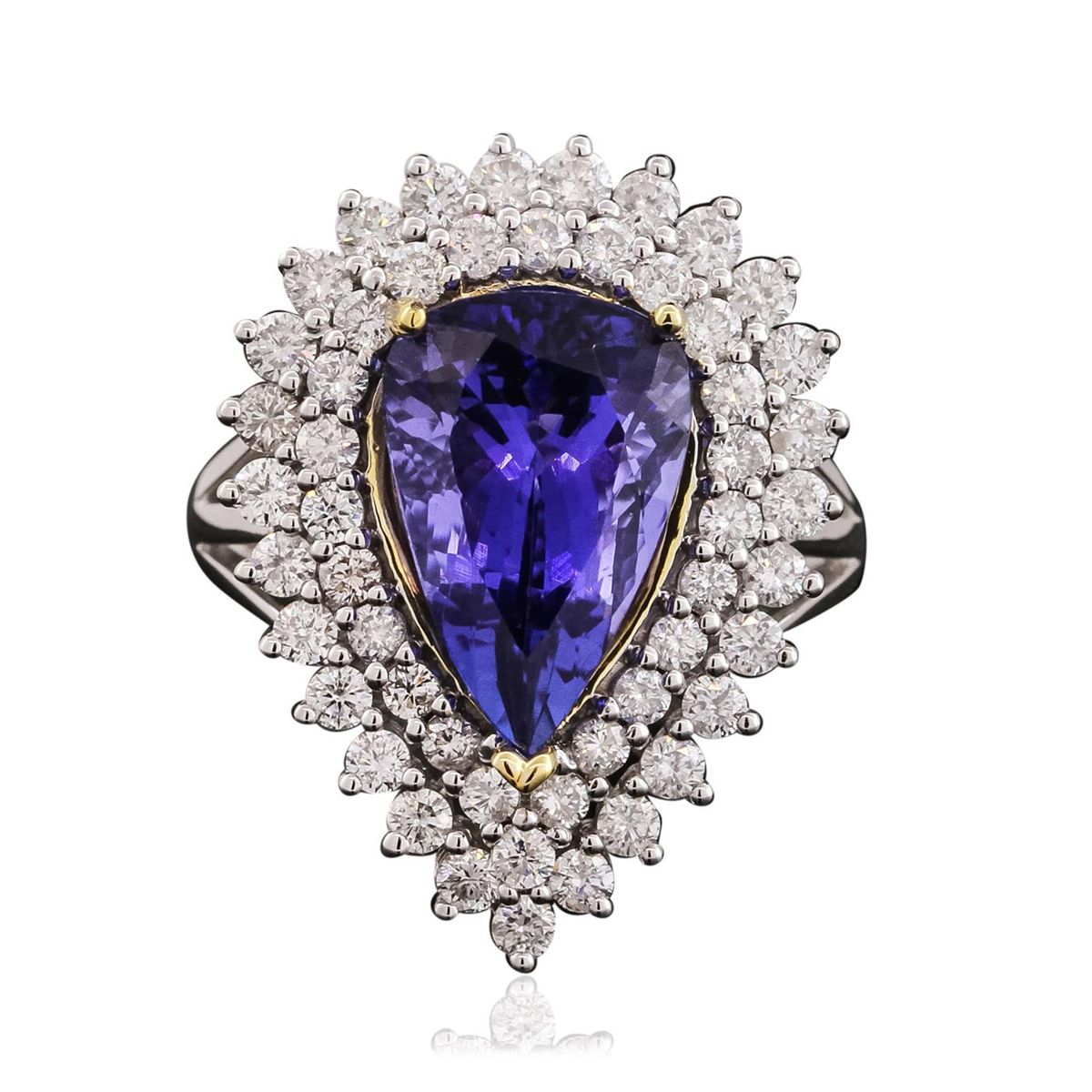 One electronically tested 14KT white and yellow gold ladies combination cast & assembled tanzanite and diamond ring with a flat shank with a bright polish finish. Identified with markings of "14K". Condition is new. Containing: One prong set pear modified brilliant cut natural tanzanite, measuring 14.00 x 9.21 x 4.78mm, approximate weight of 4.13ct., clarity is eye clean, type I, medium, moderately strong, bluish violet color, (GIA bV 5/4), cut is good. Fifty-Four prong set round brilliant cut diamonds, measuring 1.90 - 1.70 x 1.08mm (depth est.) approximate total weight of 54 Stones = 1.15ct. Clarity: I-1 to I-2. Color: I - J, Cut is Good. Colored gemstones are presumed to have been subjected to commonly used enhancement processes. All diamonds and colored gemstones are graded in the mounting, unless otherwise stated total weight of Colored Stones 4.13ct. Total Weight of Diamonds 1.15ct. Total Weight of Ring 8.50 grams. GGL Appraised at $10,470.00.