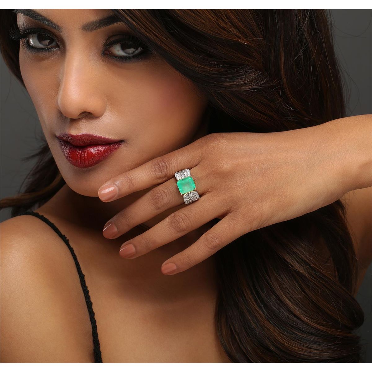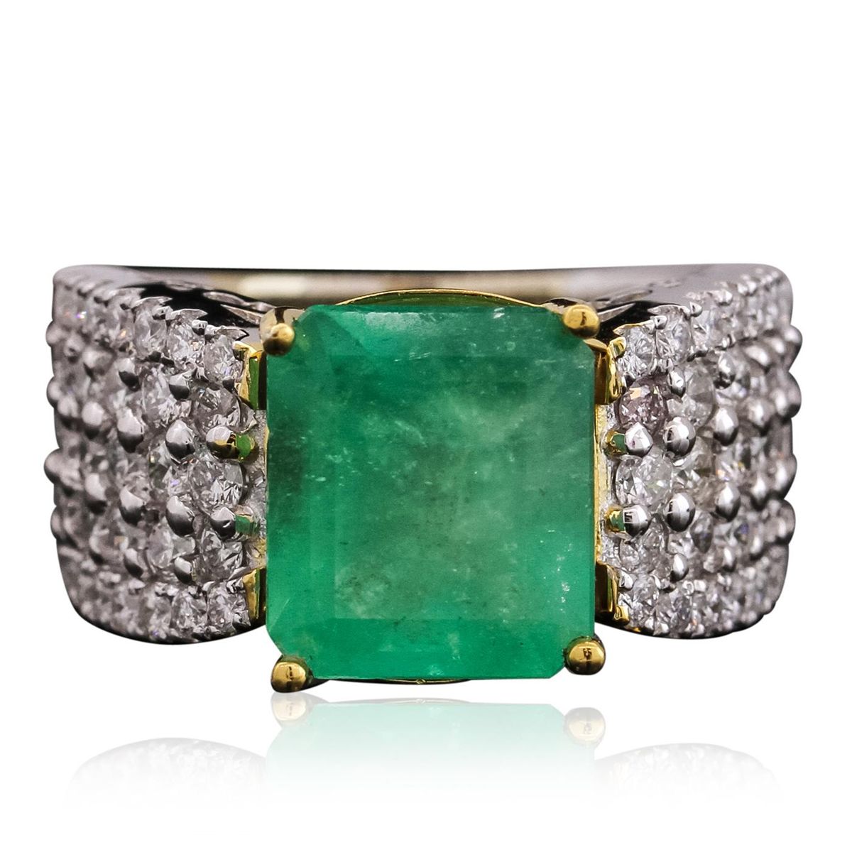 One electronically tested 14KT white and yellow gold ladies combination cast & assembled emerald and diamond ring with a tapered shank with a bright polish finish. Identified with markings of "14K". Condition is new. Containing: One prong set rectangular cushion modified brilliant cut natural emerald, measuring 10.66 x 9.33 x 6.55mm, approximate weight of 4.16ct., clarity is heavily included, type III, medium light, very slightly grayish, very slightly bluish green color, (GIA vslbG 4/3), cut is good. Thirty prong set round brilliant cut diamonds, measuring 2.00 - 2.00 x 1.20mm (depth est.) approximate total weight of 30 Stones = 0.88ct. Clarity: SI-1 to SI-2. Color: I - J, Cut is Good. Twenty-Eight prong set round brilliant cut diamonds, measuring 1.30 - 1.30 x 0.78mm (depth est.) approximate total weight of 28 Stones = 0.22ct. Clarity: SI-2 to I-1. Color: I - J, Cut is Good. Colored gemstones are presumed to have been subjected to commonly used enhancement processes. All diamonds and colored gemstones are graded in the mounting, unless otherwise stated. Total Weight of Colored Stones 4.16ct. Total Weight of Diamonds 1.10ct. Total Weight of Ring 10.80 grams. GGL Appraised at $14,210.00.