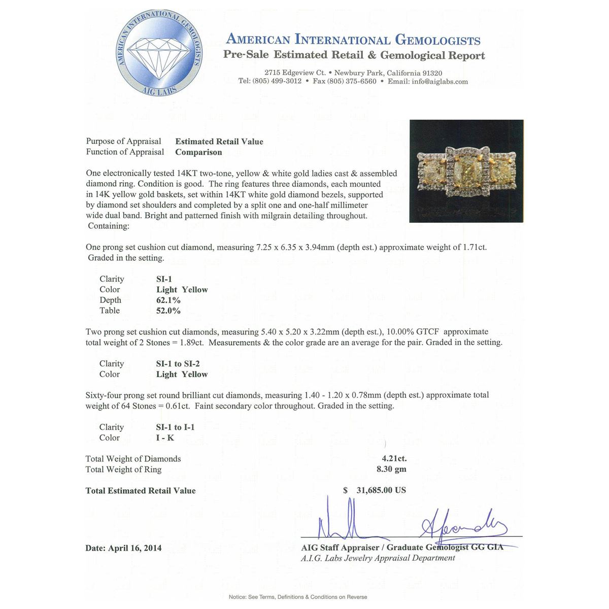 One electronically tested 14KT two-tone, yellow & white gold ladies cast & assembled diamond ring. Condition is good. The ring features three diamonds, each mounted in 14K yellow gold baskets, set within 14KT white gold diamond bezels, supported by diamond set shoulders and completed by a split one and one-half millimeter wide dual band. Bright and patterned finish with milgrain detailing throughout. Containing: One prong set cushion cut diamond, measuring 7.25 x 6.35 x 3.94mm (depth est.) approximate weight of 1.71ct. Graded in the setting. Clarity: SI-1. Depth: 62.1%. Table 52.0%. Two prong set cushion cut diamonds, measuring 5.40 x 5.20 x 3.22mm (depth est.), 10.00.%. GTCF approximate. Total Weight of 2 Stones = 1.89ct. Measurements & the color grade are an average for the pair. Graded in the setting. Clarity: SI-1 to SI-2 Sixty-Four prong set round brilliant cut diamonds, measuring 1.40 - 1.20 x 0.78mm (depth est.) approximate. Total Weight of 64 Stones = 0.61ct. Faint secondary color throughout. Graded in the setting. Clarity: SI-1 to I-1. Color: I - K. Total Weight of Diamonds 4.21ct. Total Weight of Ring 8.30 grams. AIG Appraised at $31,685.00.