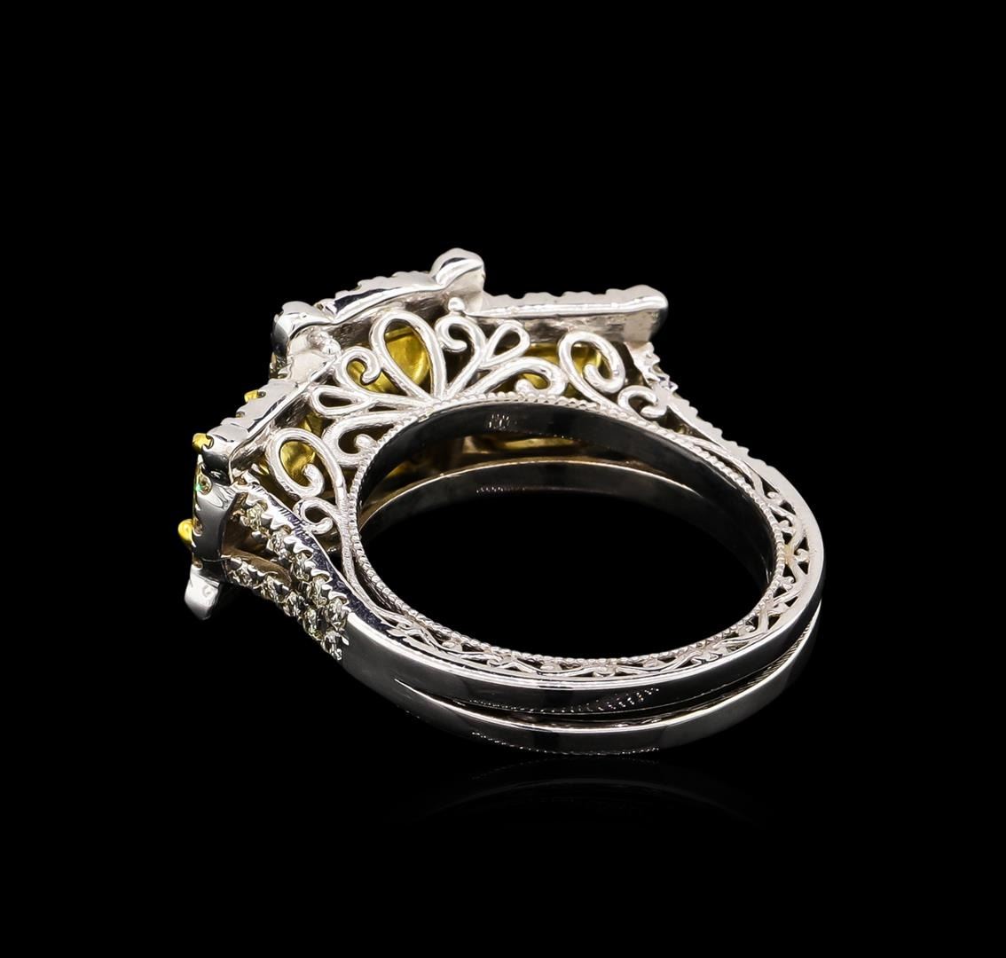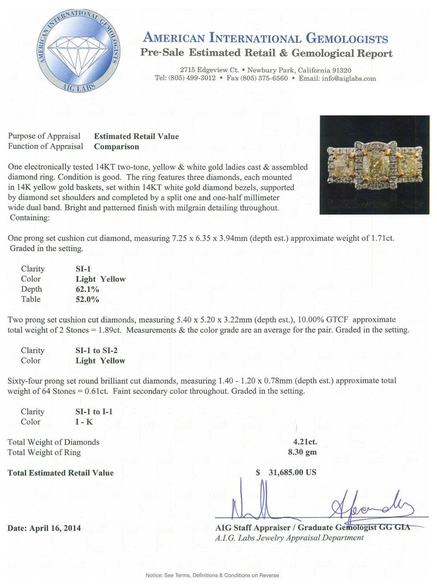 One electronically tested 14KT two-tone, yellow & white gold ladies cast & assembled diamond ring. Condition is good. The ring features three diamonds, each mounted in 14K yellow gold baskets, set within 14KT white gold diamond bezels, supported by diamond set shoulders and completed by a split one and one-half millimeter wide dual band. Bright and patterned finish with milgrain detailing throughout. Containing: One prong set cushion cut diamond, measuring 7.25 x 6.35 x 3.94mm (depth est.) approximate weight of 1.71ct. Graded in the setting. Clarity: SI-1. Depth: 62.1%. Table 52.0%. Two prong set cushion cut diamonds, measuring 5.40 x 5.20 x 3.22mm (depth est.), 10.00.%. GTCF approximate. Total Weight of 2 Stones = 1.89ct. Measurements & the color grade are an average for the pair. Graded in the setting. Clarity: SI-1 to SI-2 Sixty-Four prong set round brilliant cut diamonds, measuring 1.40 - 1.20 x 0.78mm (depth est.) approximate. Total Weight of 64 Stones = 0.61ct. Faint secondary color throughout. Graded in the setting. Clarity: SI-1 to I-1. Color: I - K. Total Weight of Diamonds 4.21ct. Total Weight of Ring 8.30 grams. AIG Appraised at $31,685.00.